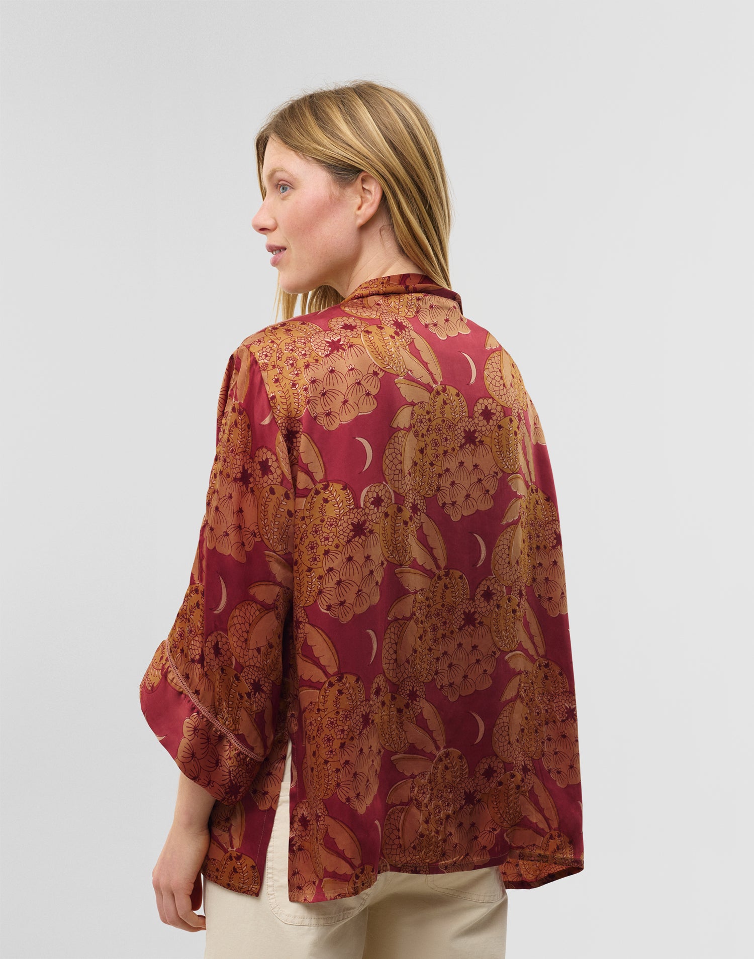 Printed kimono with a satin finish and long sleeves. Lace insert detail and front pockets.