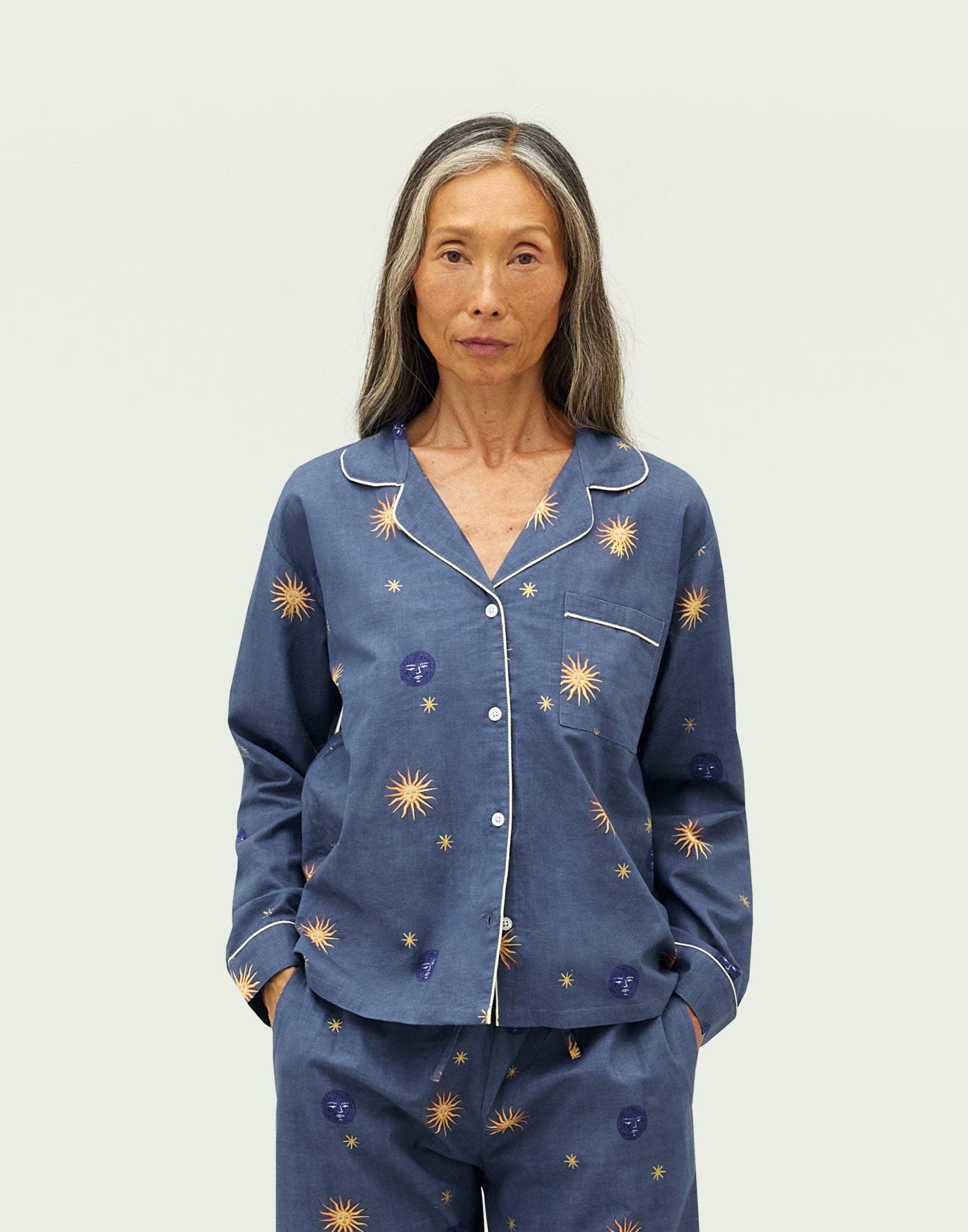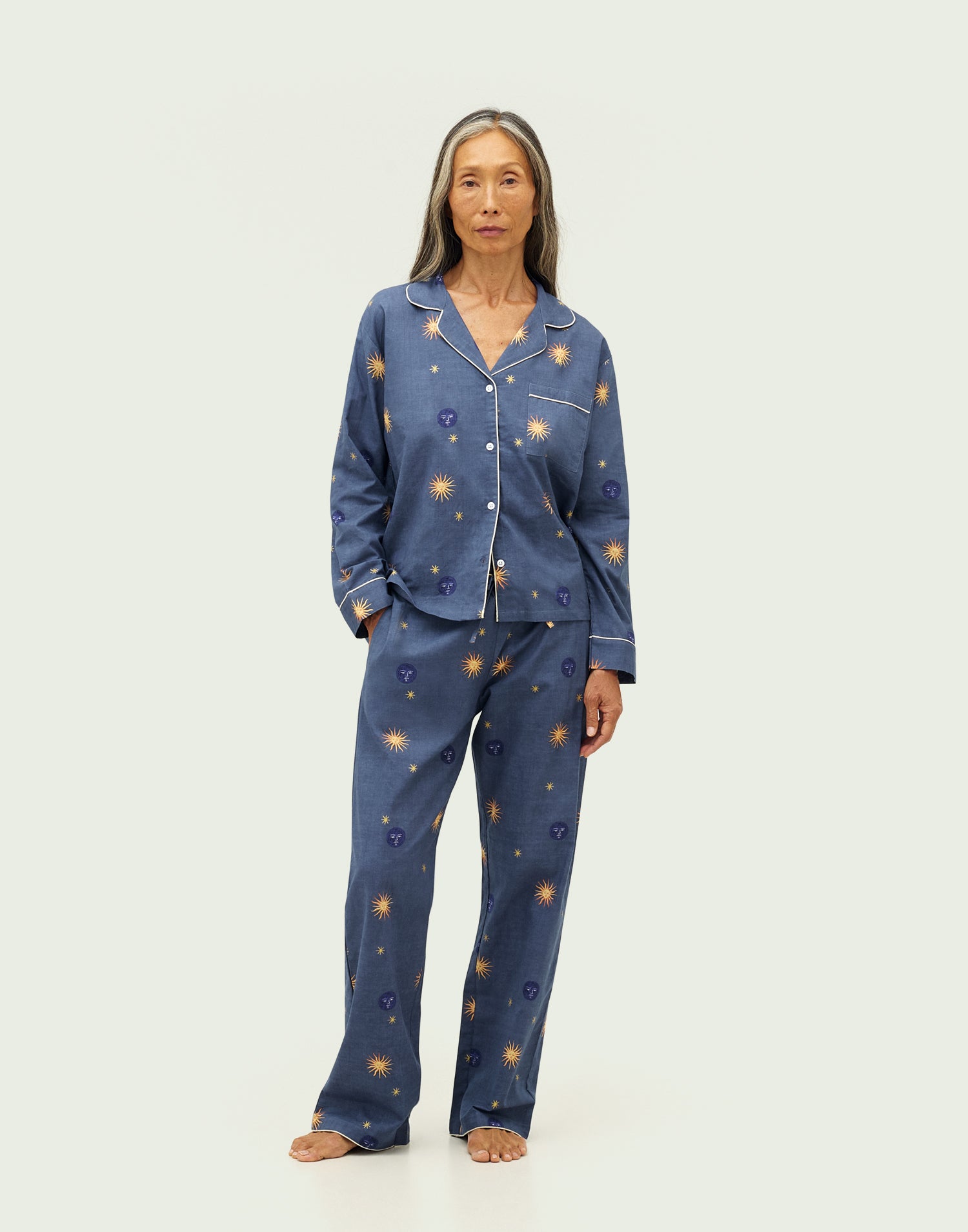 Cotton pajama set composed of two pieces: long-sleeve shirt and long pants. Finished with contrast trim.