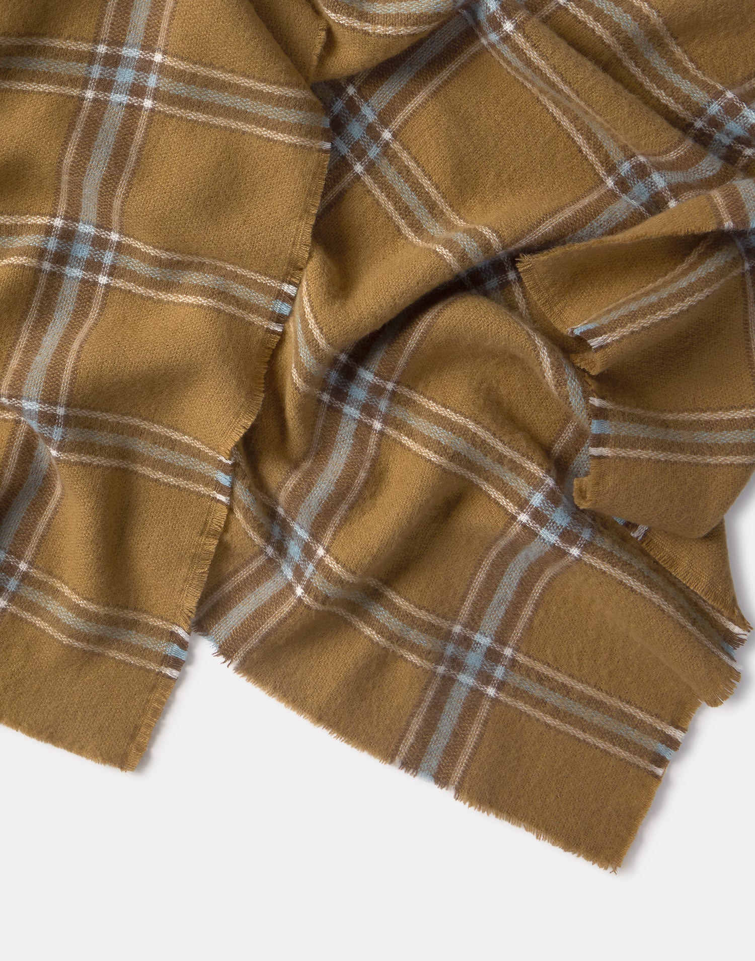 Scarf with check pattern and frayed edge detail.