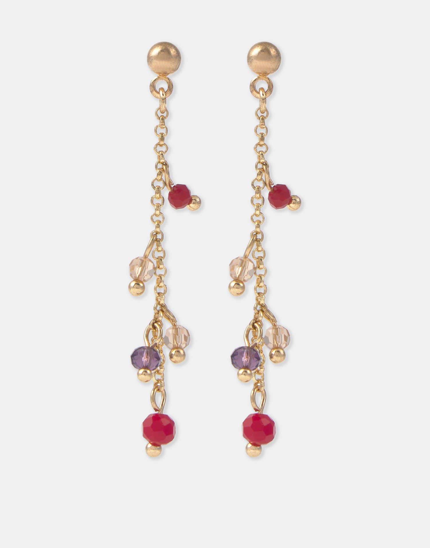 Long dangling earrings with chain and large coloured beads. Metal nut fastening.