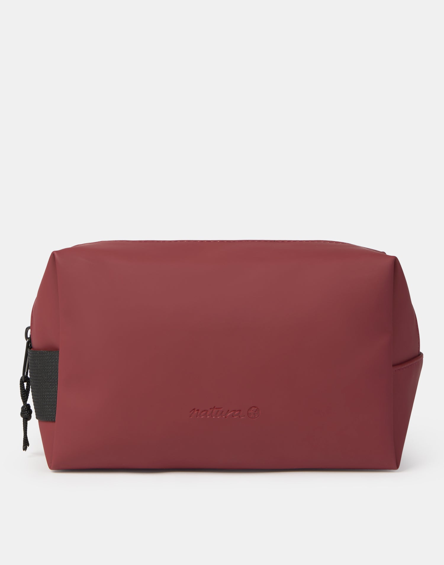 Synthetic leather toiletry bag with wide opening and zipper closure.