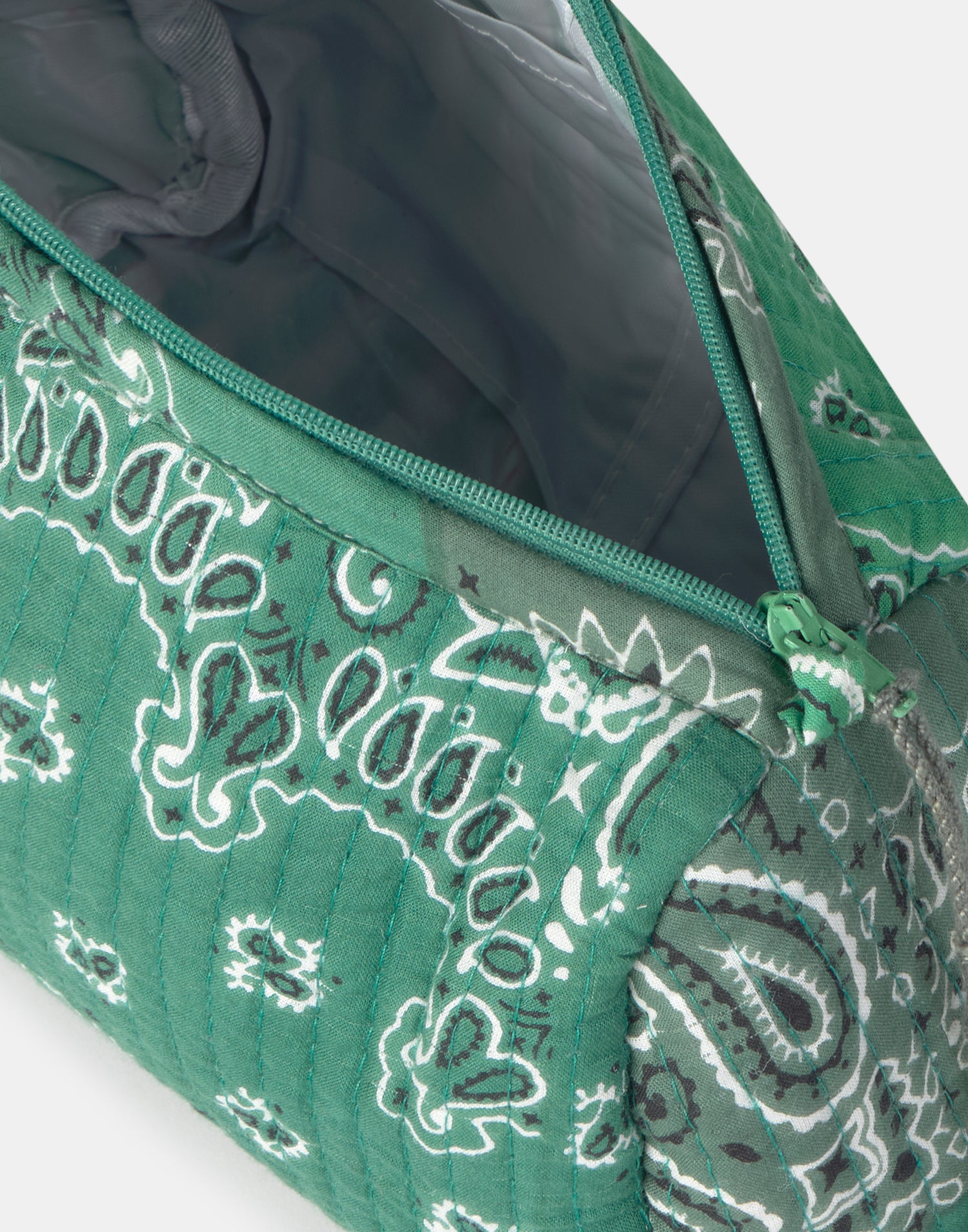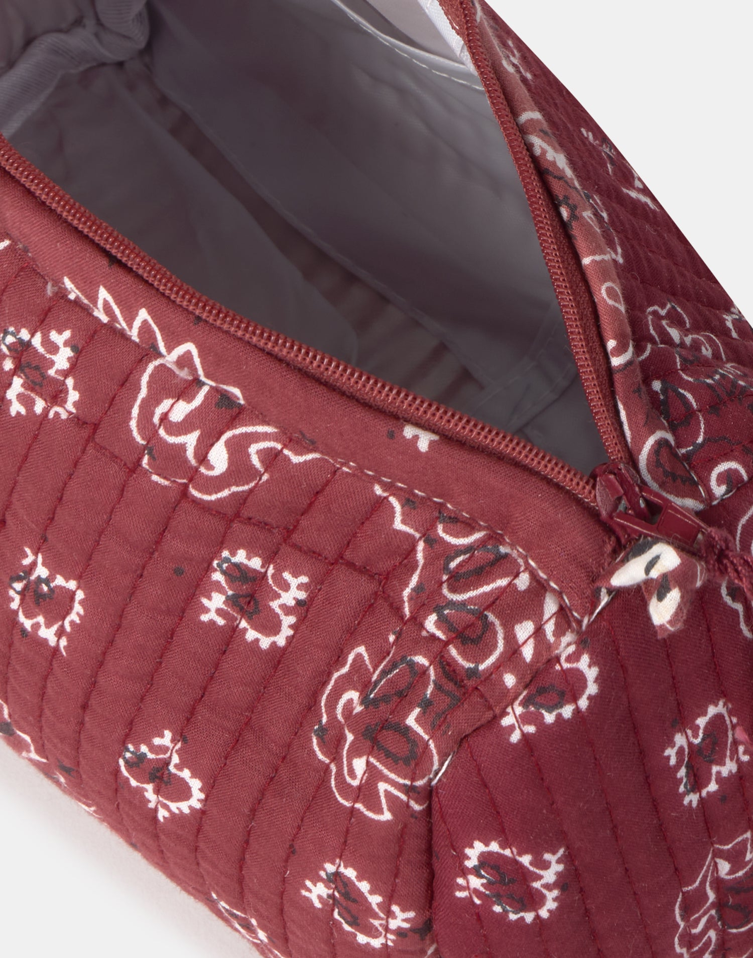 Toiletry bag with coated interior and zip closure with pompom detail.