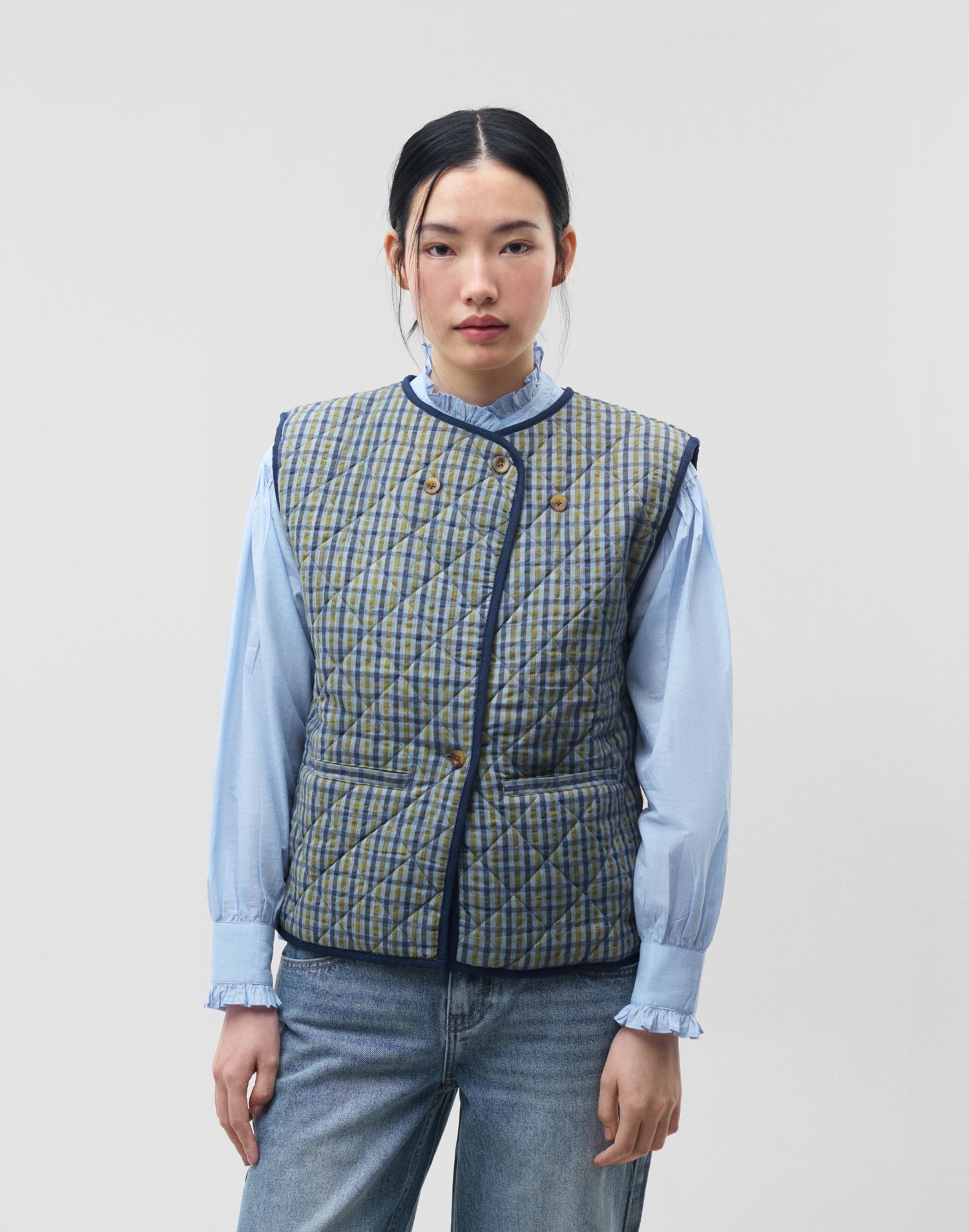 Quilted vest featuring a checkered pattern, round neckline and sleeveless design. Button-front closure and front pockets.