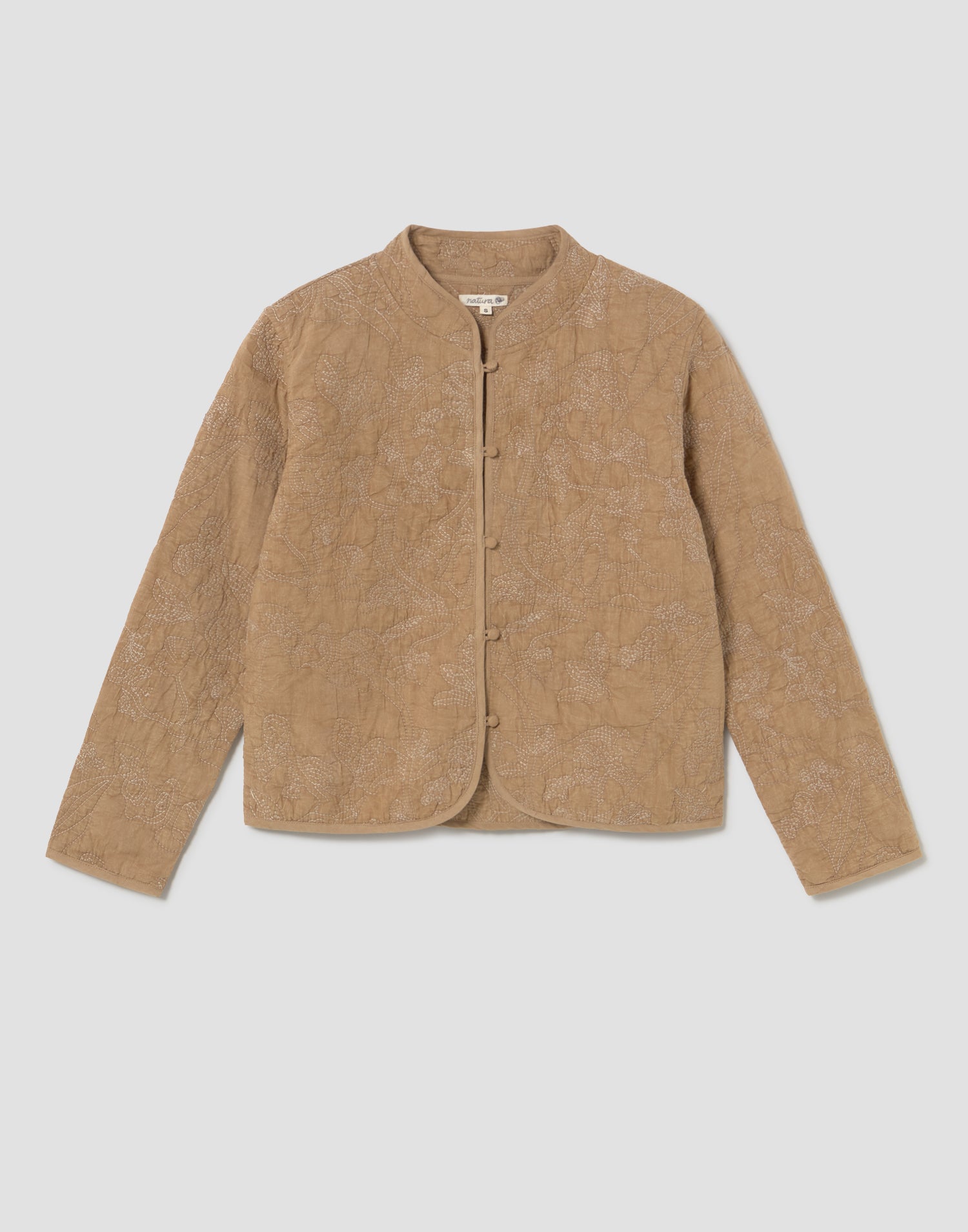 Lightweight jacket with mandarin collar, long sleeves and front button fastening. Finished with embroidered details.