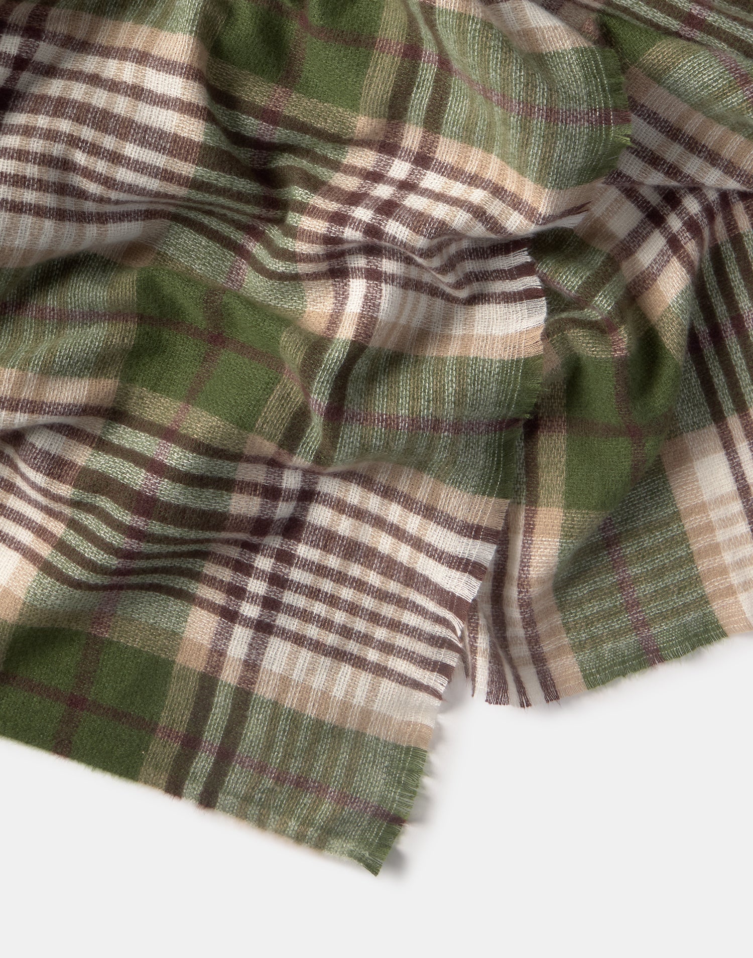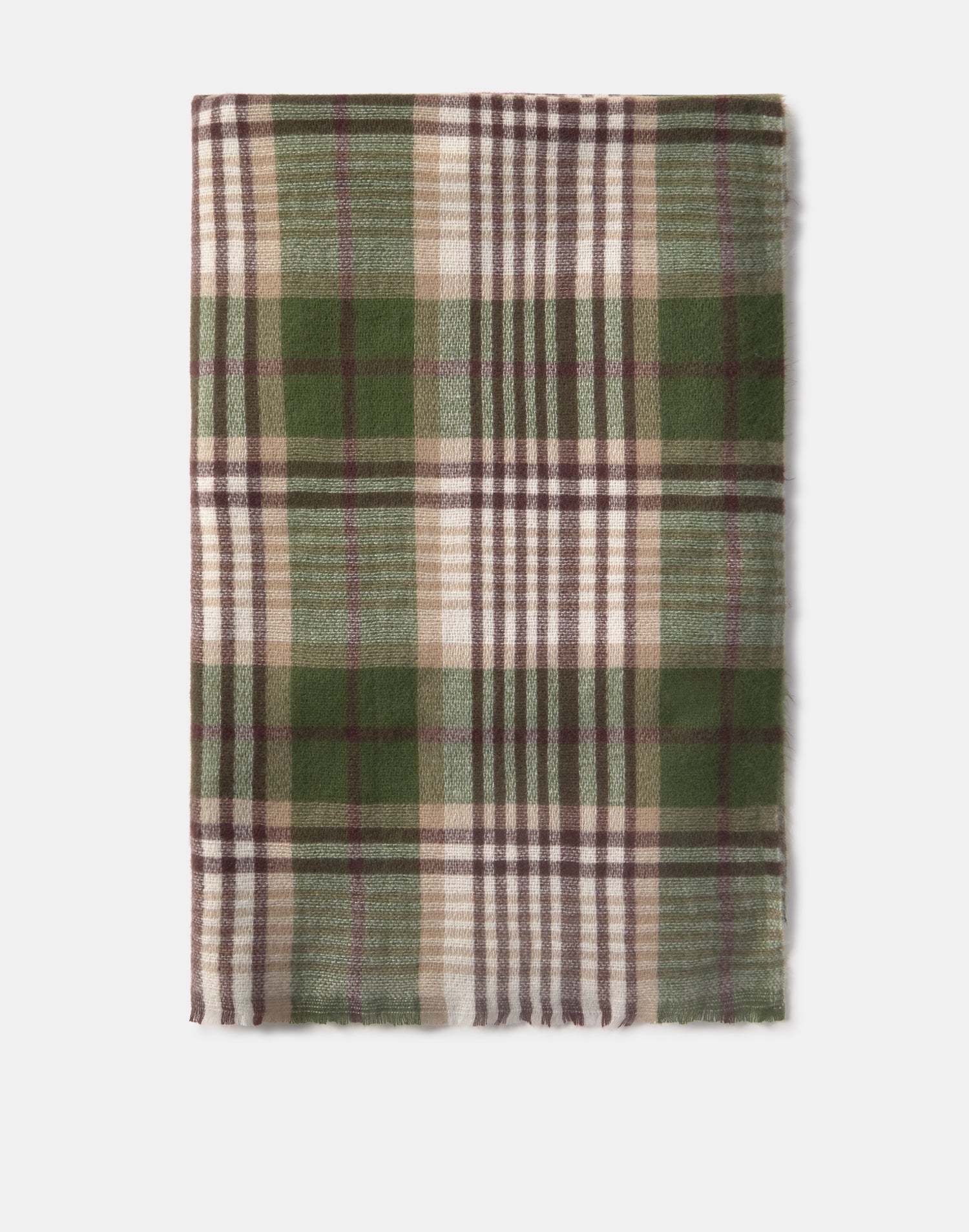 Bufanda con diseño a cuadros y detalle de terminaciones deshilachadas.