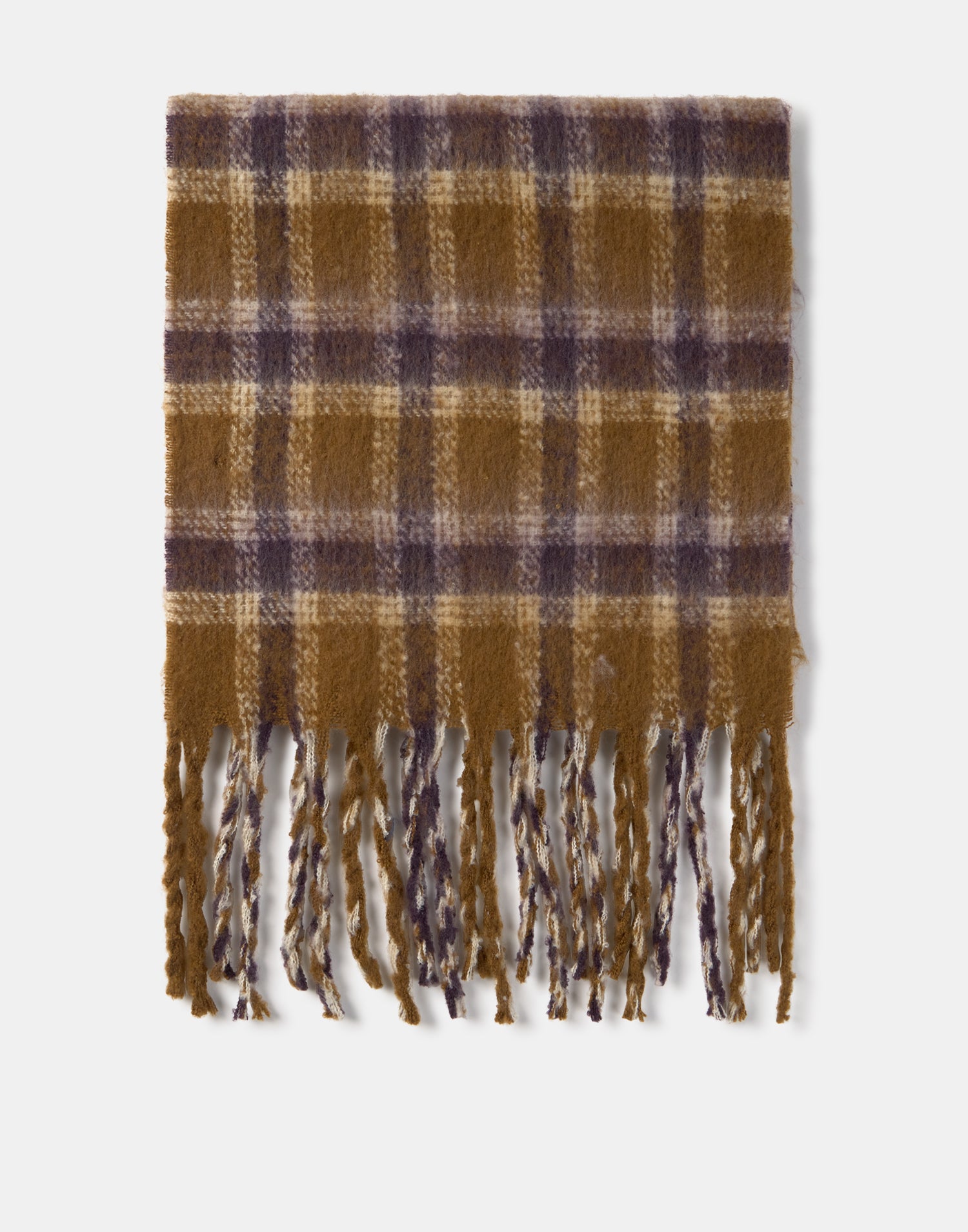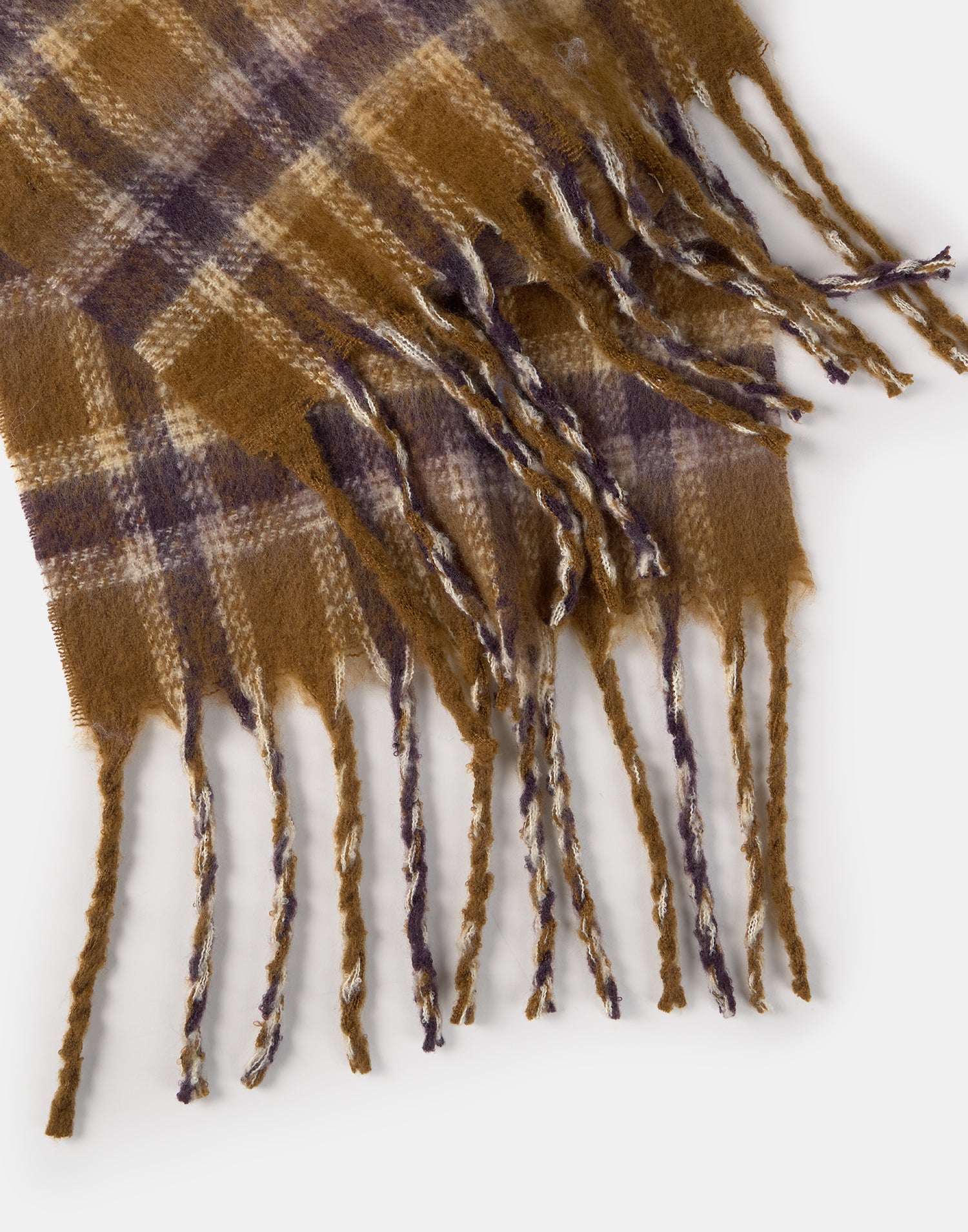 Bufanda con diseño a cuadros y terminaciones en flecos.