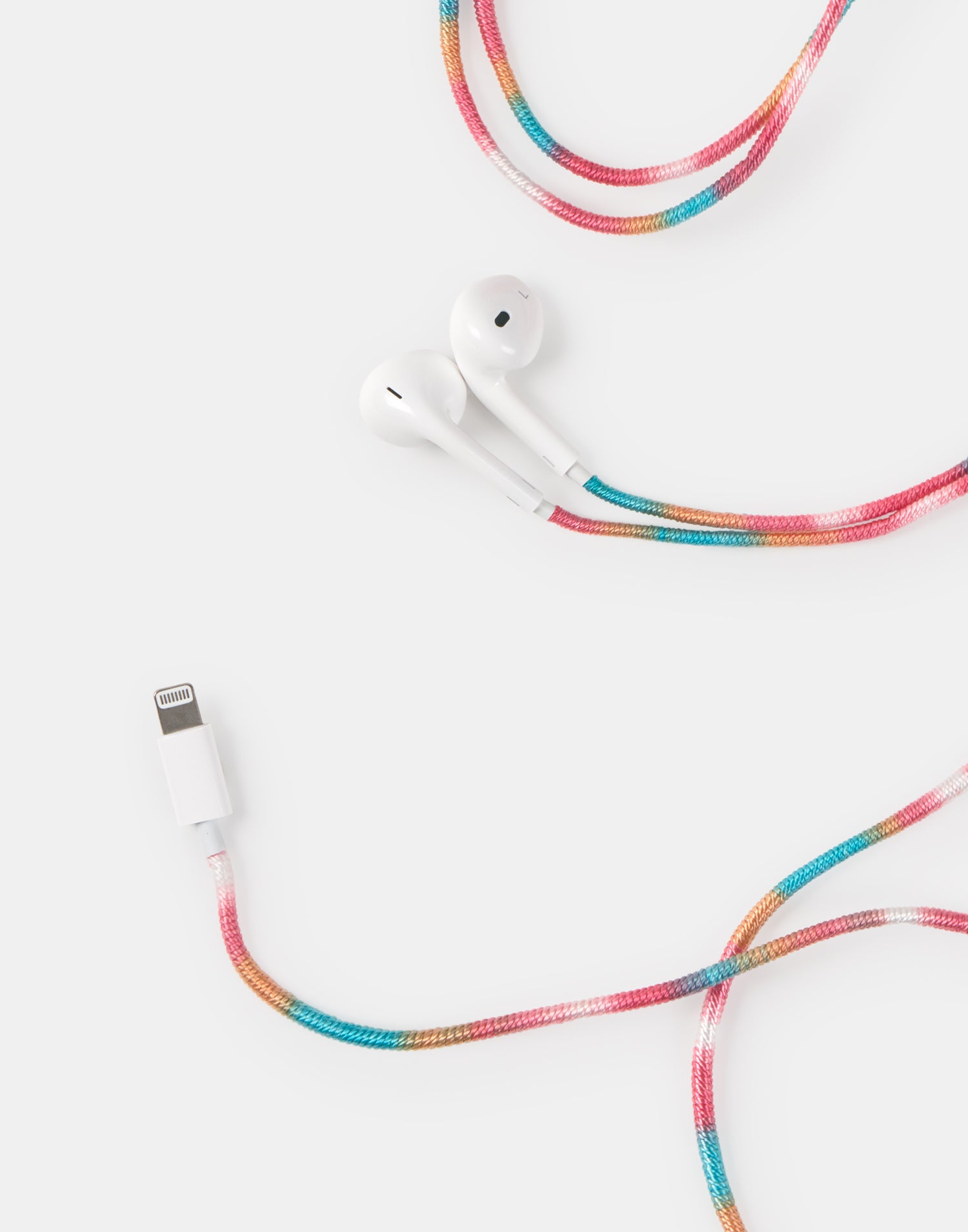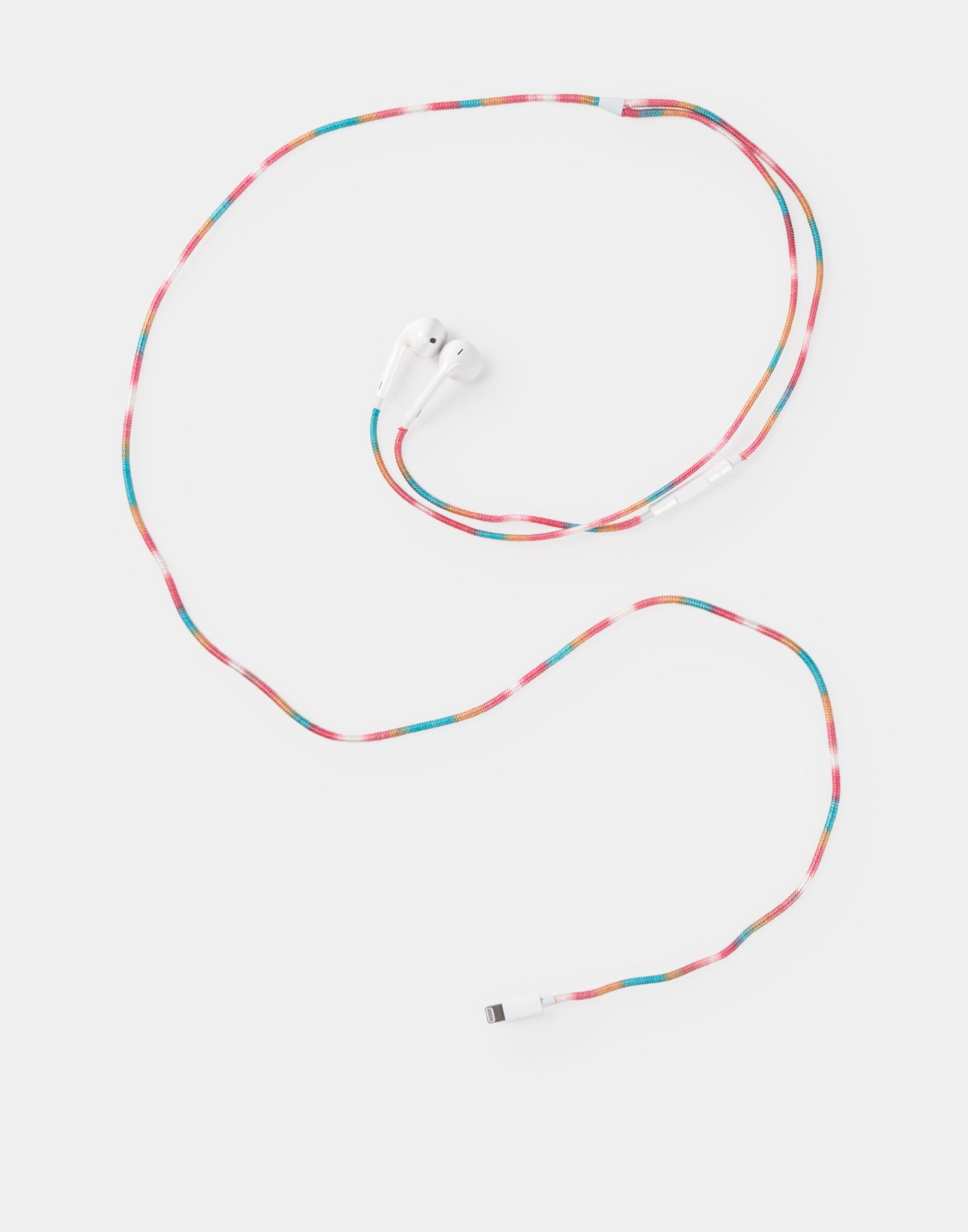 Auriculares con conector Lightning y cable de 110 cm cubierto de tela trenzada para prevenir enredos y protegerlos. Micrófono y control de volumen incluido. Función de coger y colgar llamadas, también de empezar, pausar y saltar música o vídeo.