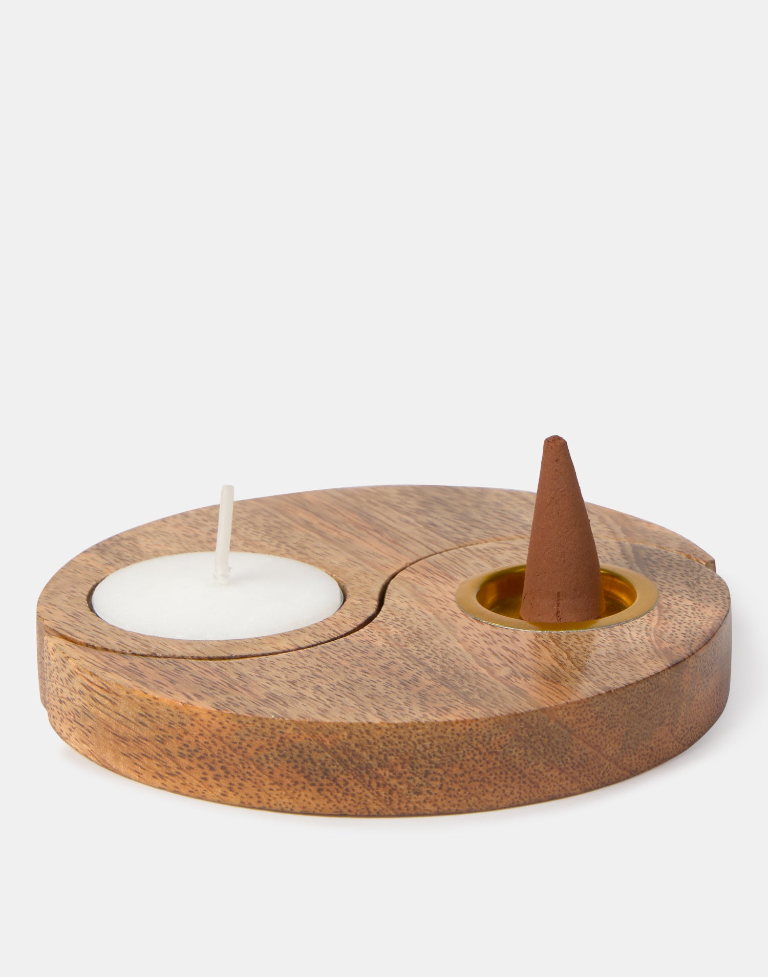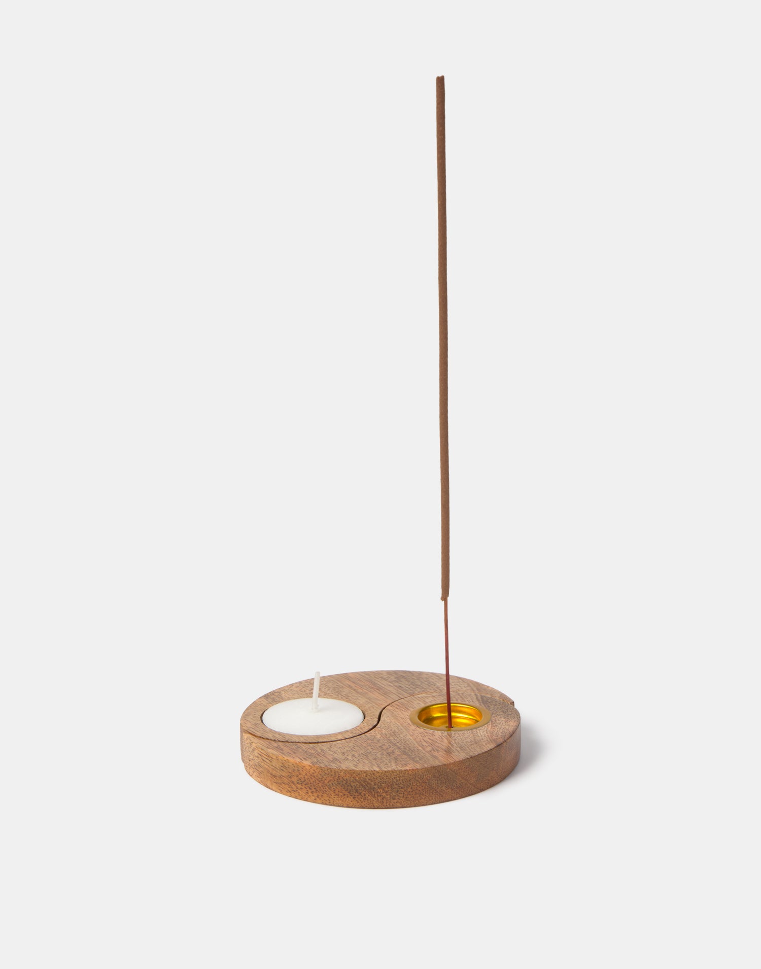 Portaincienso ying yang de madera con espacio para vela tealight e inciensos de stick y cono.