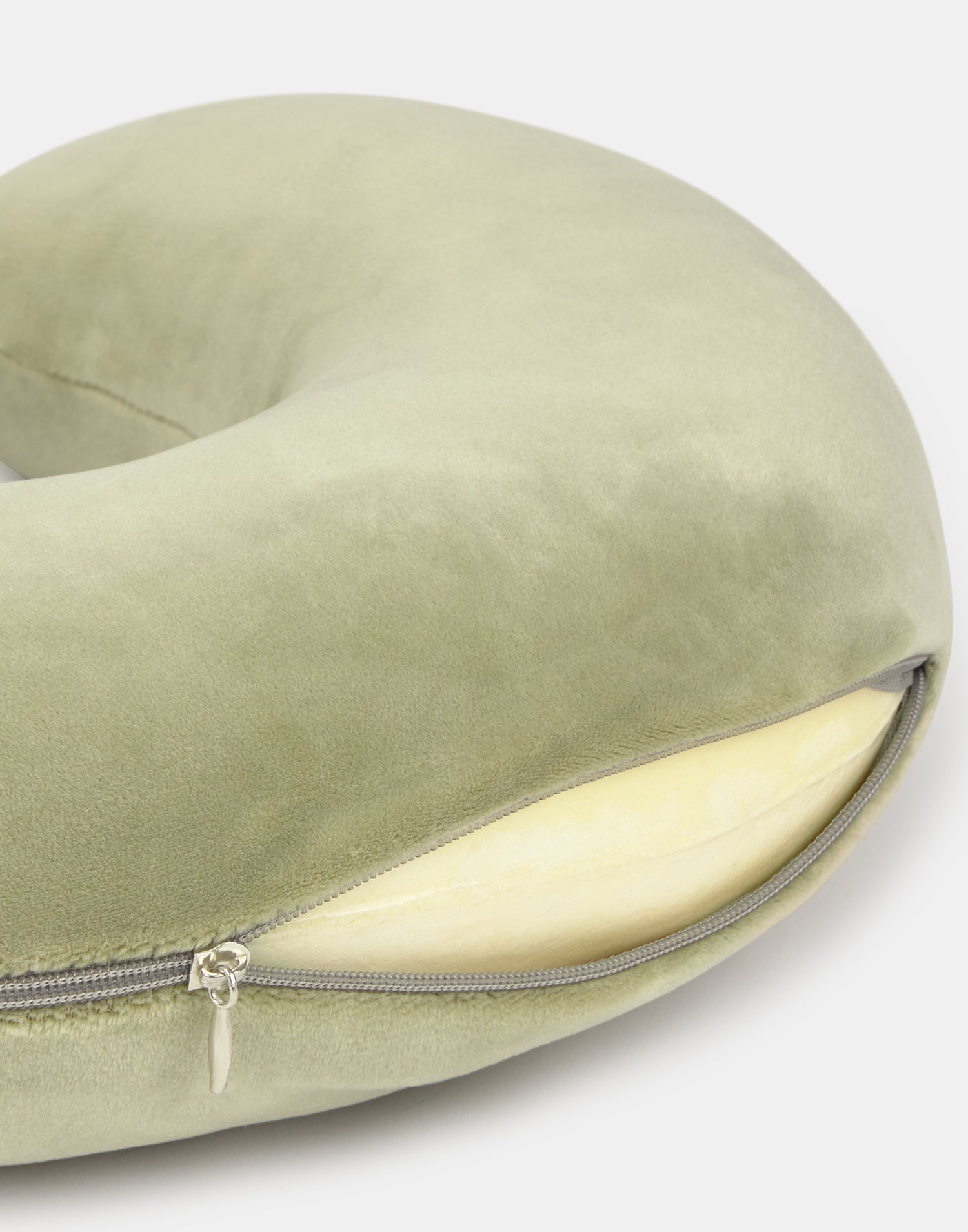 Cojín cervical con acabado aterciopelado relleno de espuma viscoelástica, un material que se adapta al cuerpo y suaviza la presión que ejerce este sobre la musculatura.