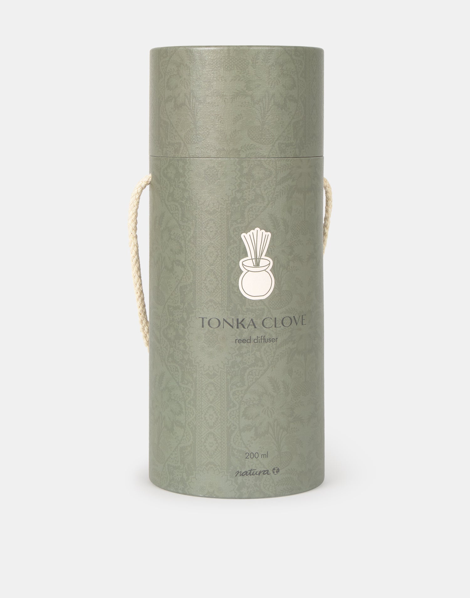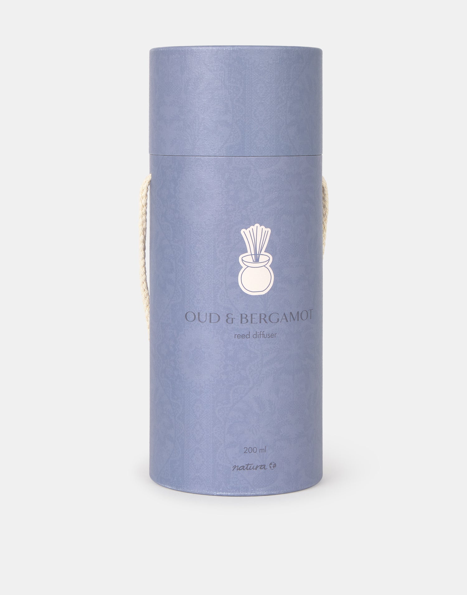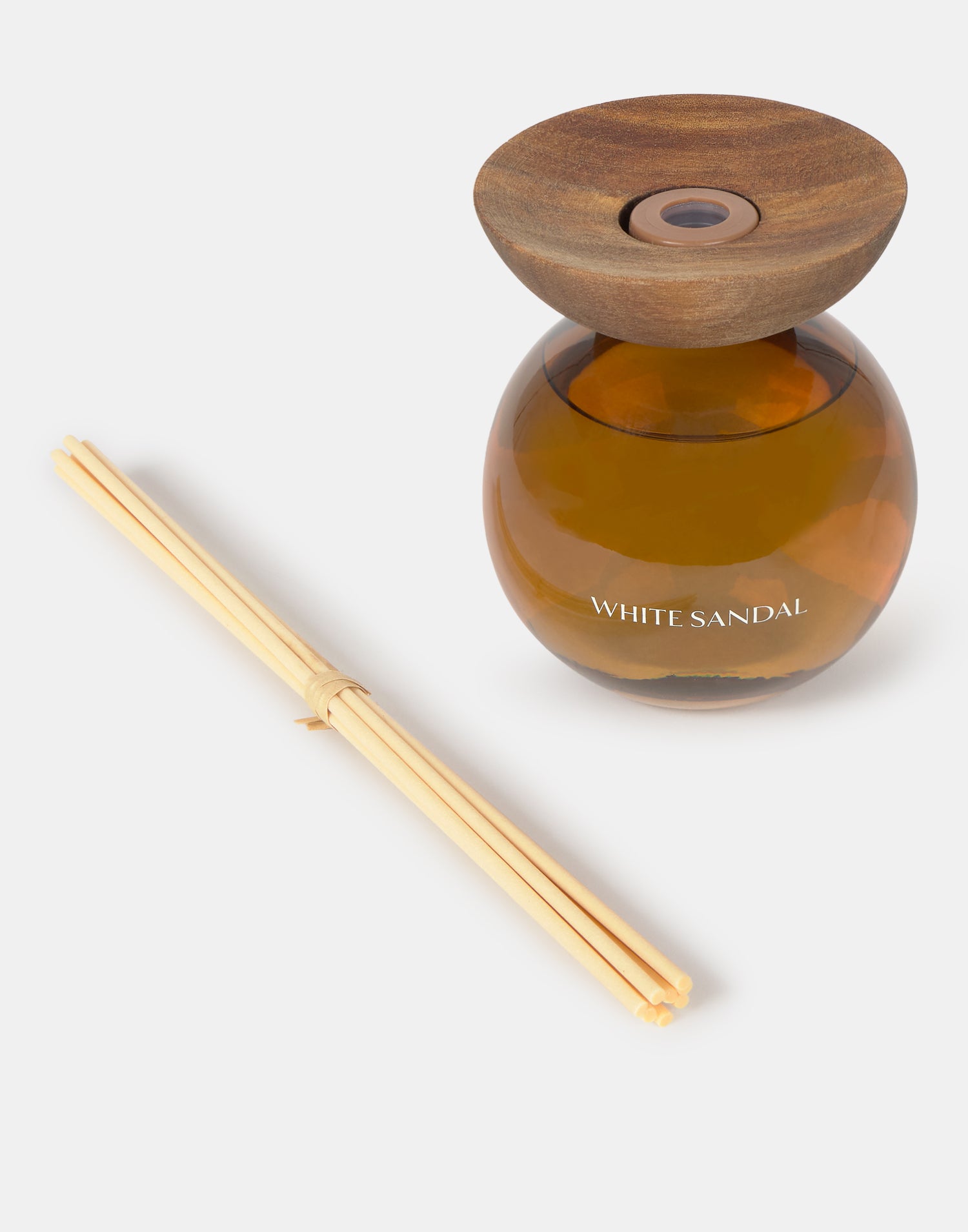 Diffuseur d’ambiance à bâtonnets, avec flacon rond en verre, détail en bois et tiges en fibre. Disponible en quatre parfums.