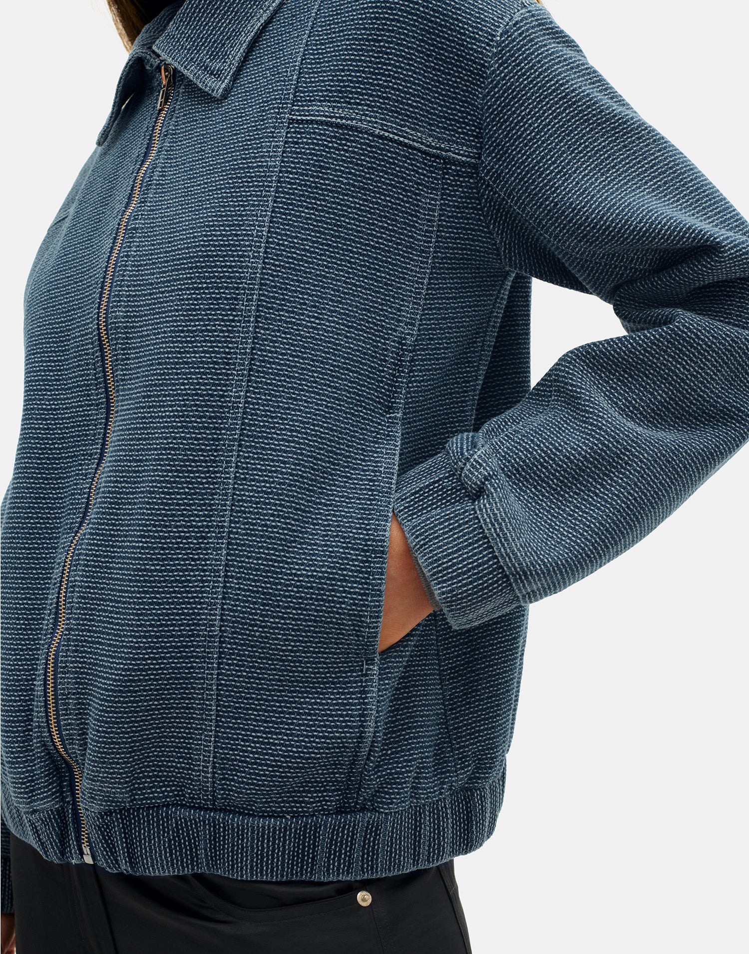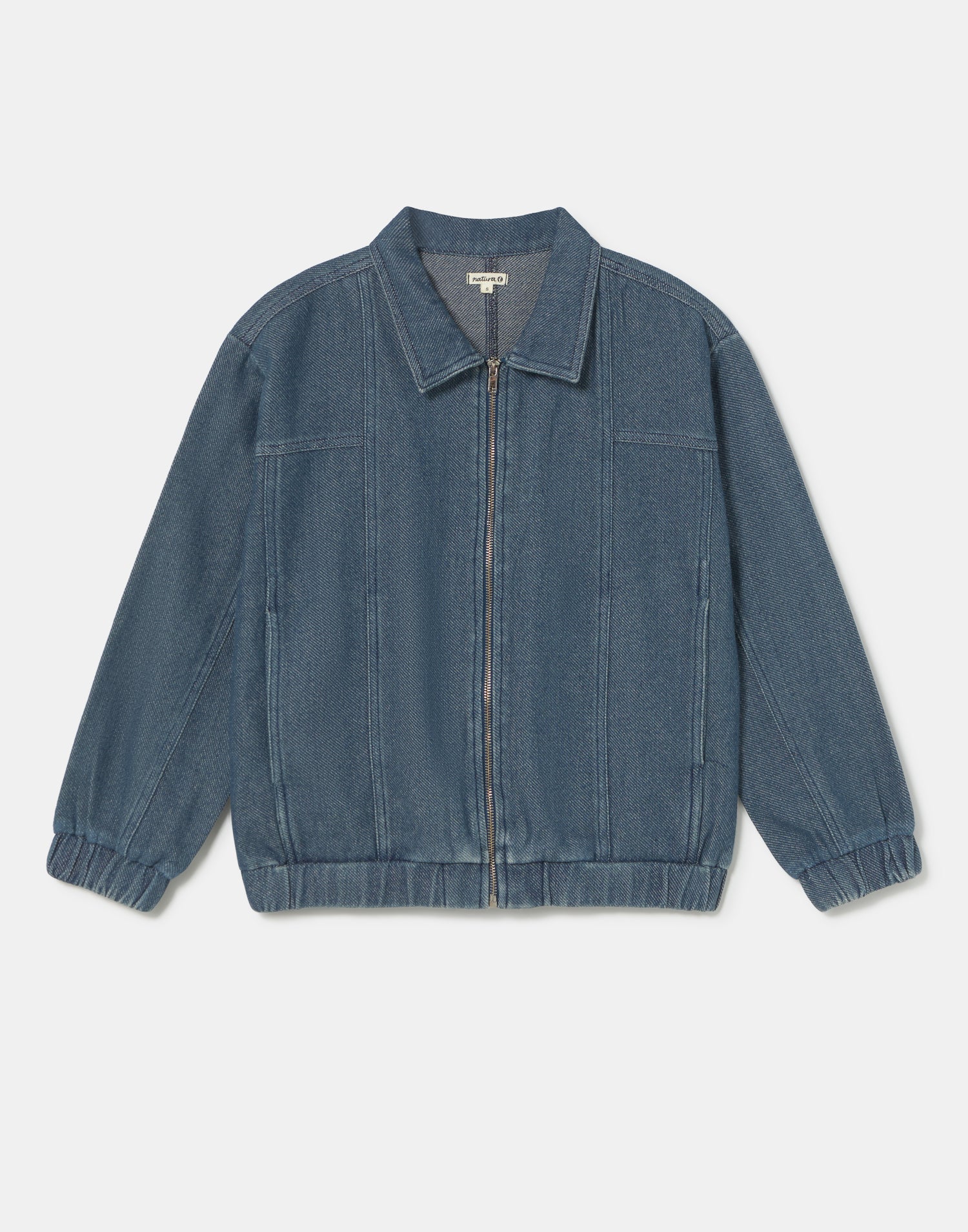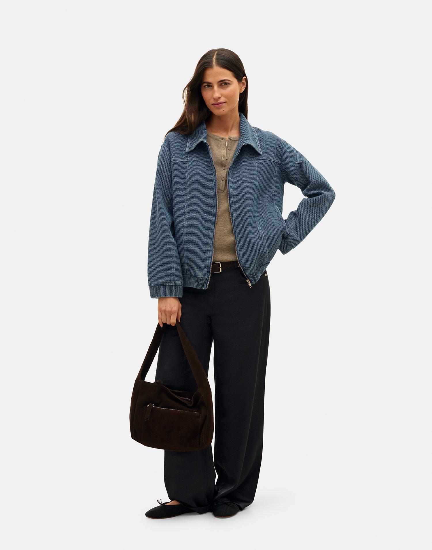 Veste style bomber avec finition denim et manches longues. Col chemise, poches frontales et fermeture éclair devant. Bas et poignets à finition élastique.