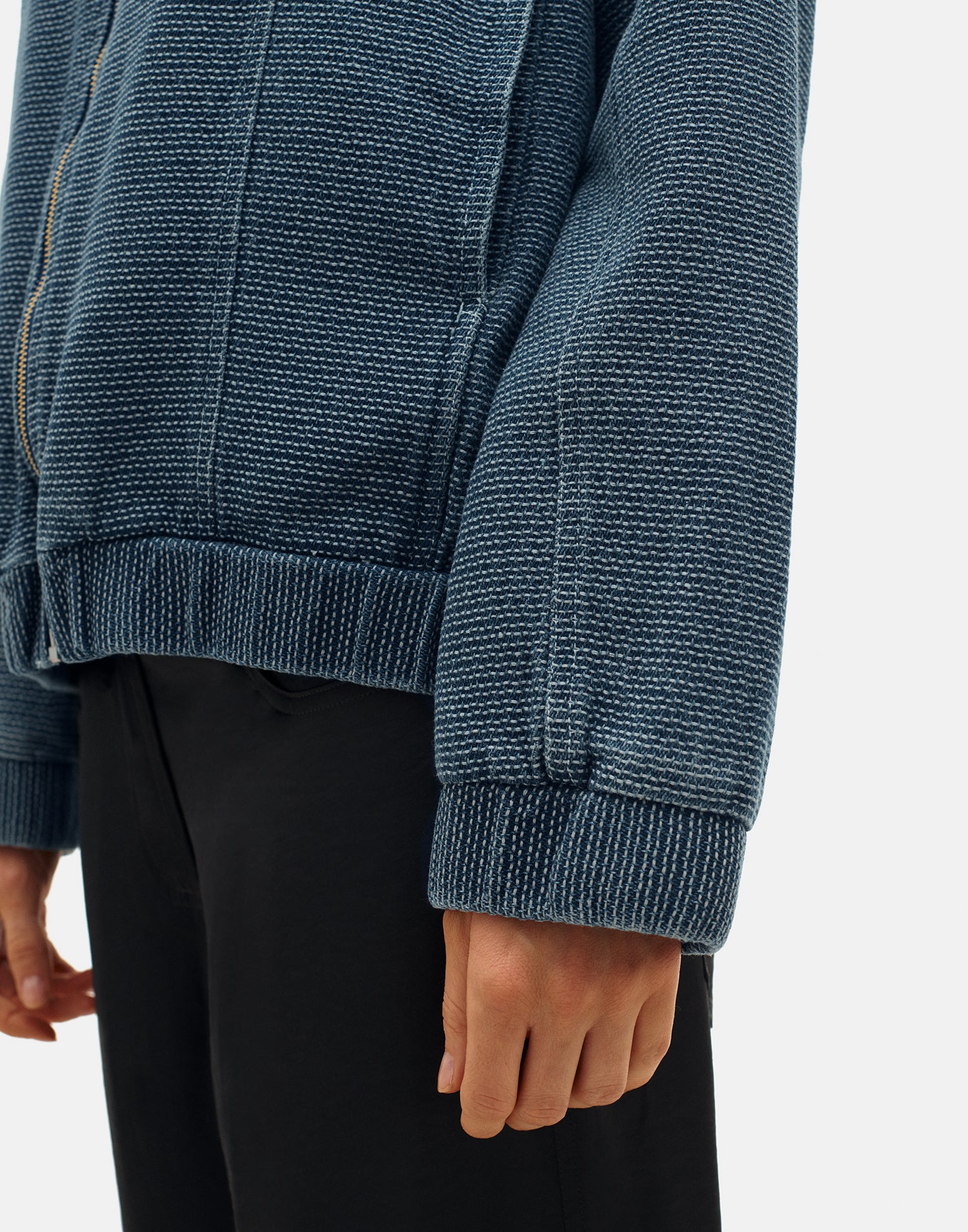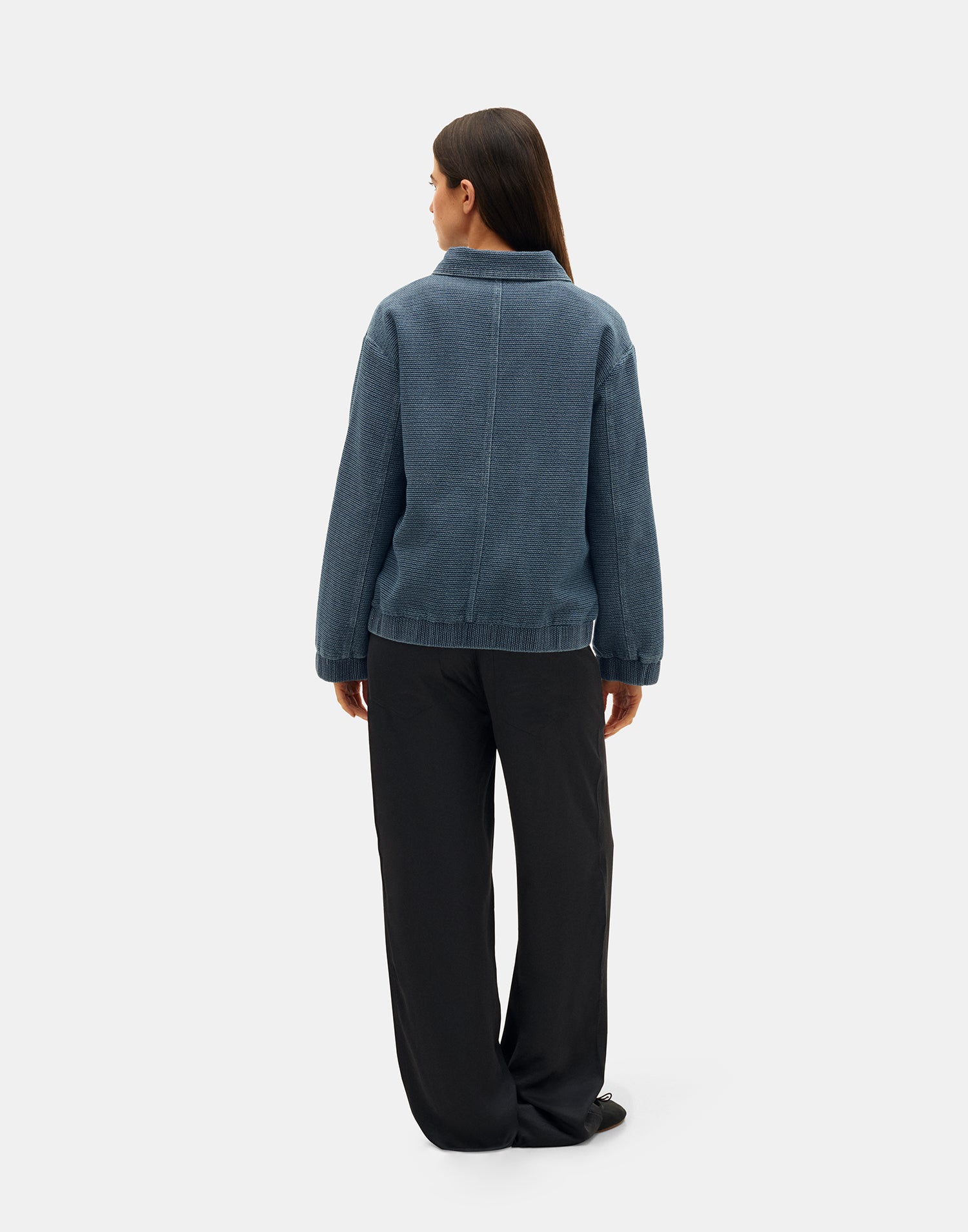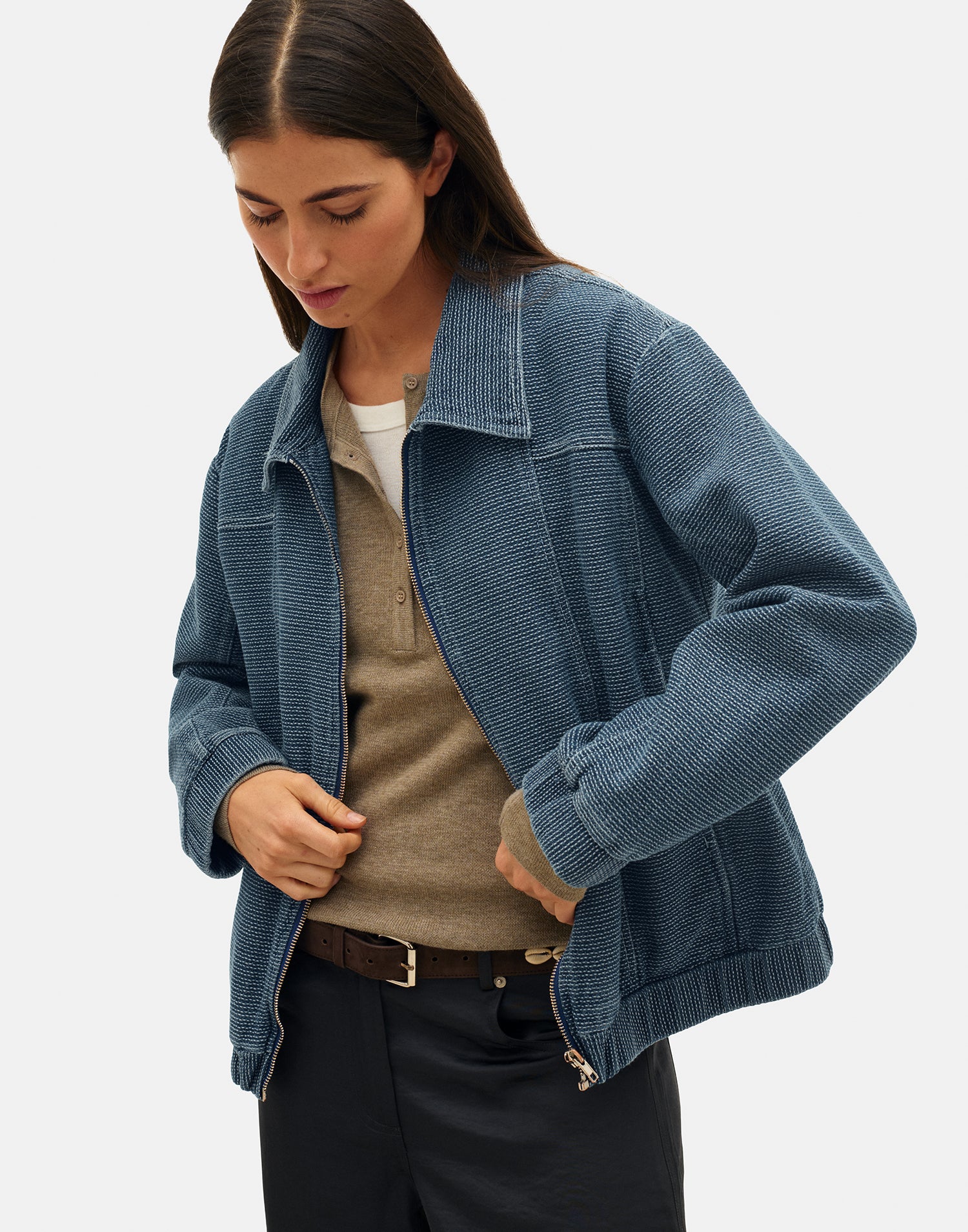 Veste style bomber avec finition denim et manches longues. Col chemise, poches frontales et fermeture éclair devant. Bas et poignets à finition élastique.