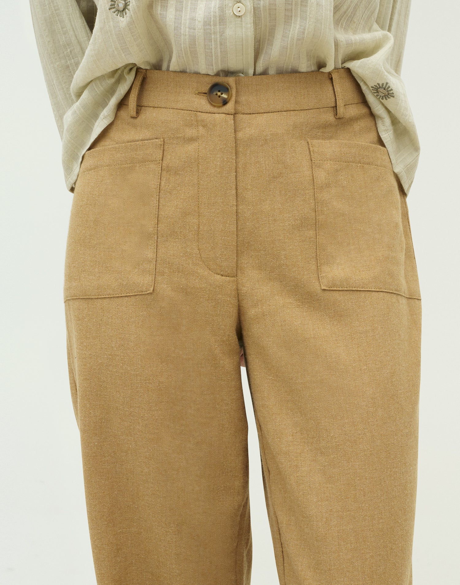 Pantalon taille haute avec poches avant et passants de ceinture. Fermeture frontale par zip et bouton.