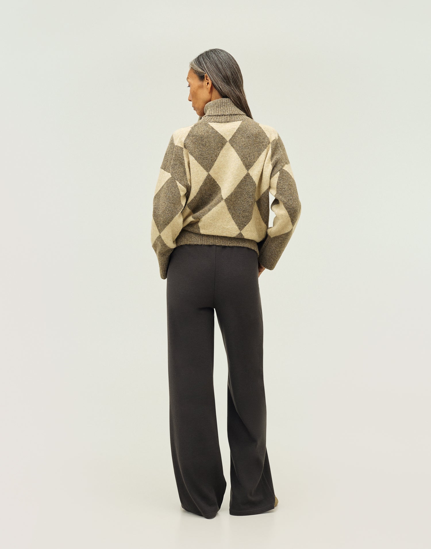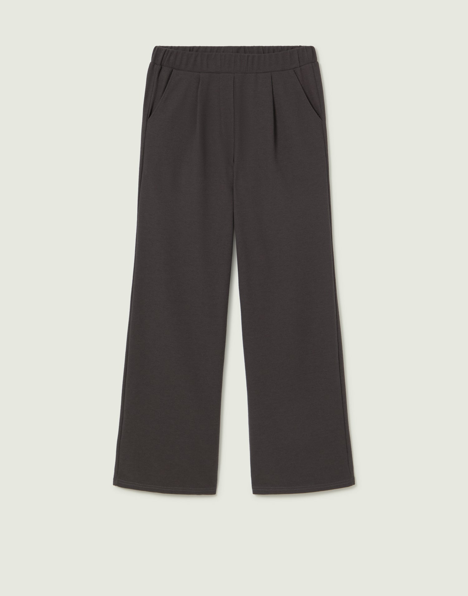Pantalon droit en mélange de coton, avec taille élastique, poches latérales et détail de pinces à l’avant.