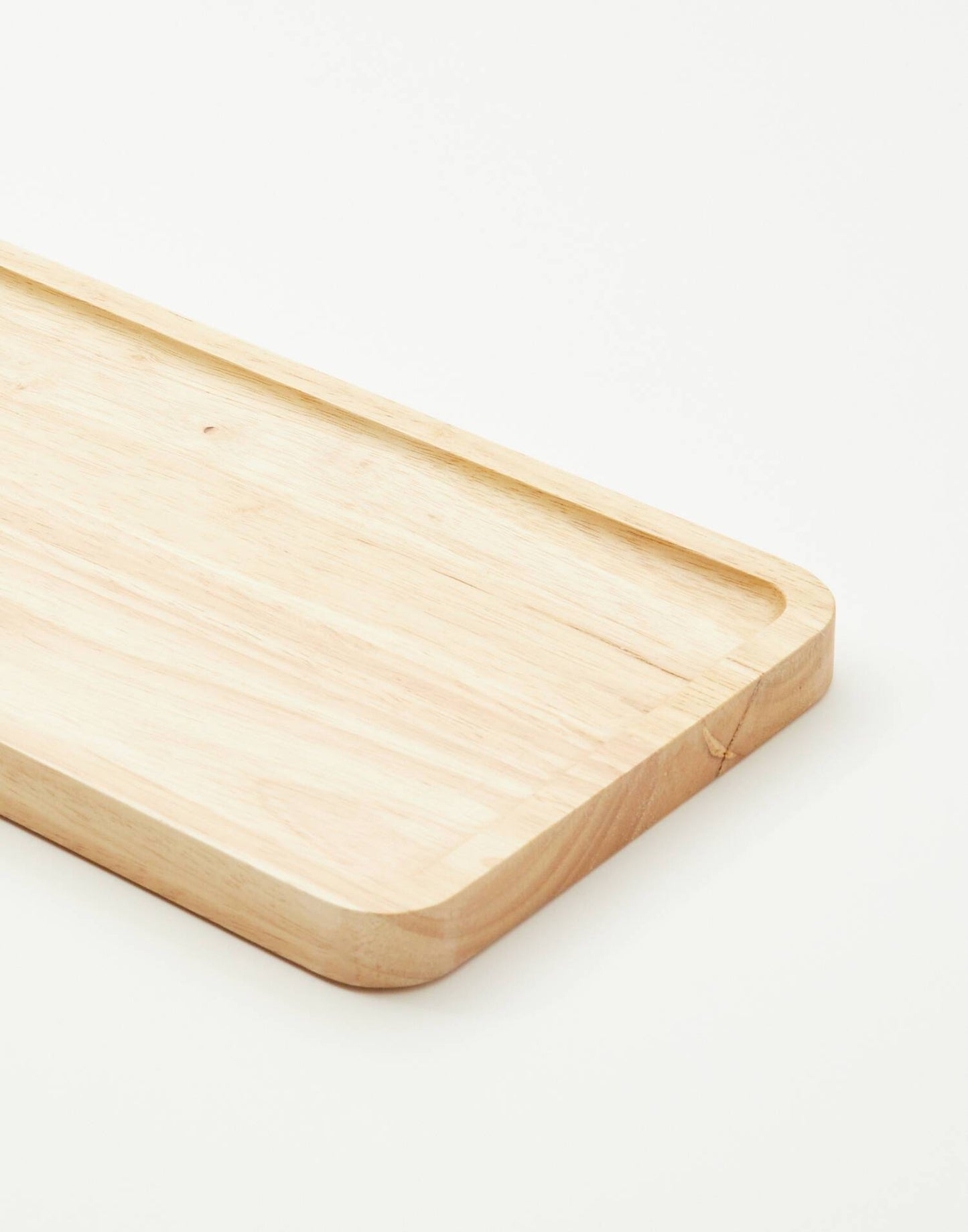 Plateau en bois rectangulaire avec bord bas et coins arrondis.