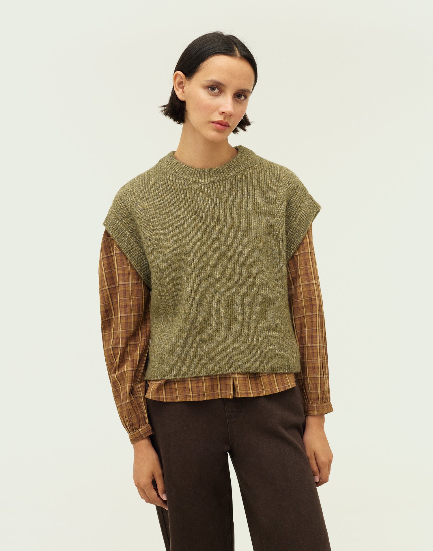 Gilet en maille en mélange de laine avec col rond, épaules tombantes et fermeture latérale par boutons.