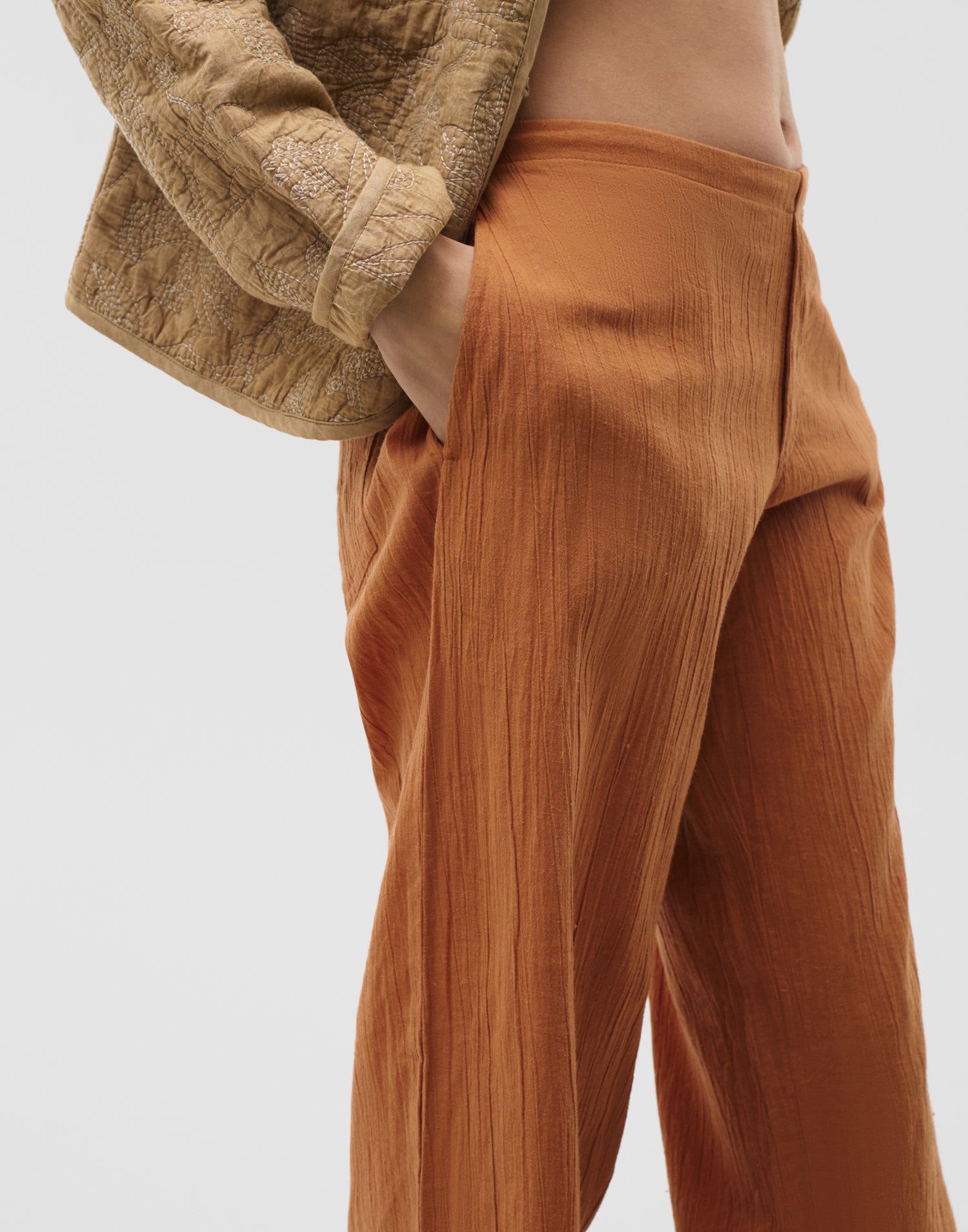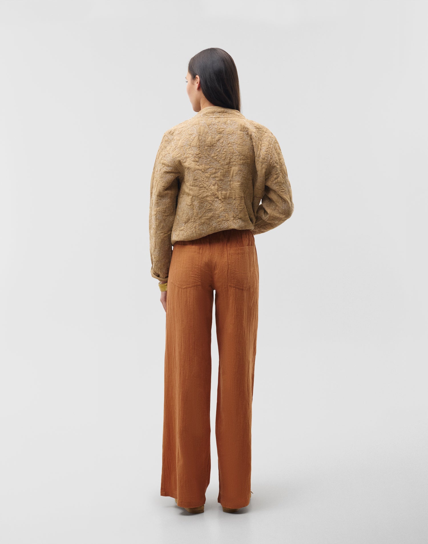 Pantalon droit en mélange coton-lin avec taille élastique à l’arrière. Poches latérales et poches plaquées au dos.