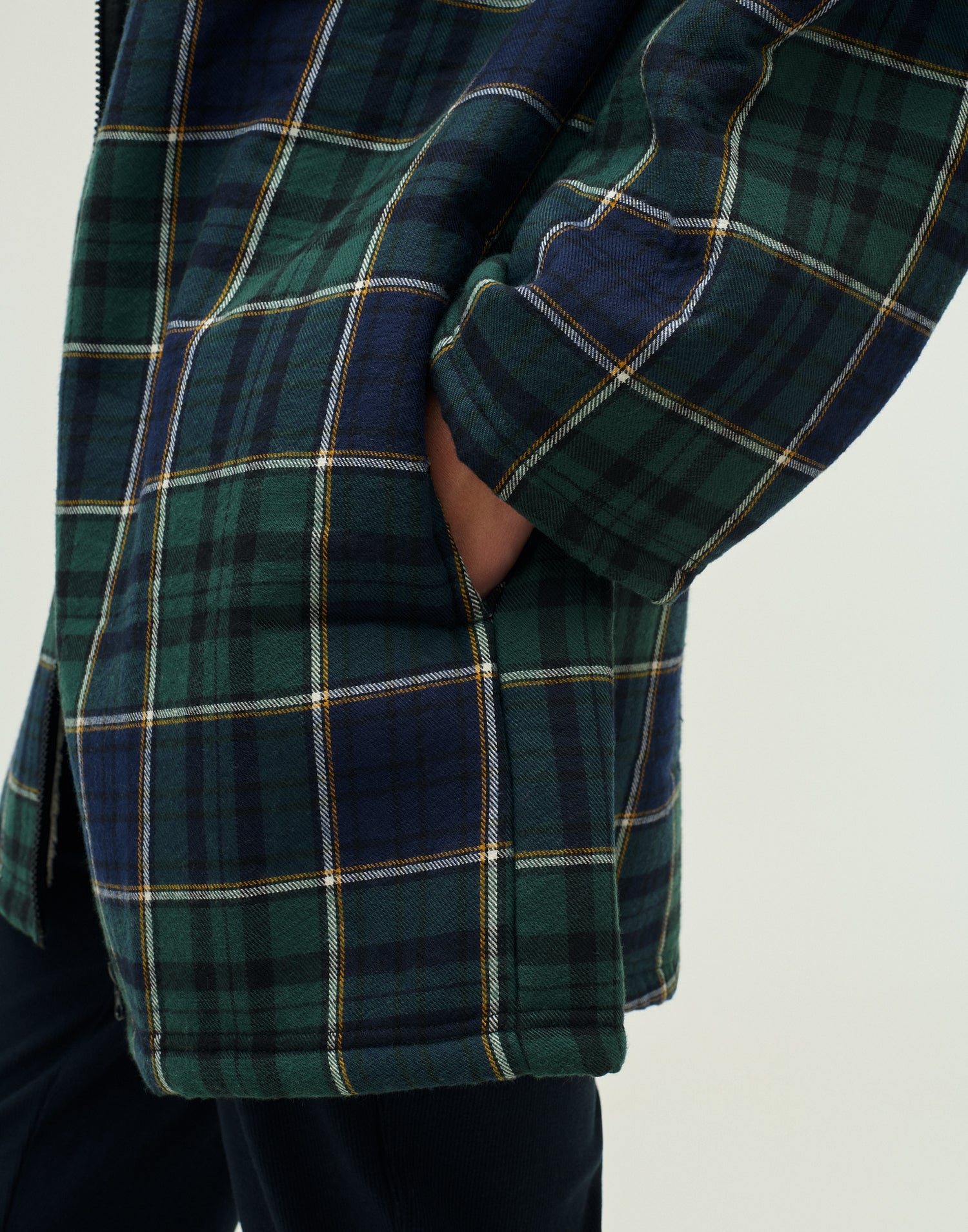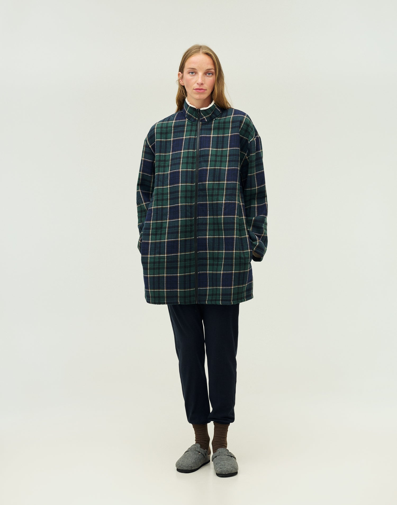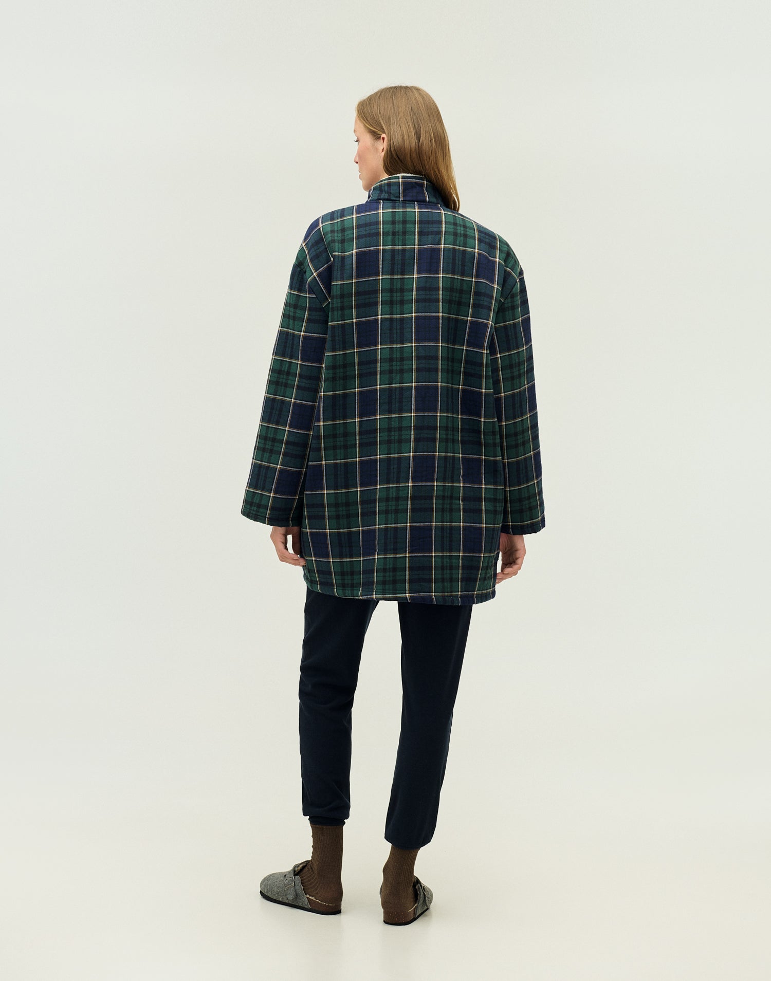 Peignoir en tissu épais avec doublure intérieure effet mouton. Col montant, poches latérales et fermeture zippée sur le devant.
