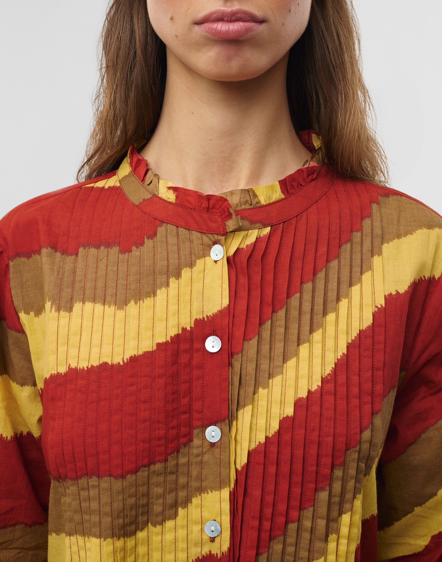 Robe imprimée à manches longues et col rond avec détail volanté. Fermeture boutonnée et détails plissés sur le devant.