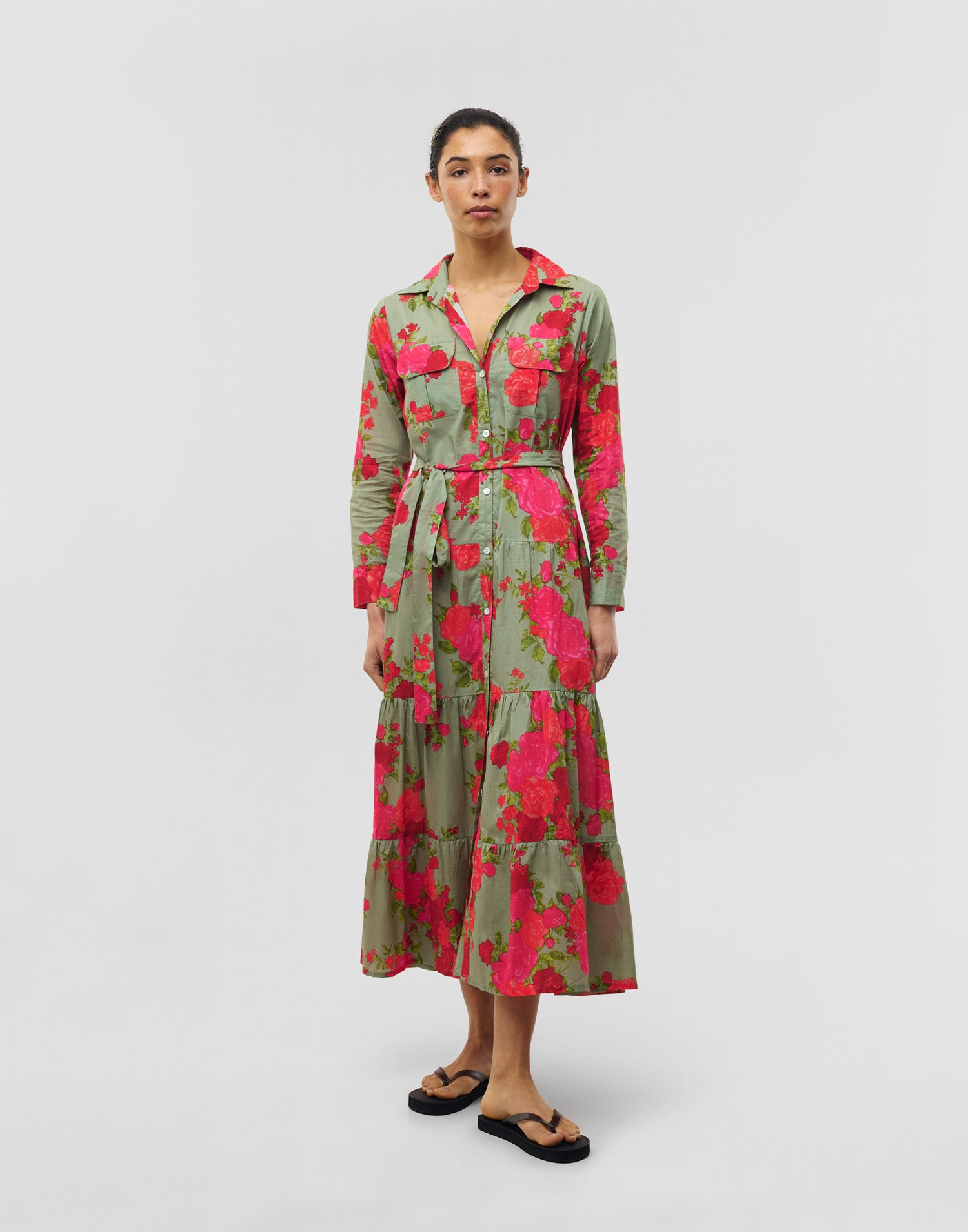 Robe fleurie à manches longues avec col à revers et fermeture boutonnée sur le devant. Poches plaquées à l’avant et ceinture assortie.