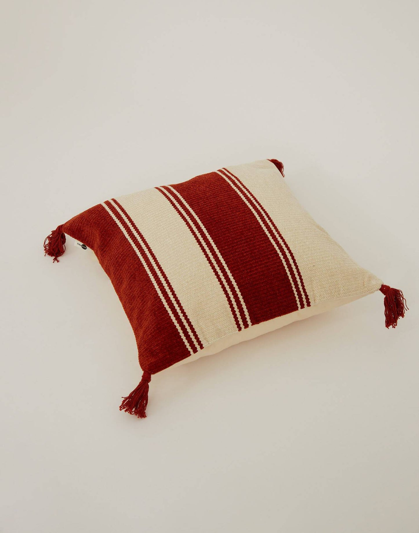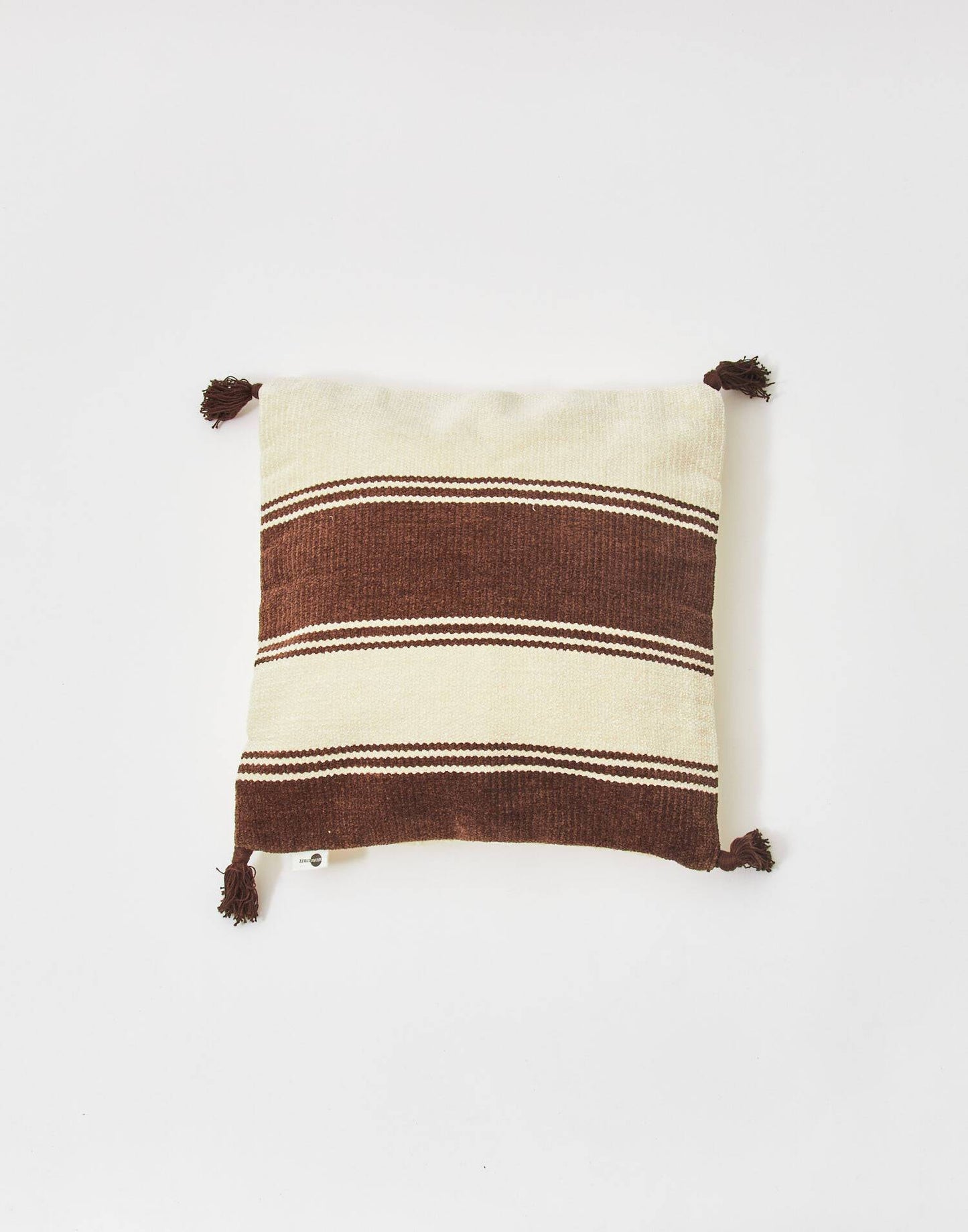 Couvre-coussin avec design rayé à l'avant et Pom Pom dans les coins. Fermeture de fermeture éclair à l'arrière.