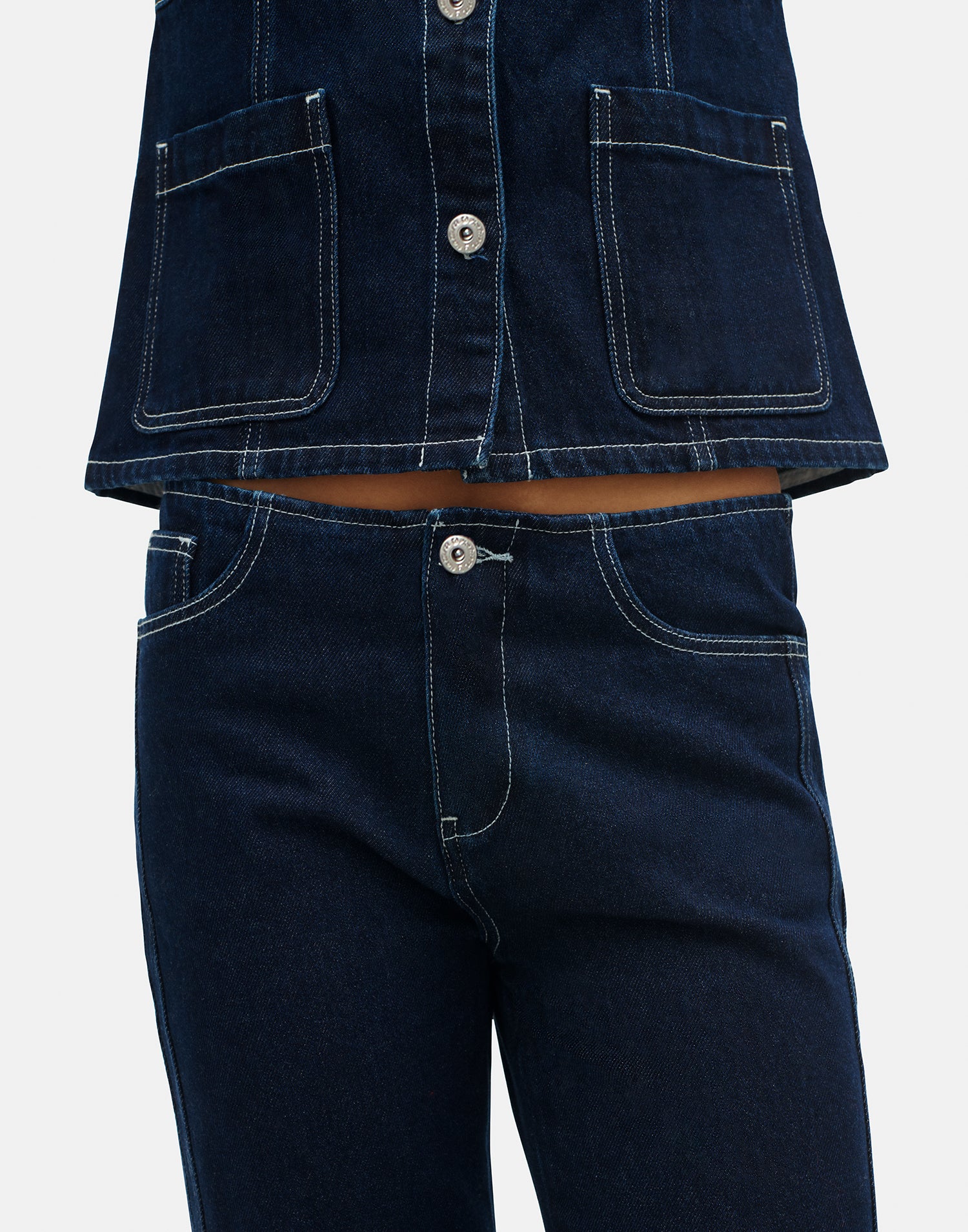 Jean droit taille basse avec fermeture à bouton et zip sur le devant. Poches plaquées et couture marquée dans le dos.