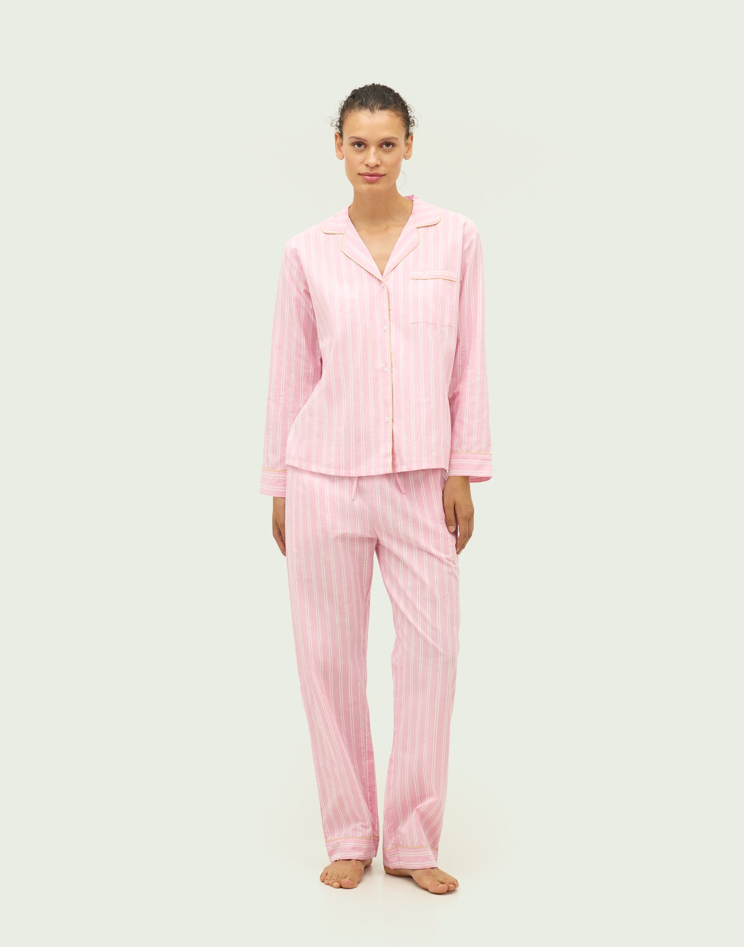 Ensemble de pyjama en coton composé de deux pièces : chemise à manches longues et pantalon long. Finitions passepoilées en contraste.