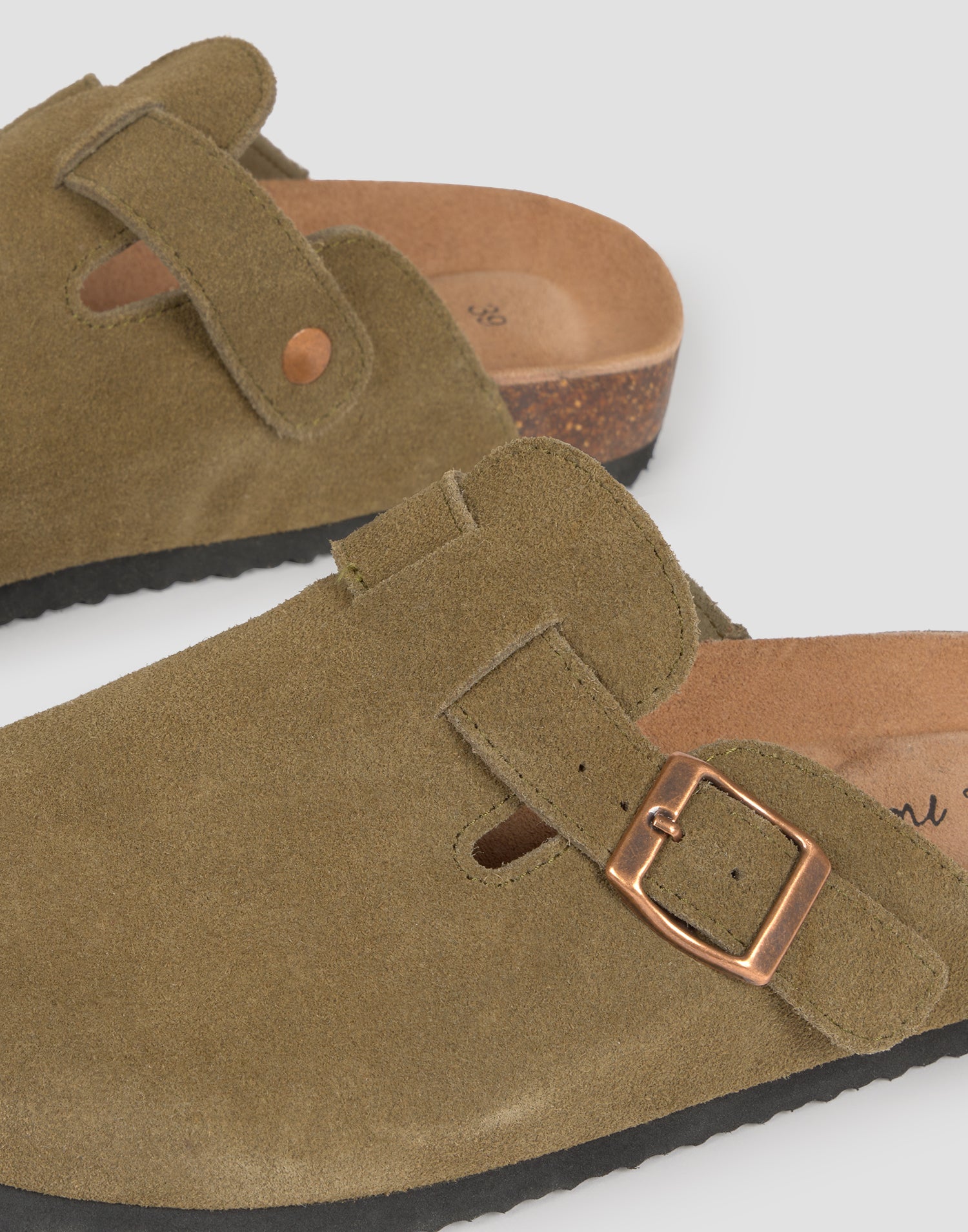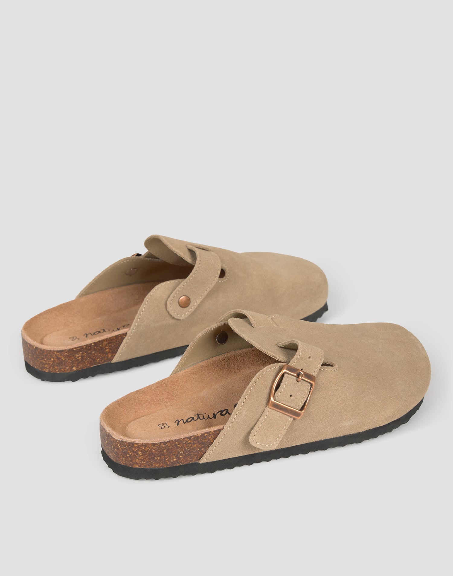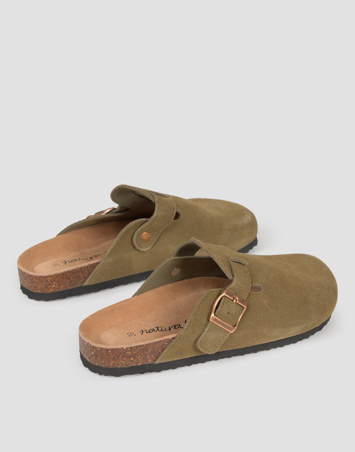Chaussure de type sabot avec design décolleté, coupe en cuir de serraje et semelle en liège. Détail de boucle sur la tige.