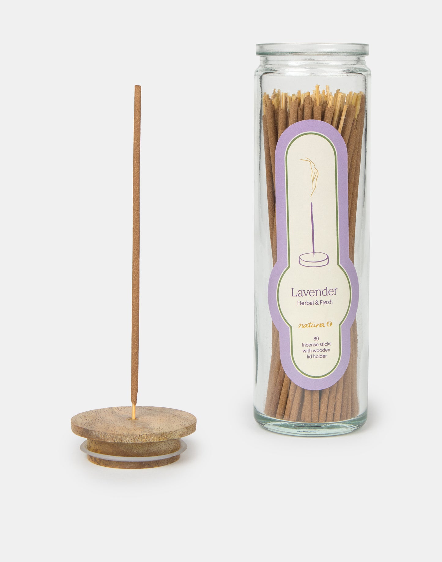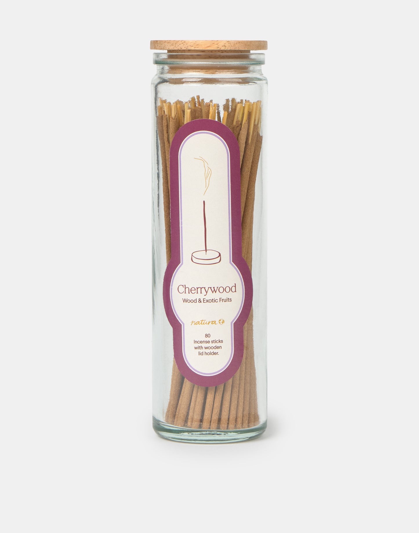 Tubo di vetro con 80 bastoncini di diversi aromi. Il coperchio di legno funge da porta incenso ed è sicuro per lasciare accesi i bastoncini.