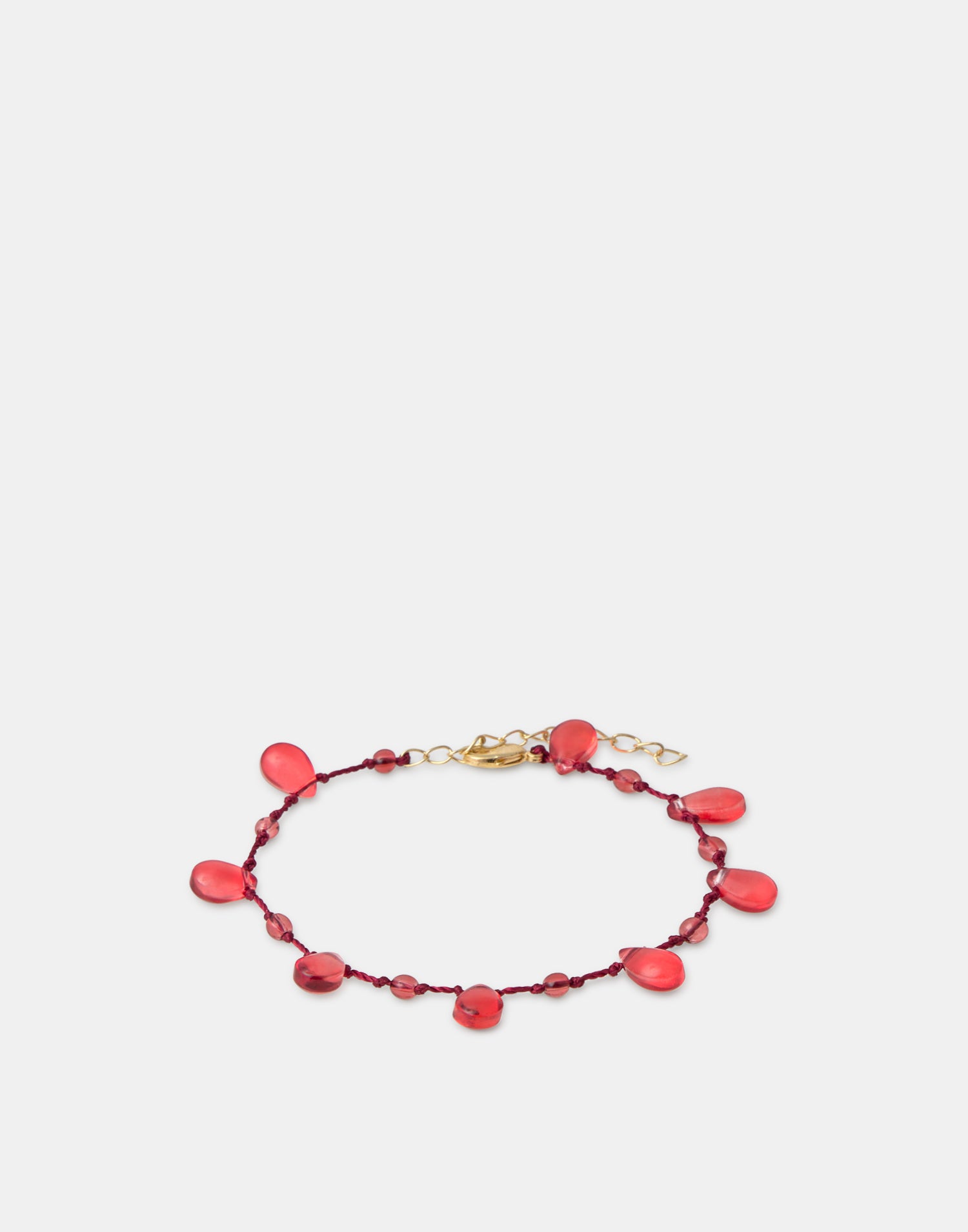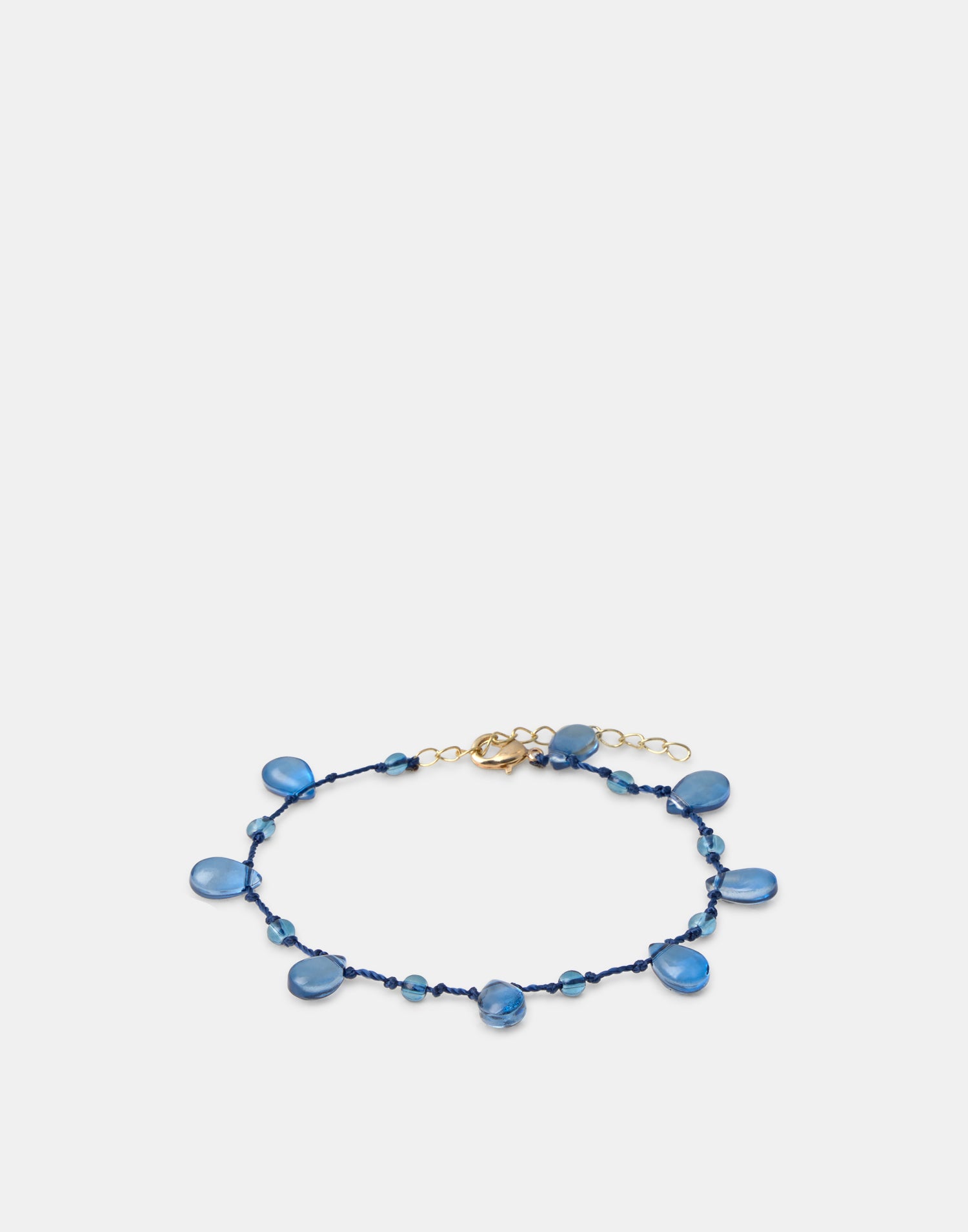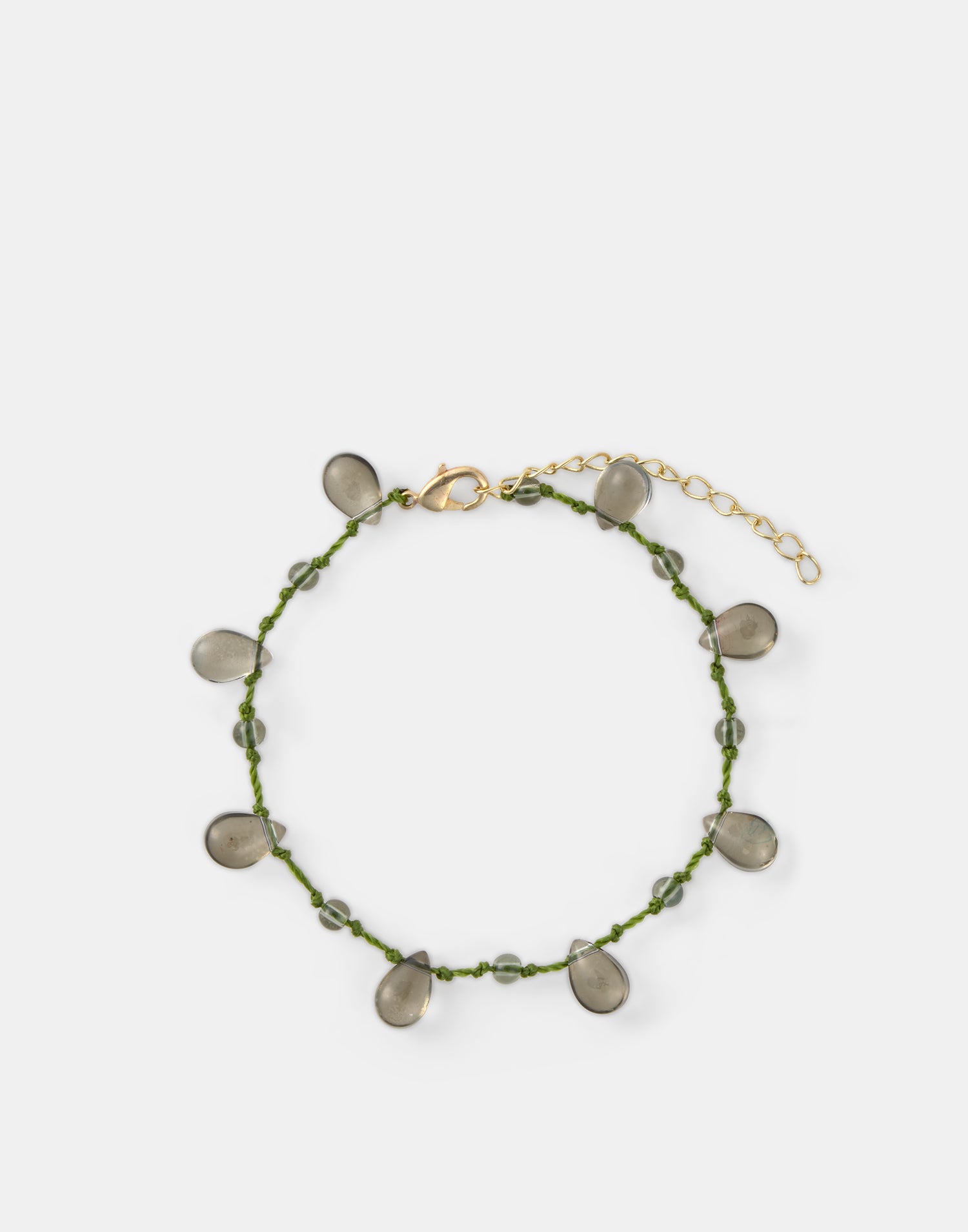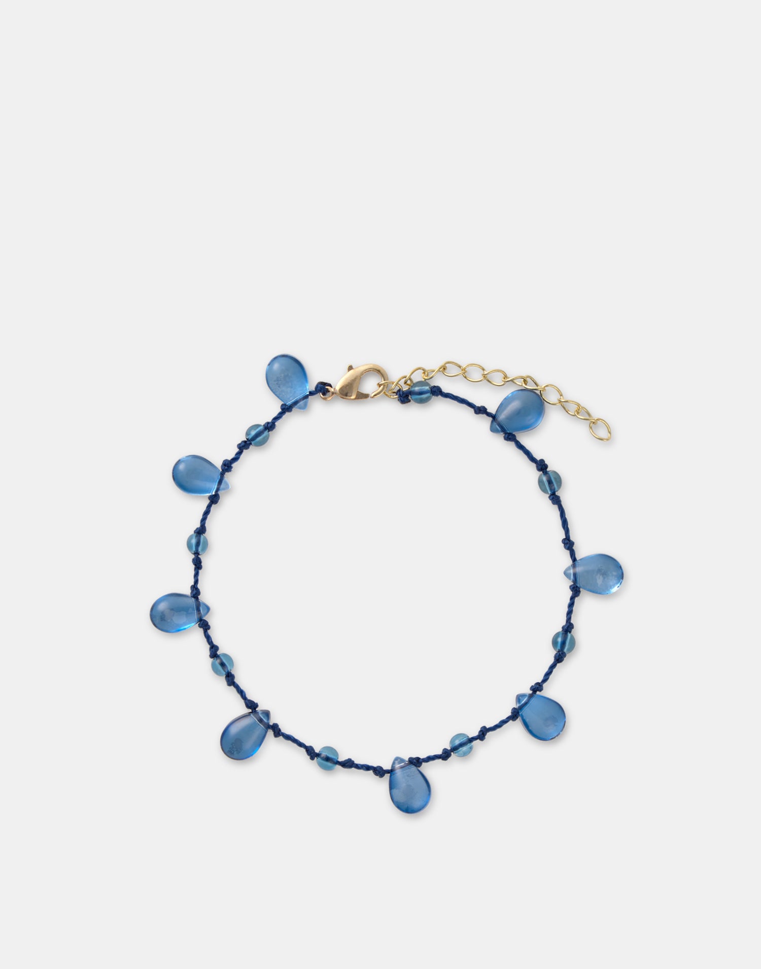 Bracciale in filo con perline a forma di goccia. Chiusura a catena regolabile con moschettone.