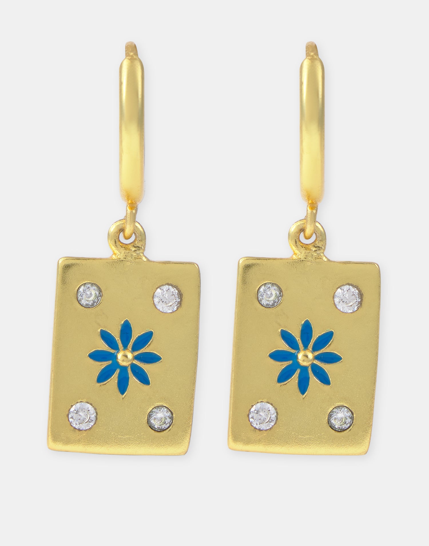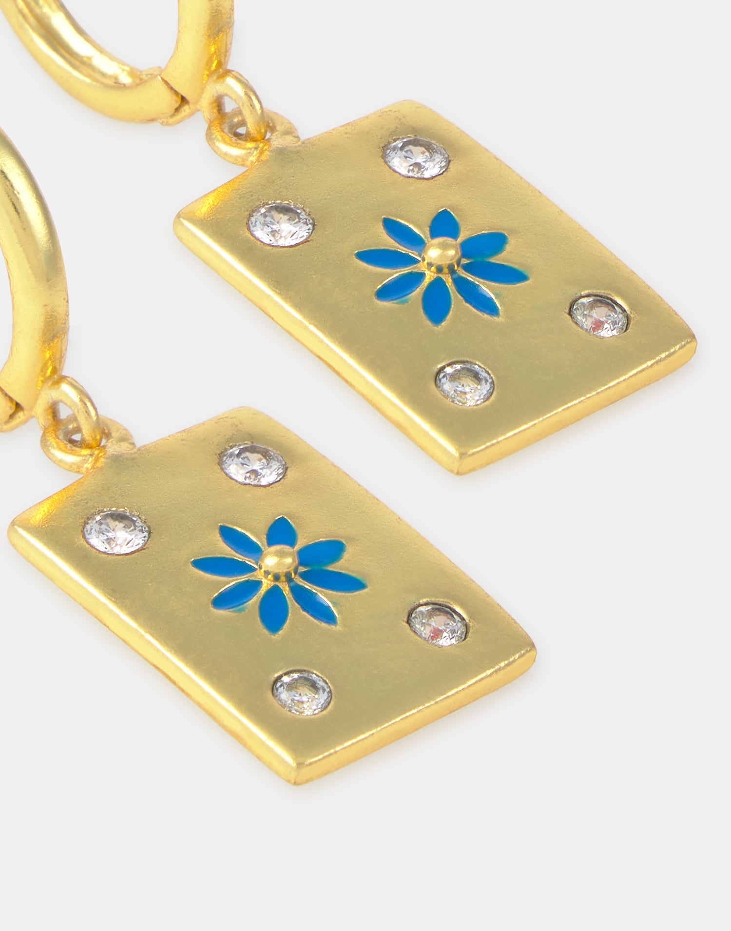 Piccoli orecchini dorati a cerchio con pendente e applicazione di gioielli.