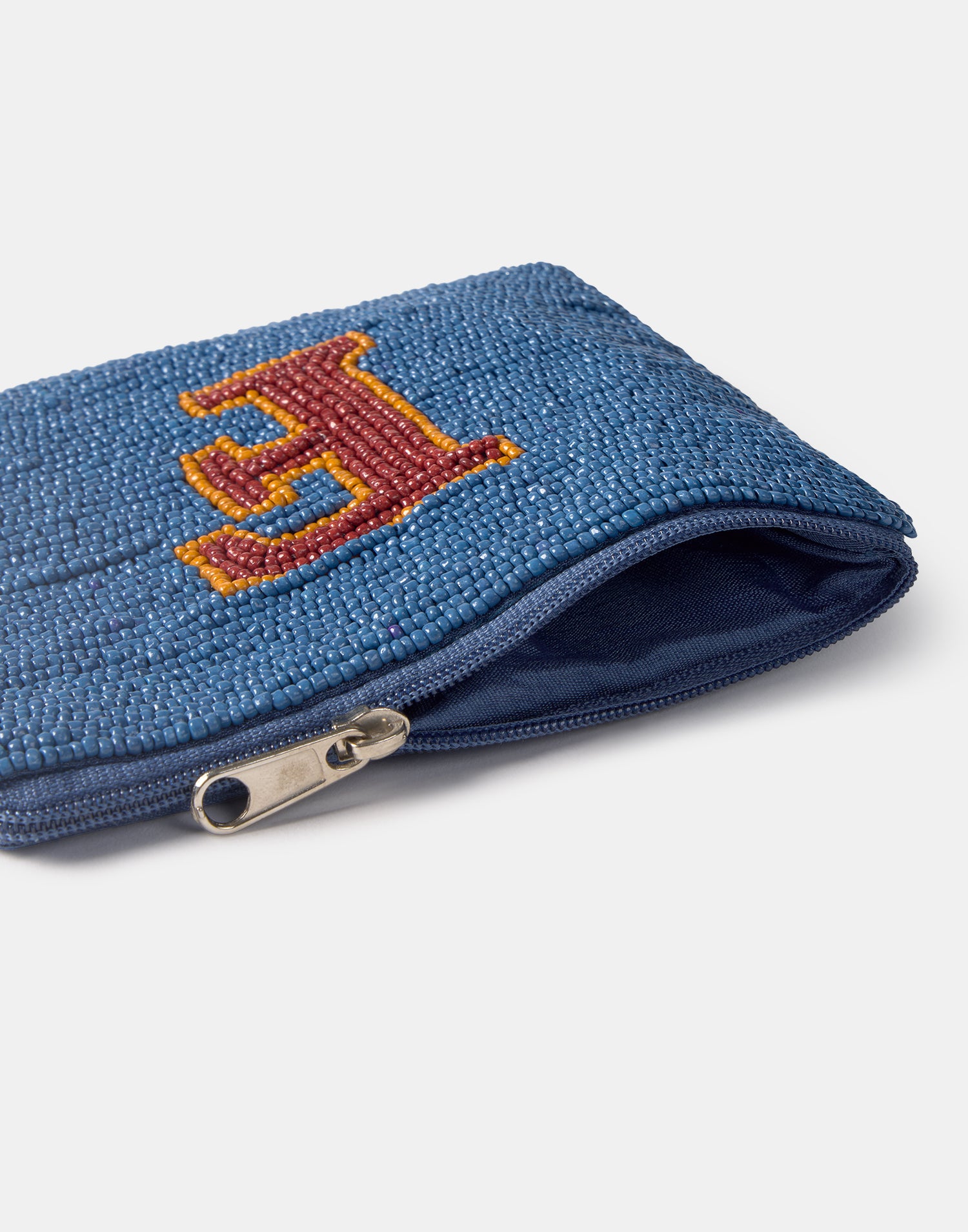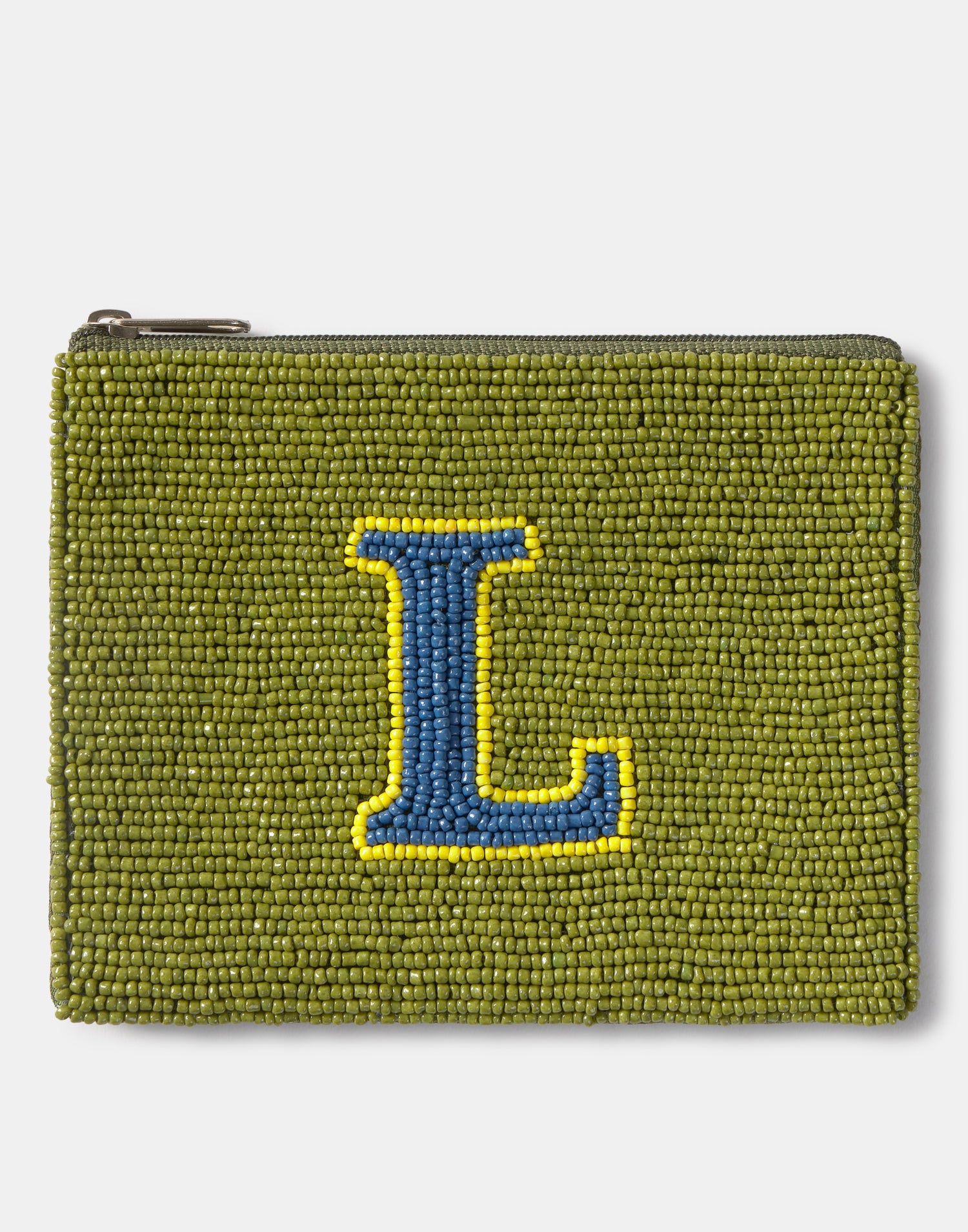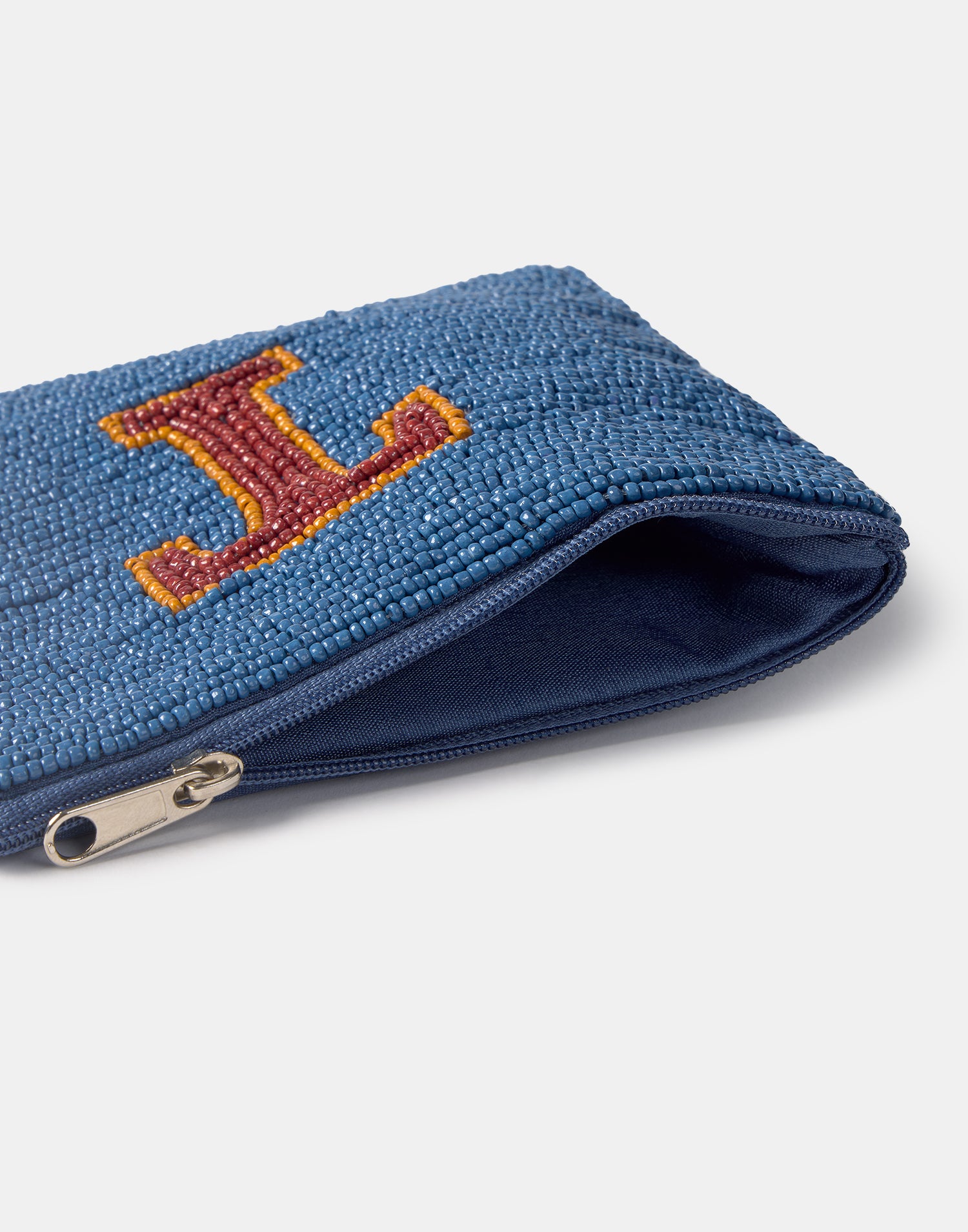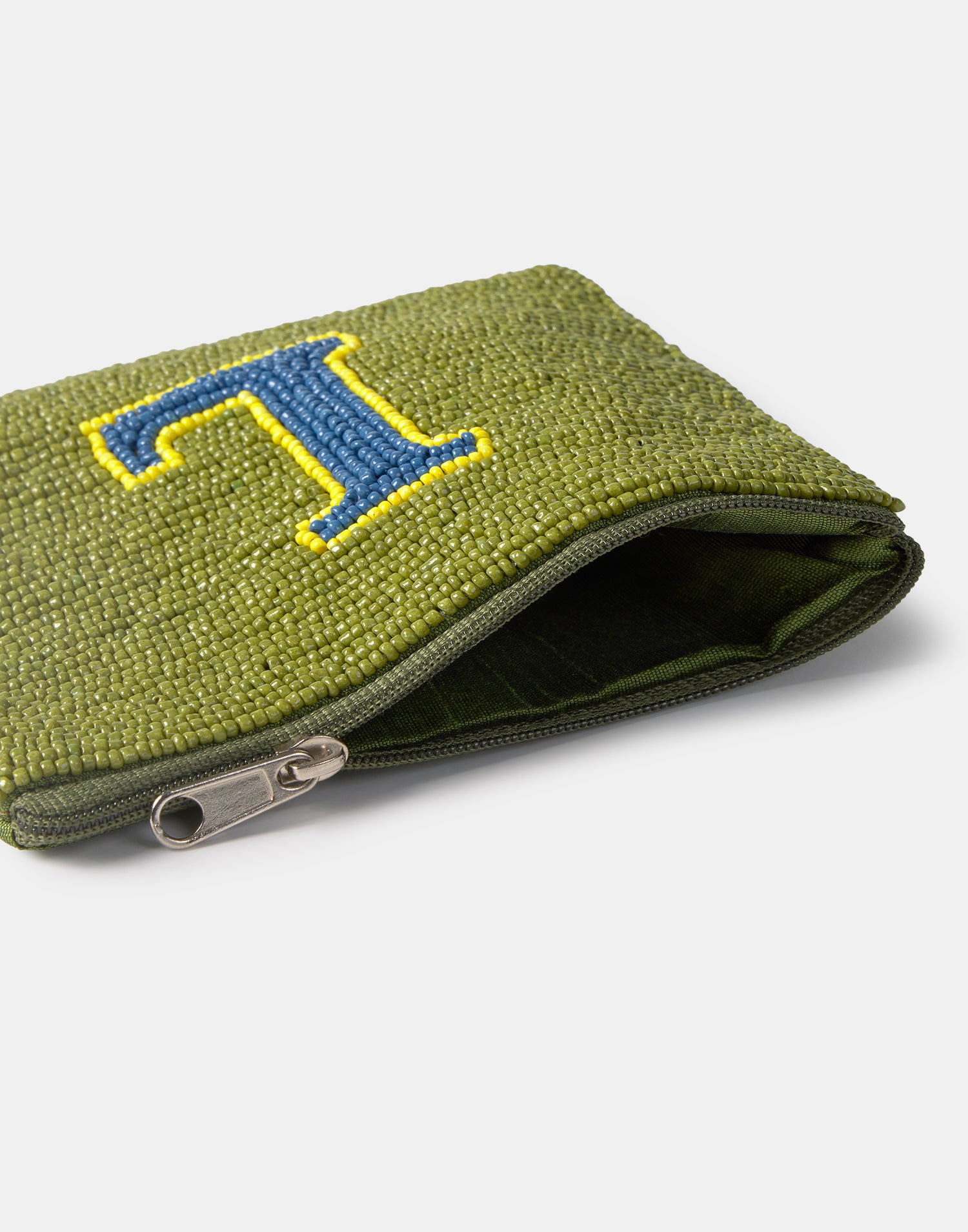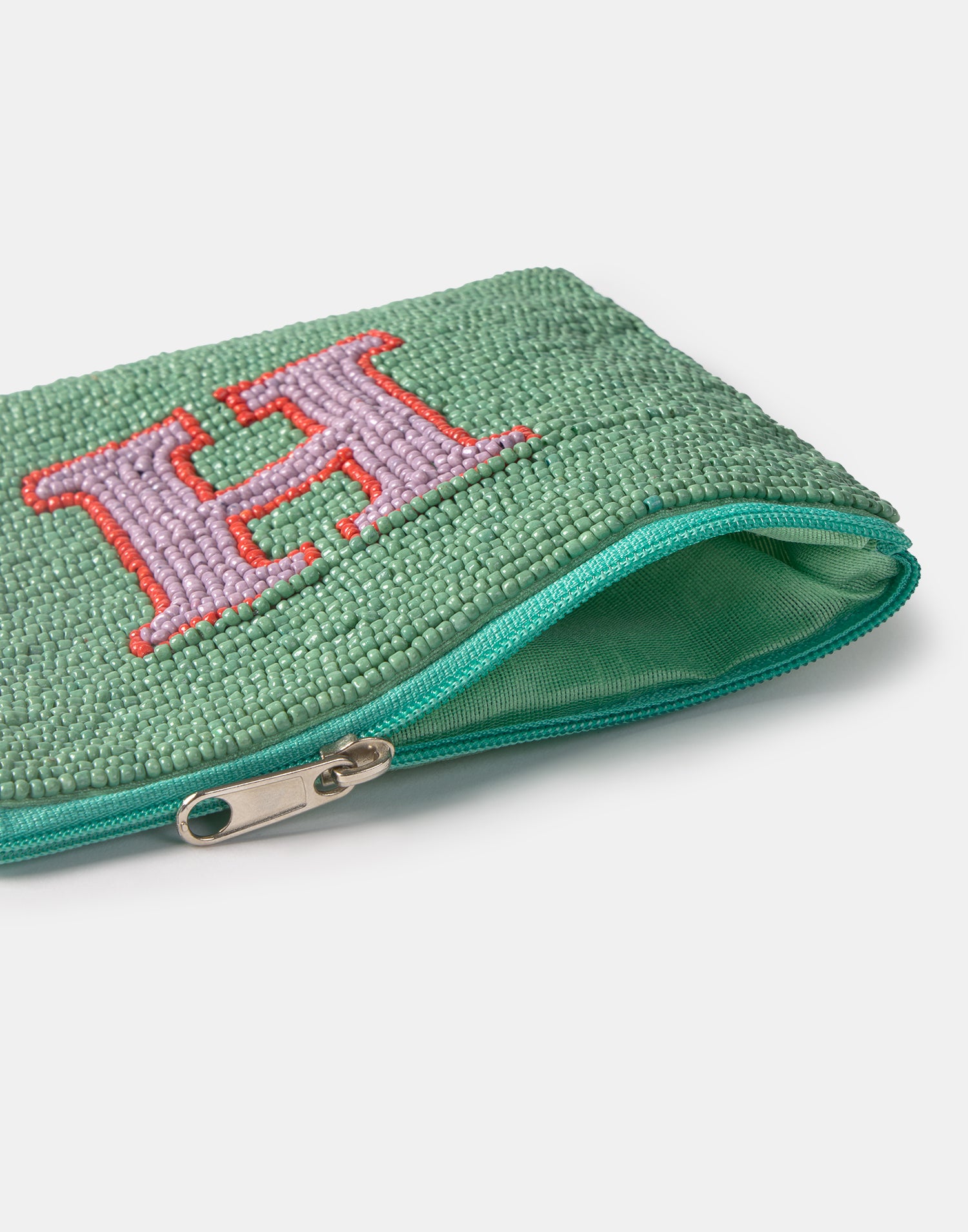 Piccolo astuccio multiuso con chiusura a zip superiore. Parte frontale decorata con iniziali realizzate con perline di vetro.
