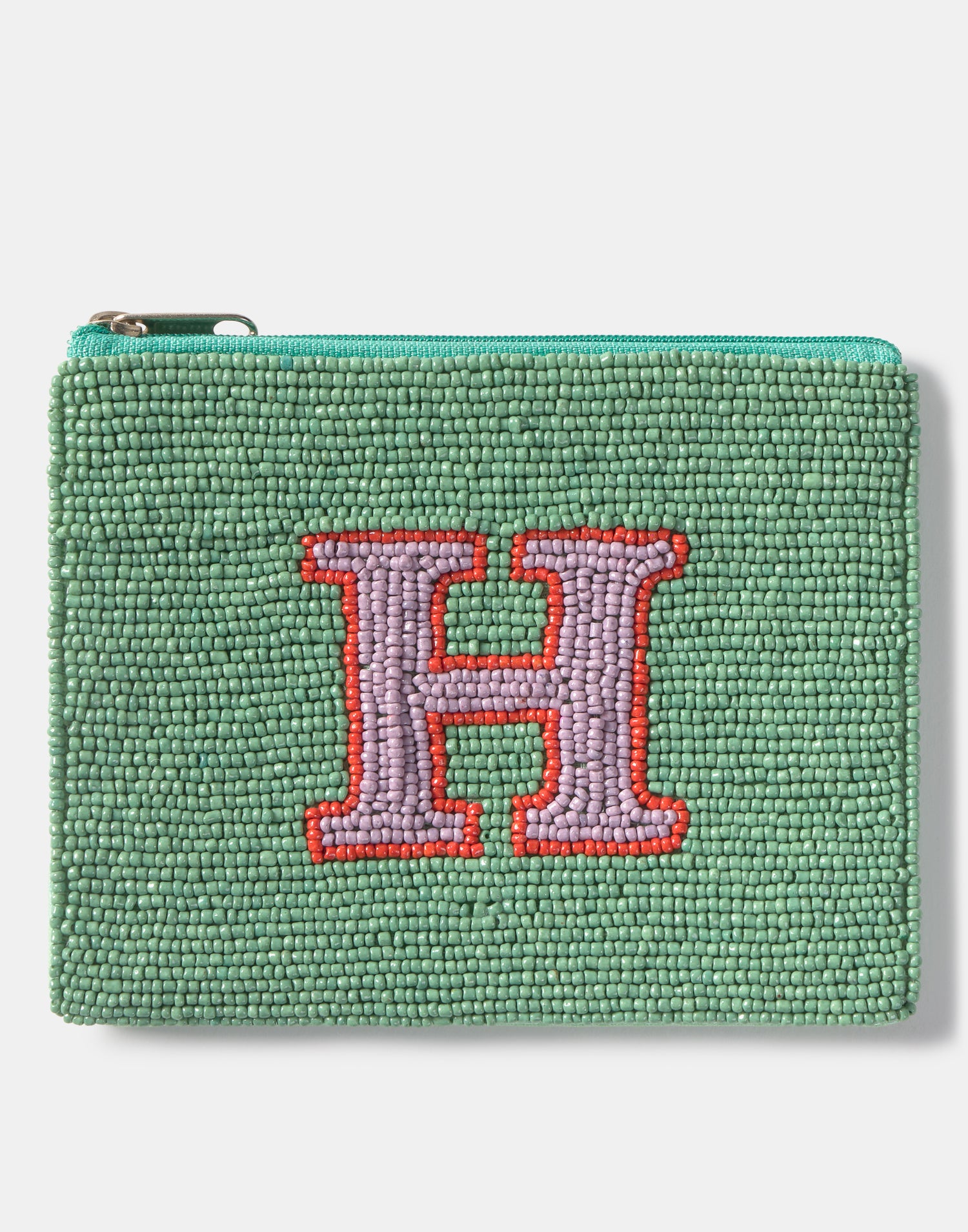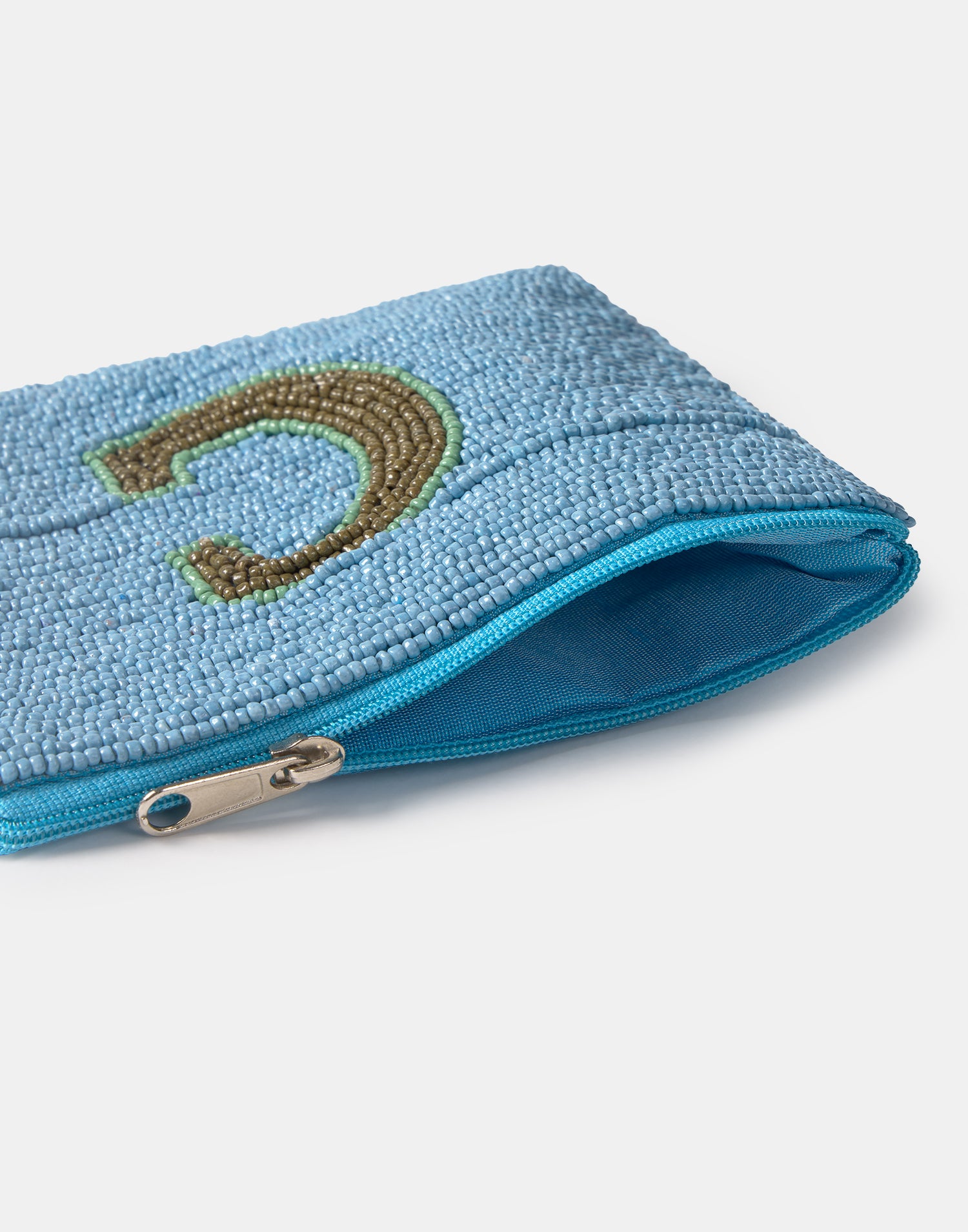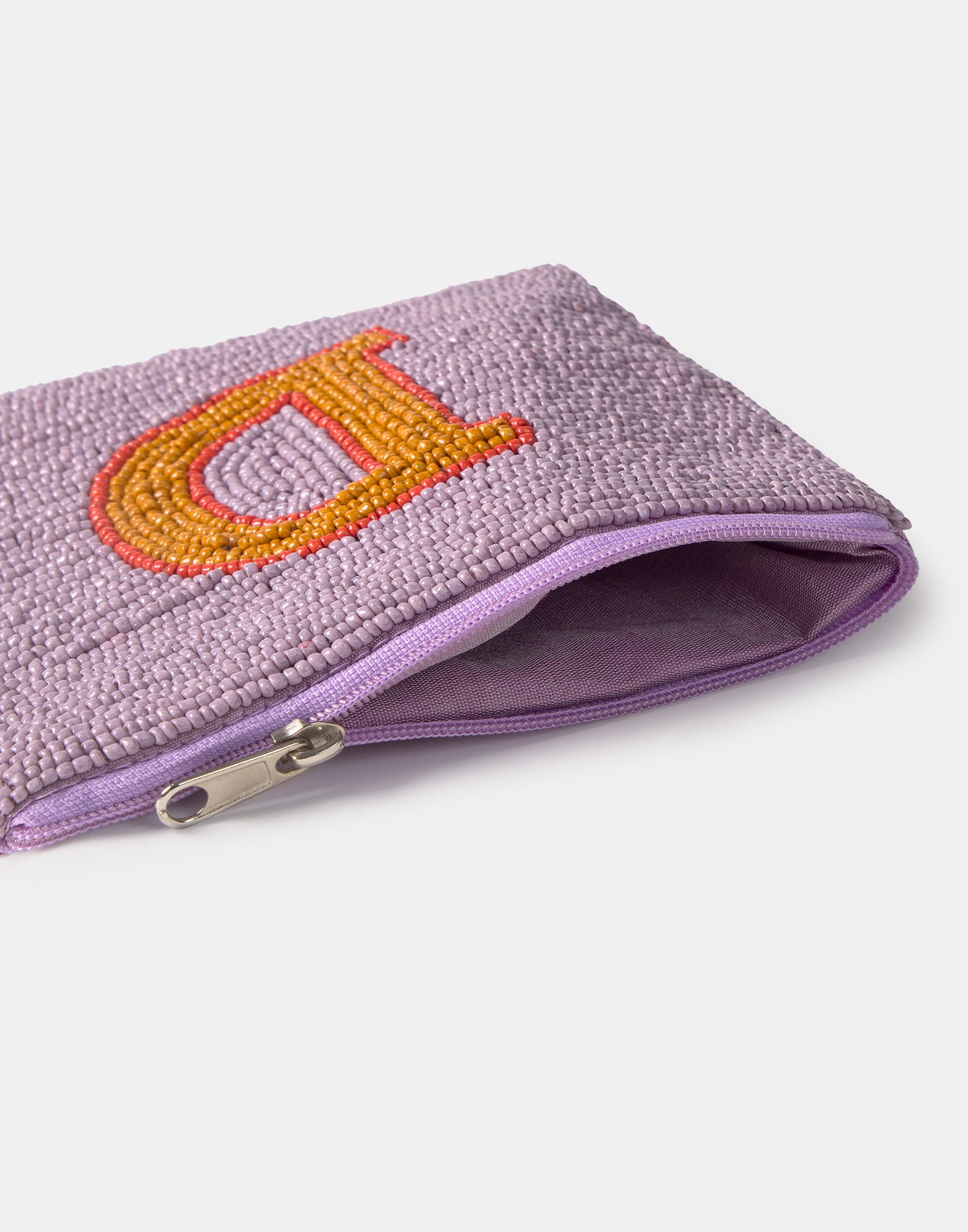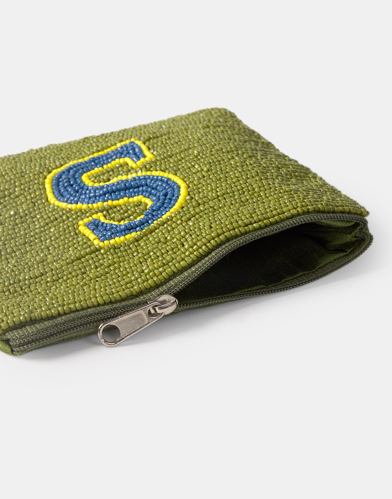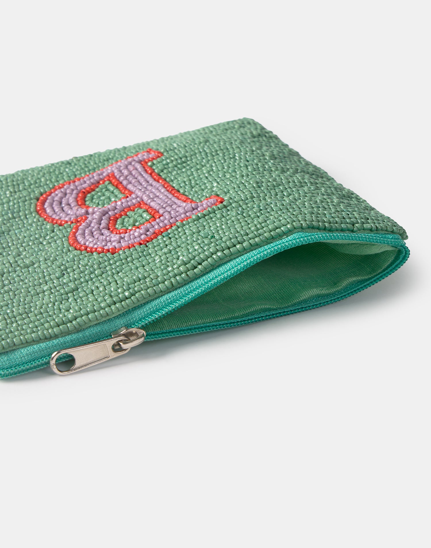 Piccolo astuccio multiuso con chiusura a zip superiore. Parte frontale decorata con iniziali realizzate con perline di vetro.