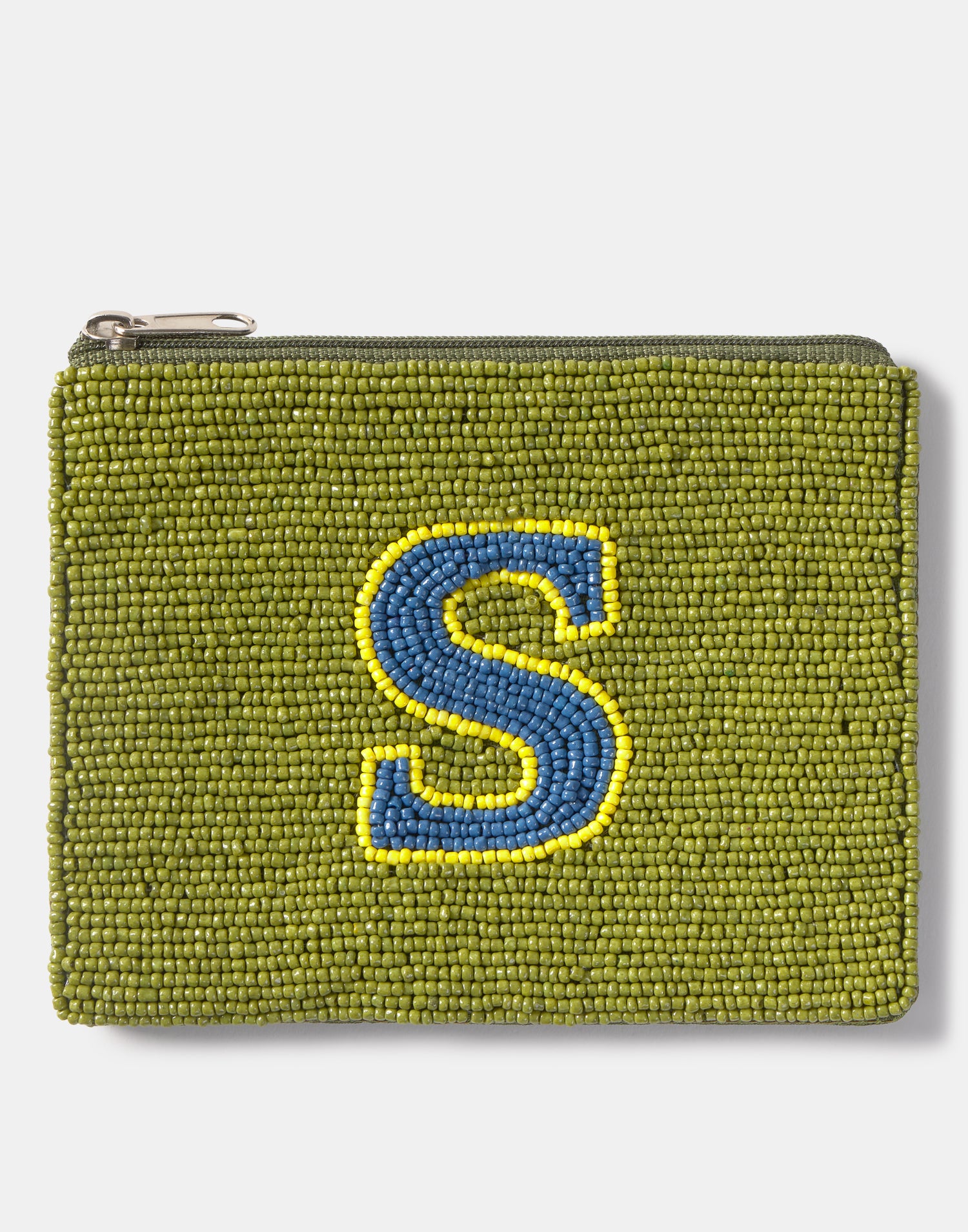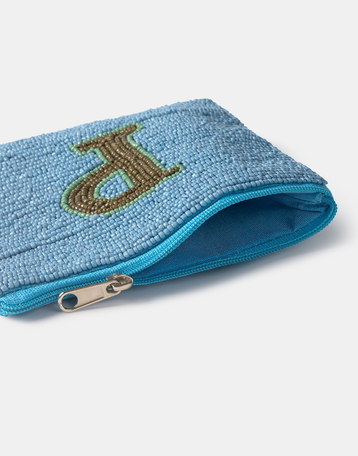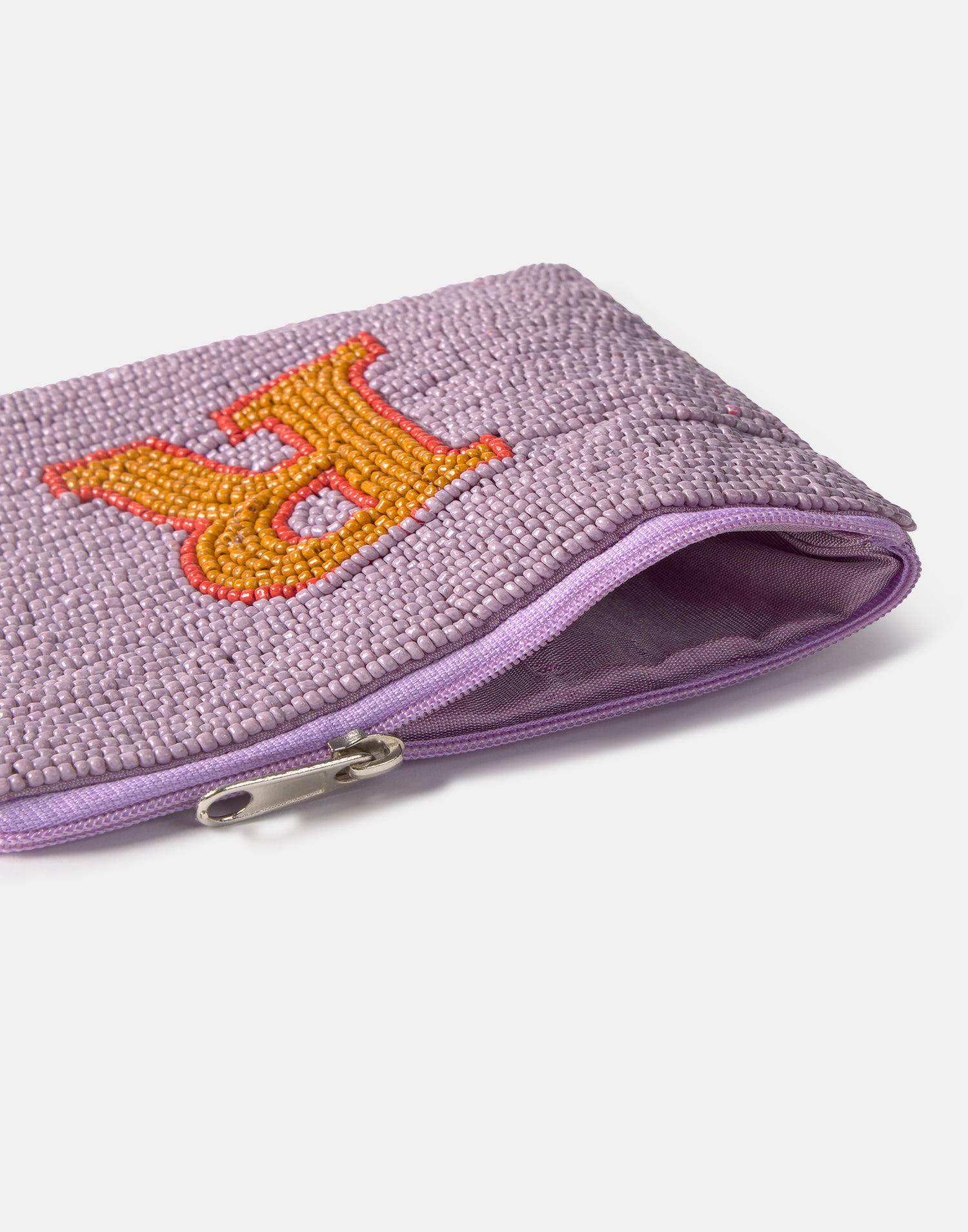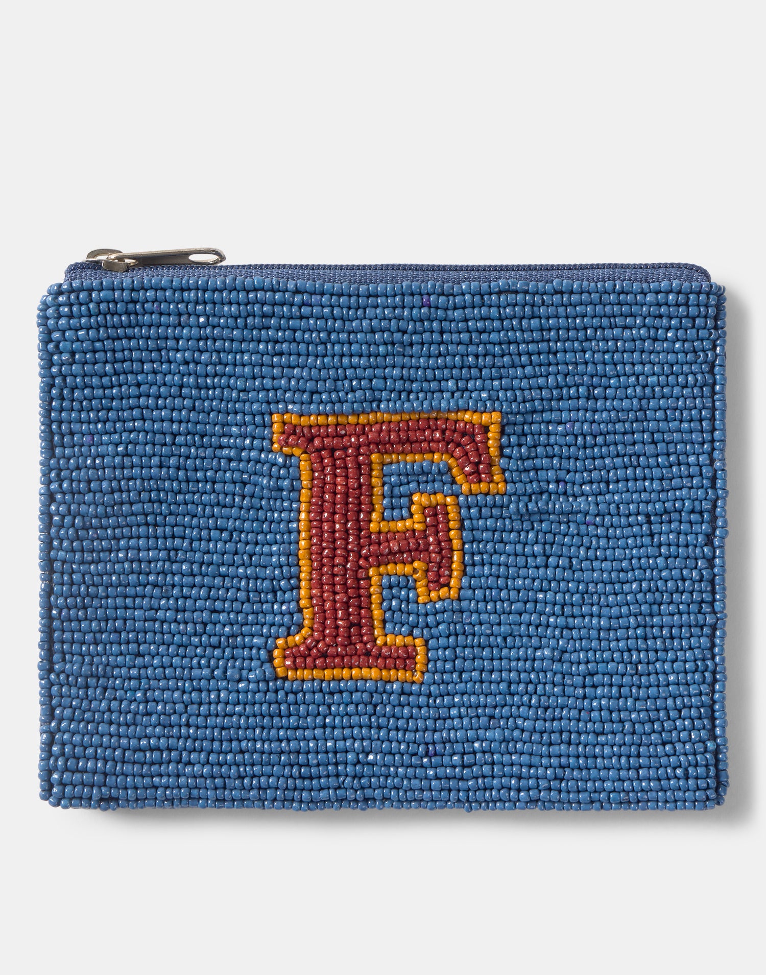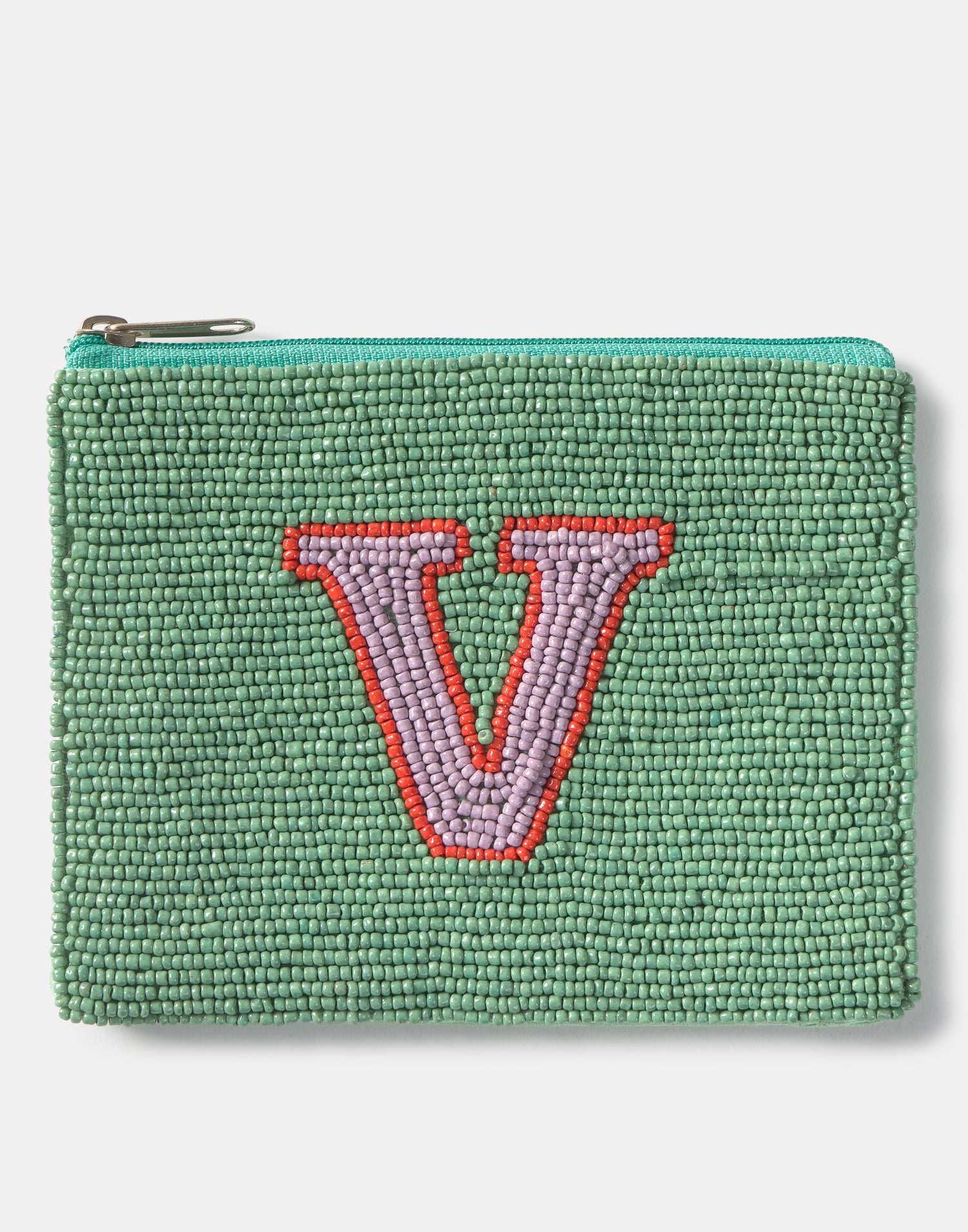 Piccolo astuccio multiuso con chiusura a zip superiore. Parte frontale decorata con iniziali realizzate con perline di vetro.