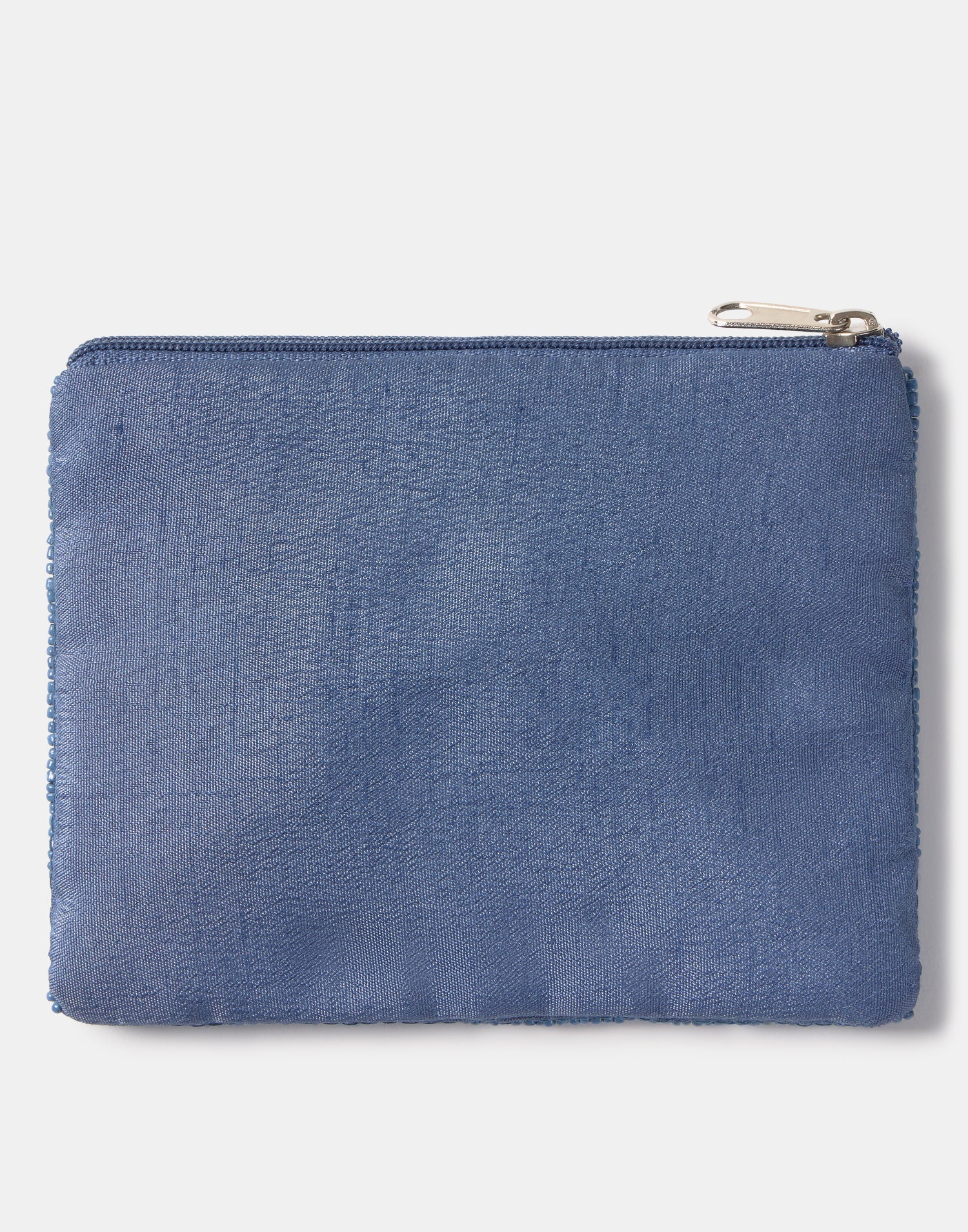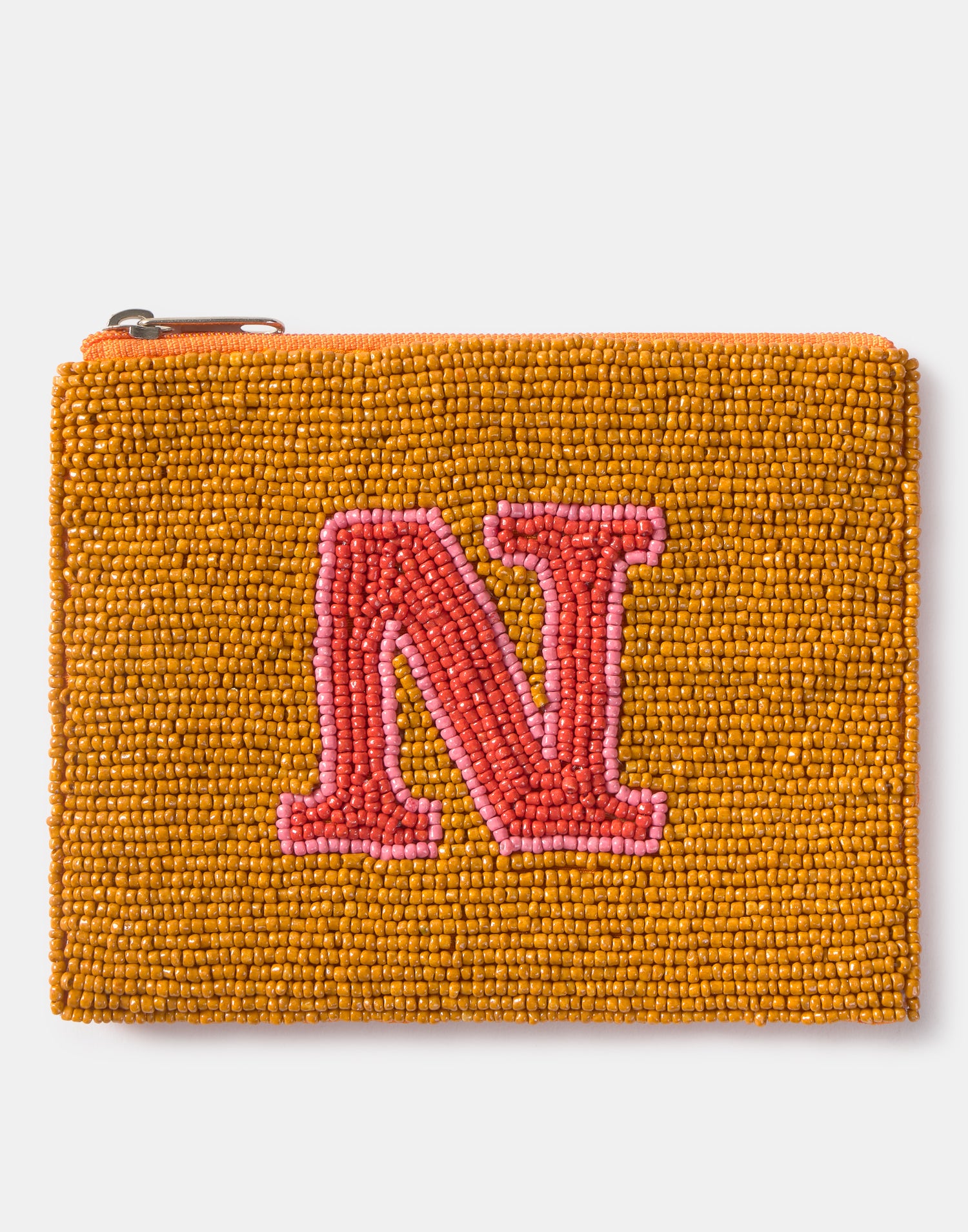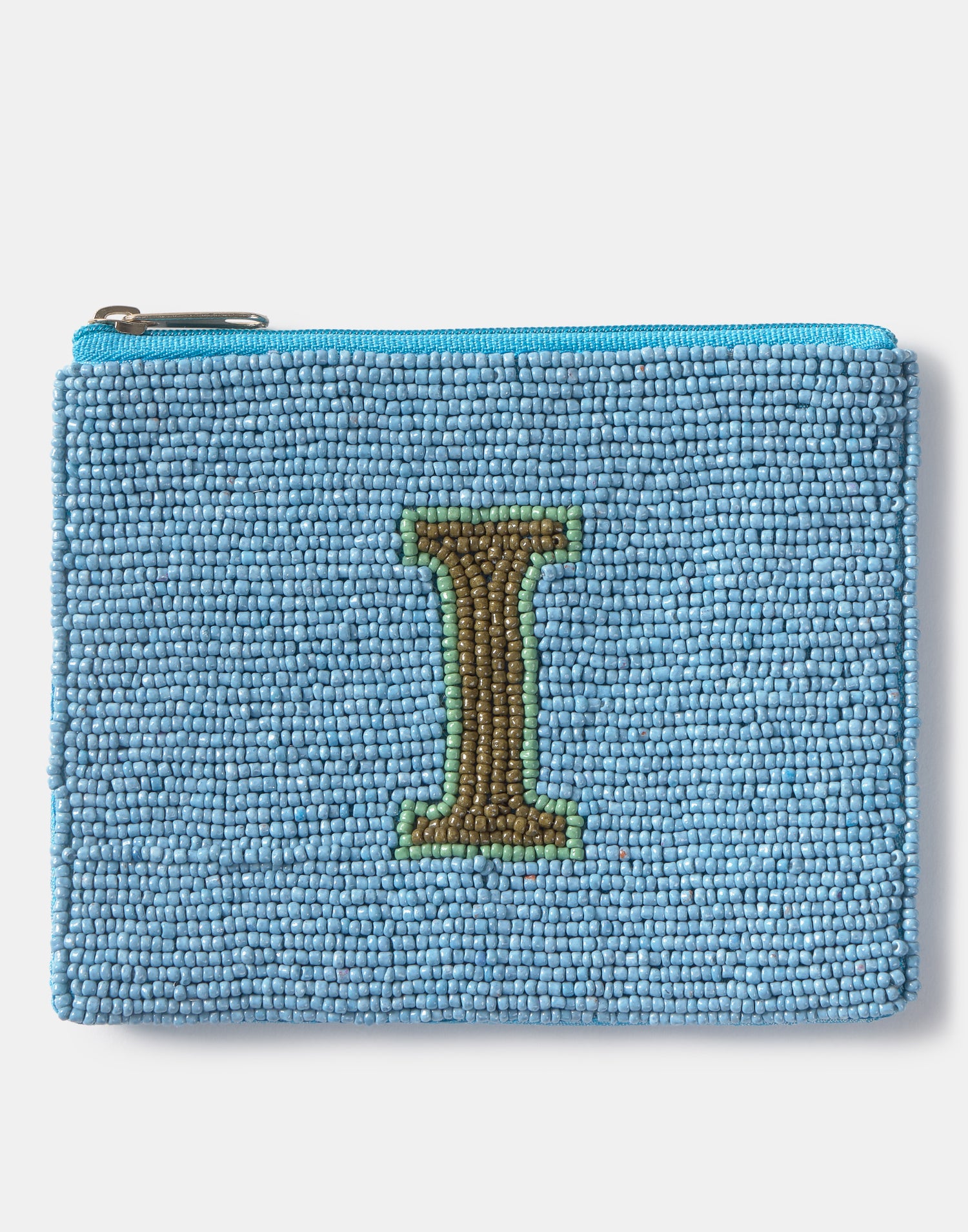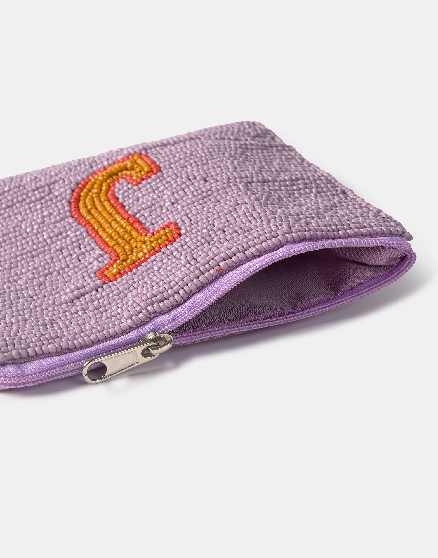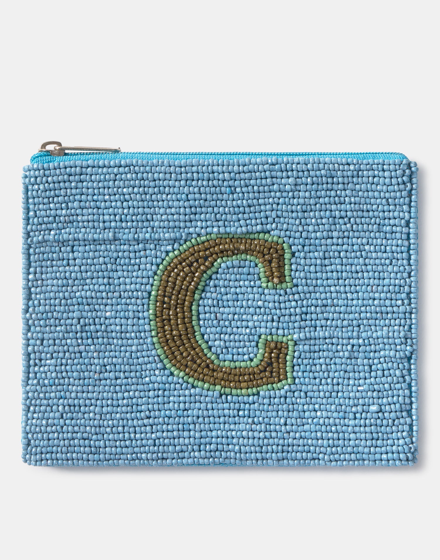 Piccolo astuccio multiuso con chiusura a zip superiore. Parte frontale decorata con iniziali realizzate con perline di vetro.