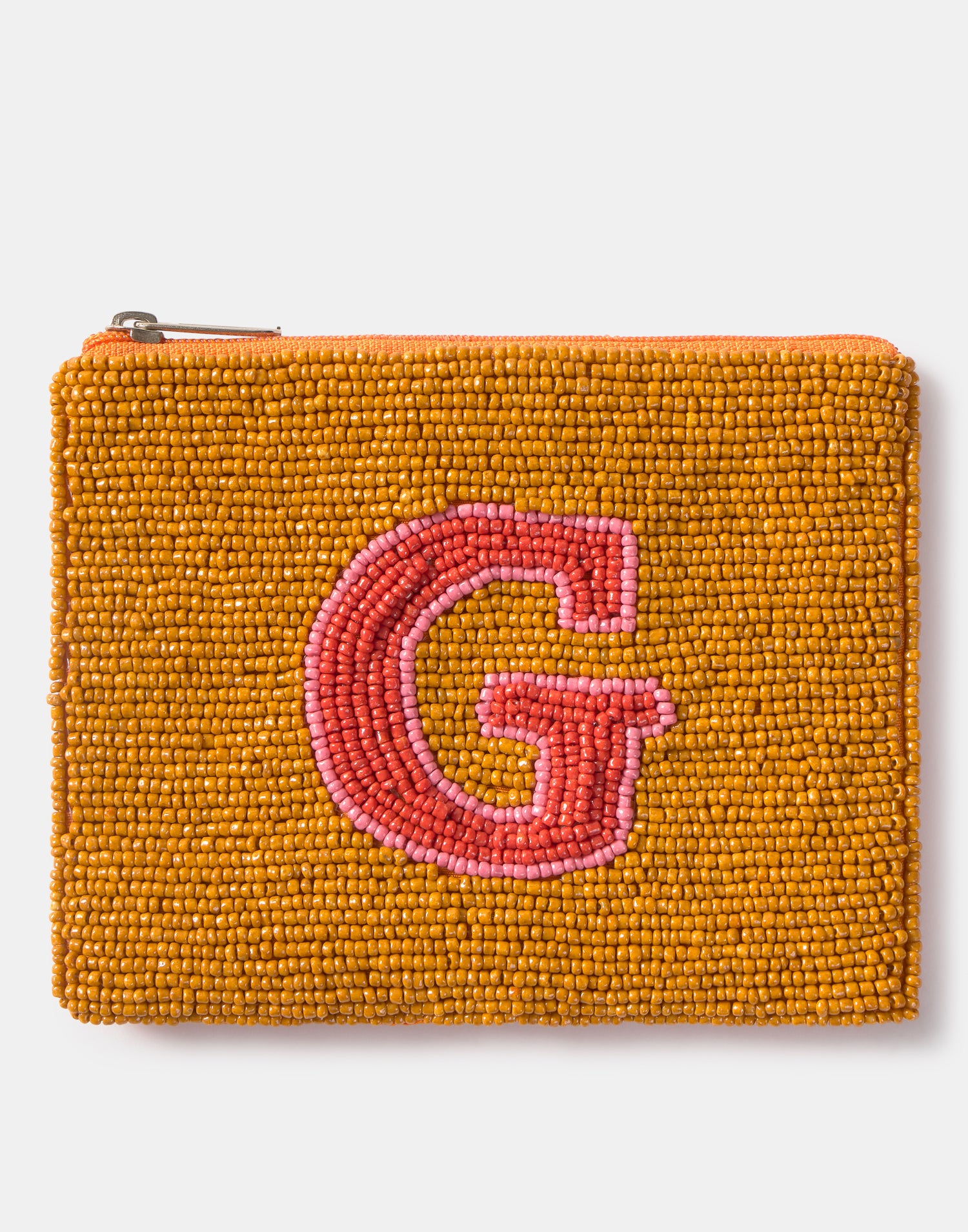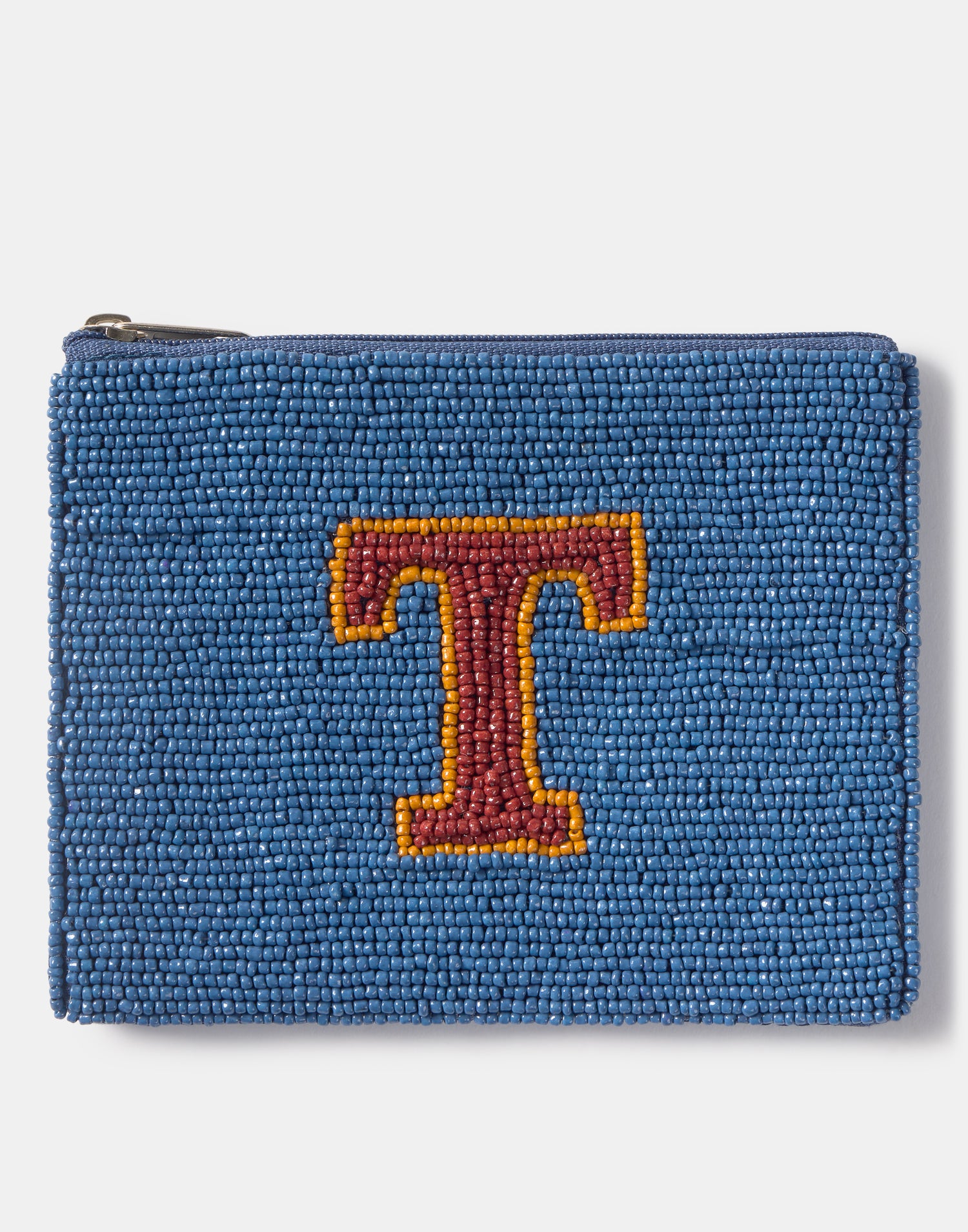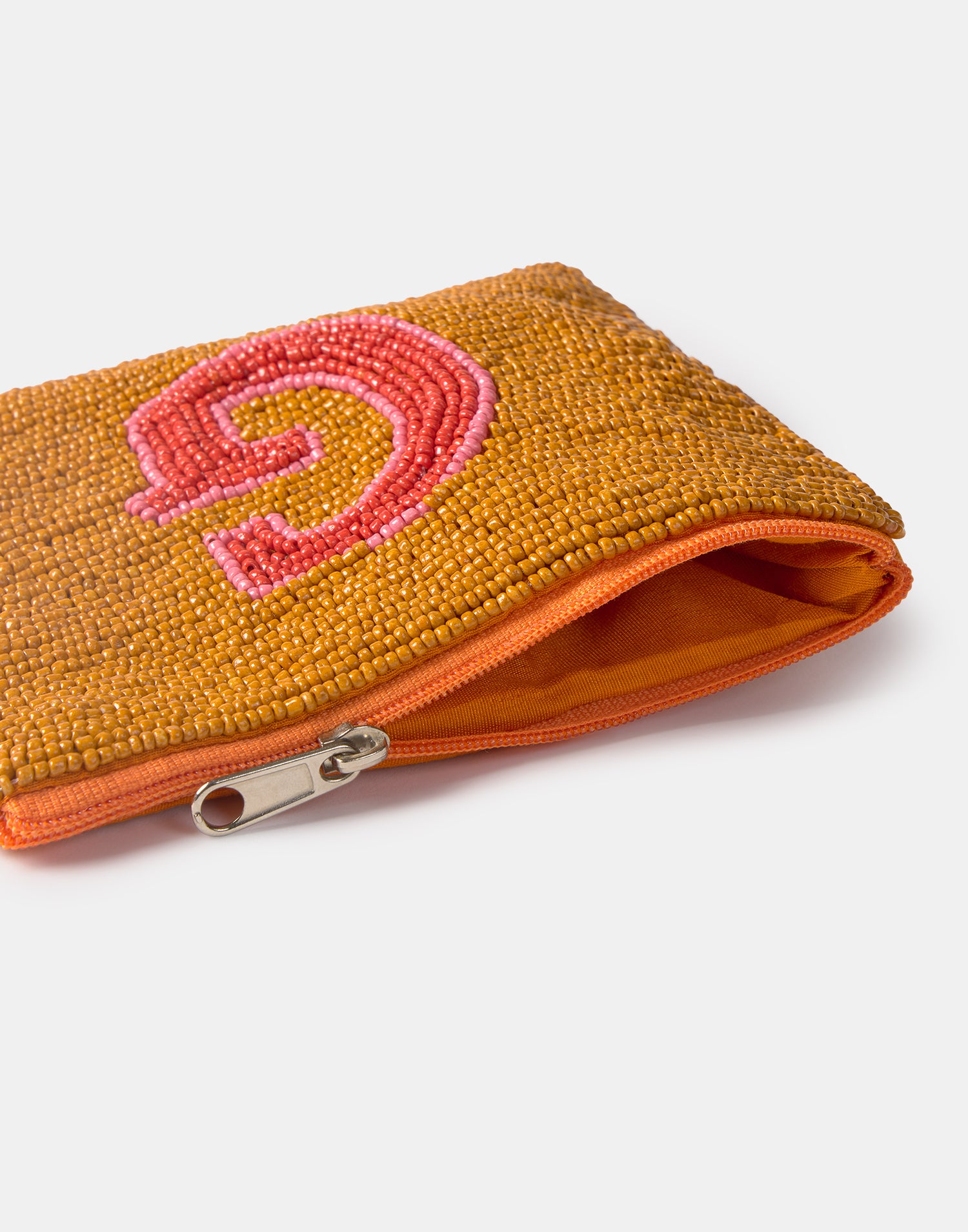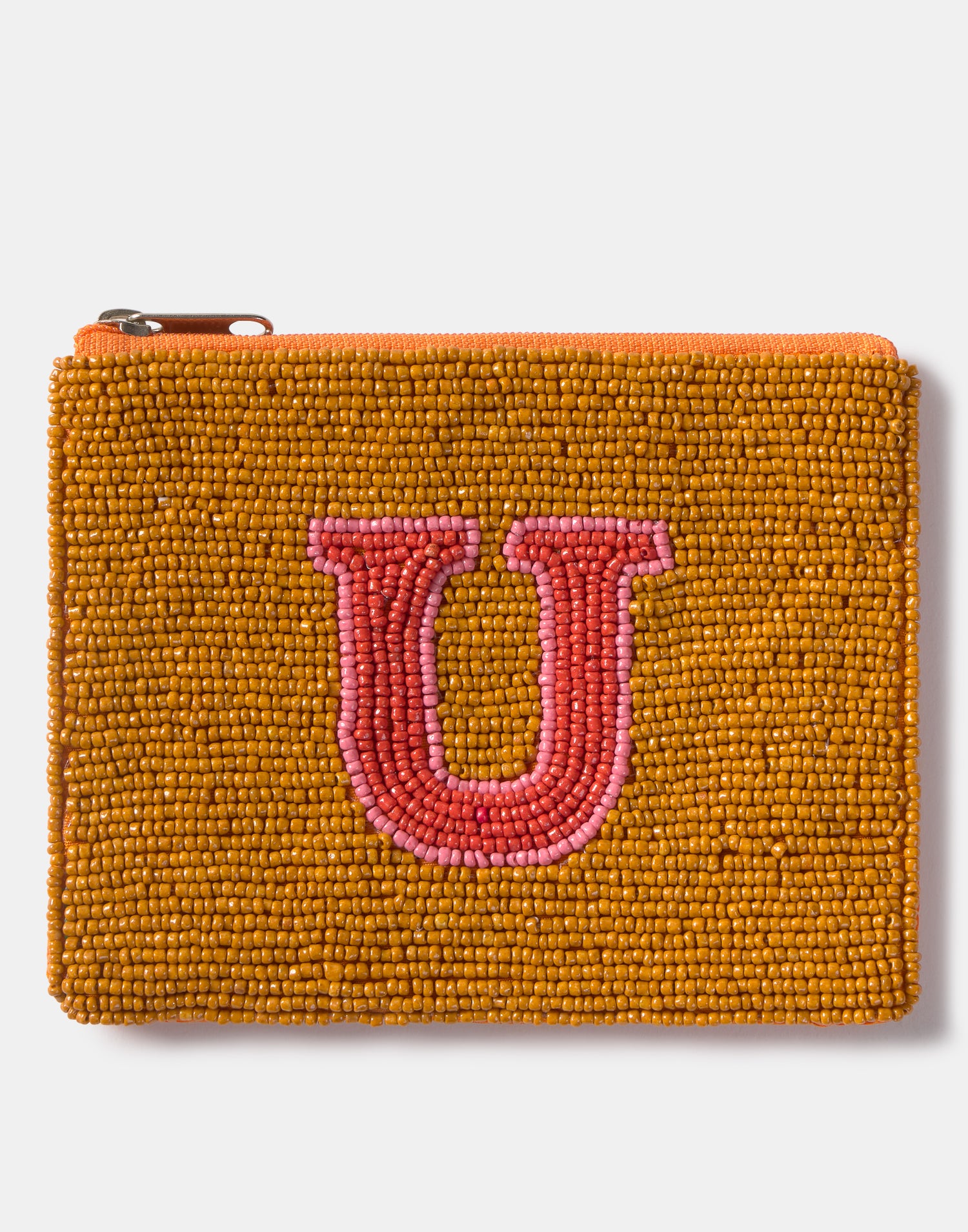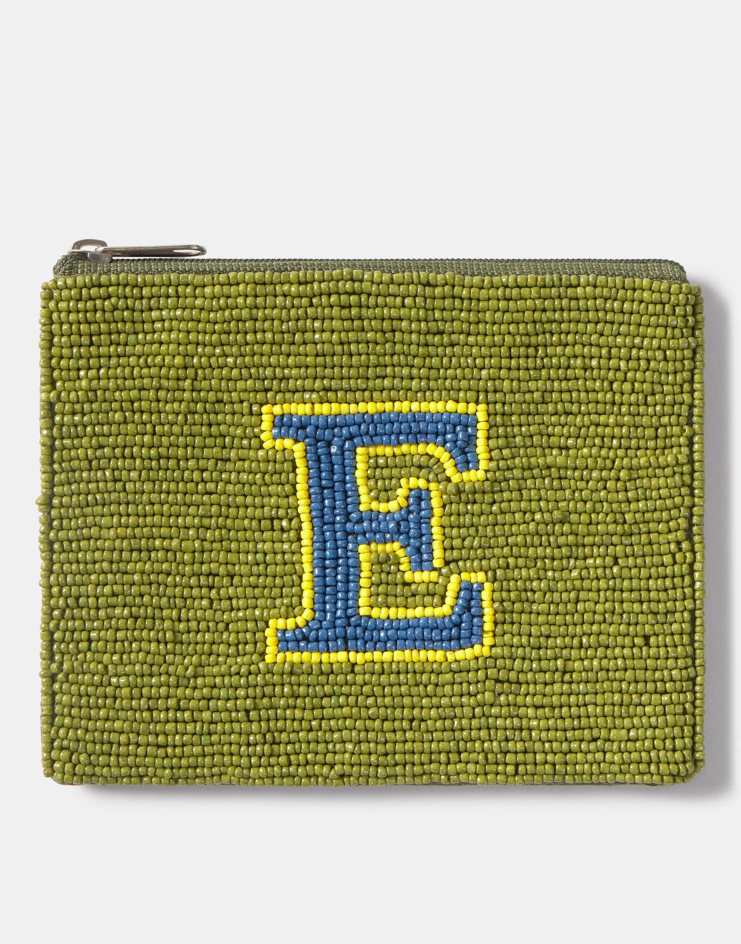Piccolo astuccio multiuso con chiusura a zip superiore. Parte frontale decorata con iniziali realizzate con perline di vetro.