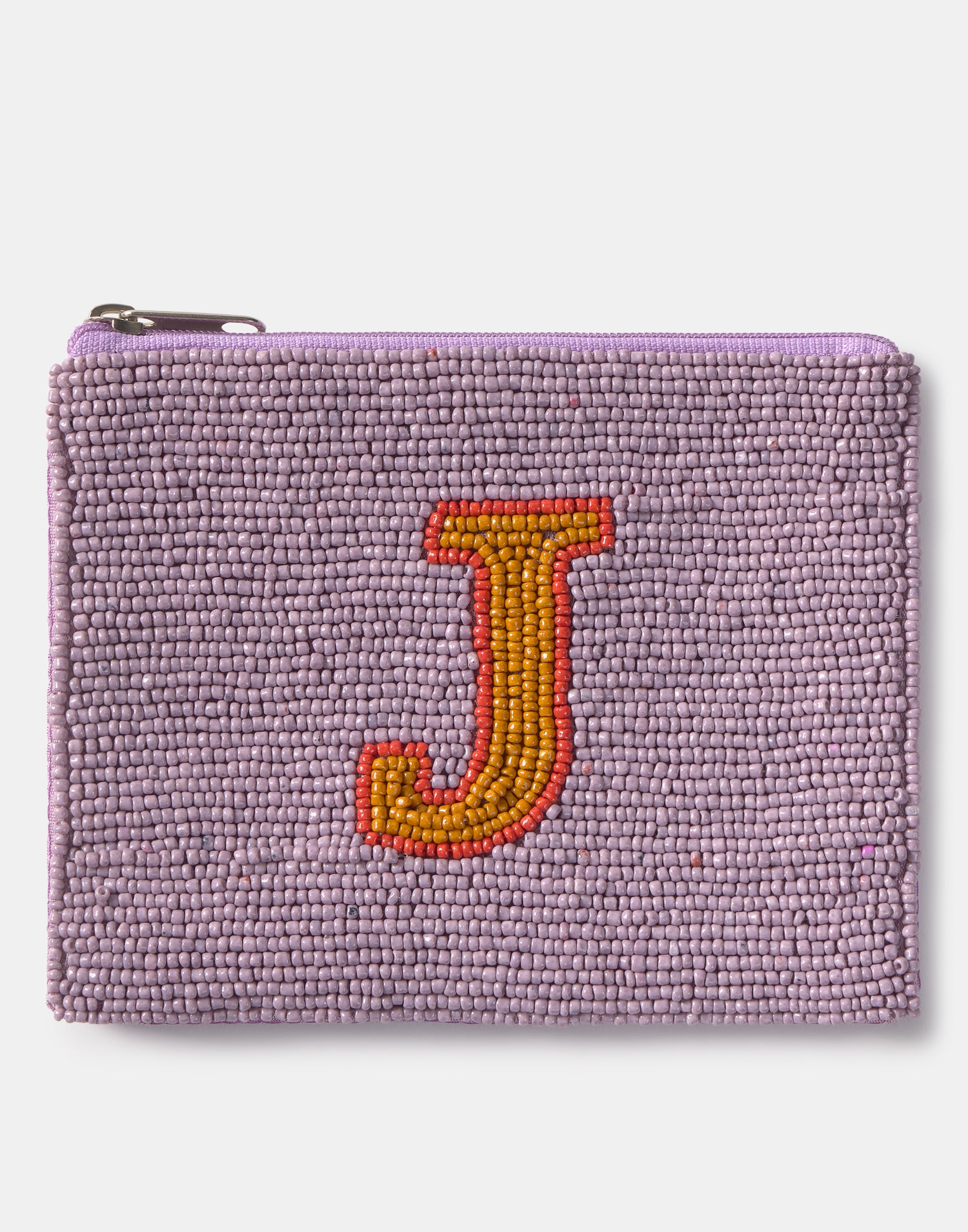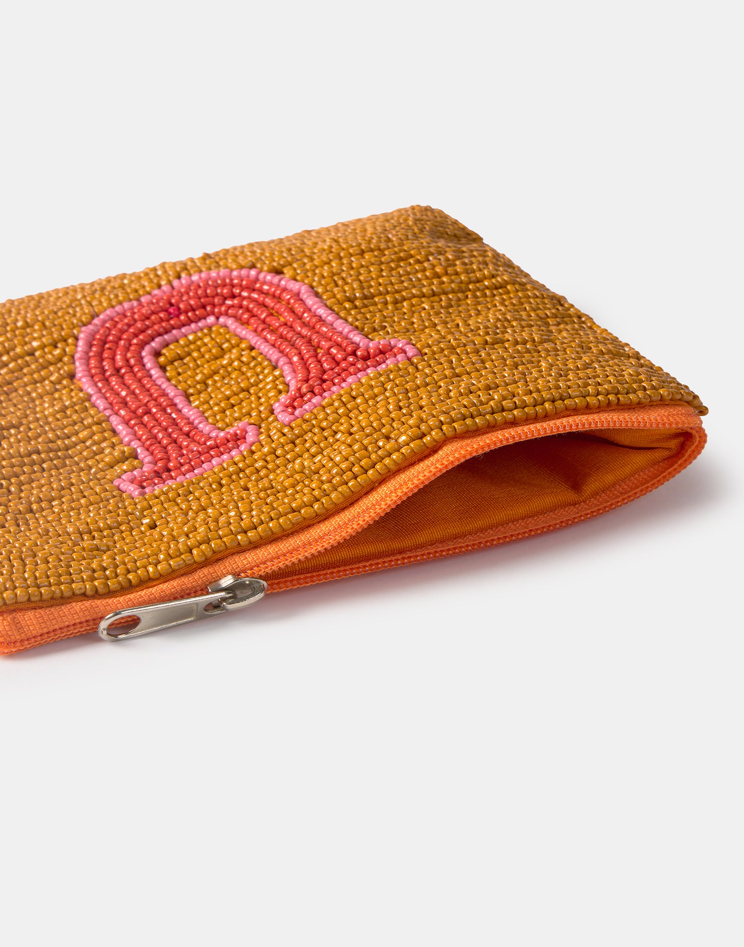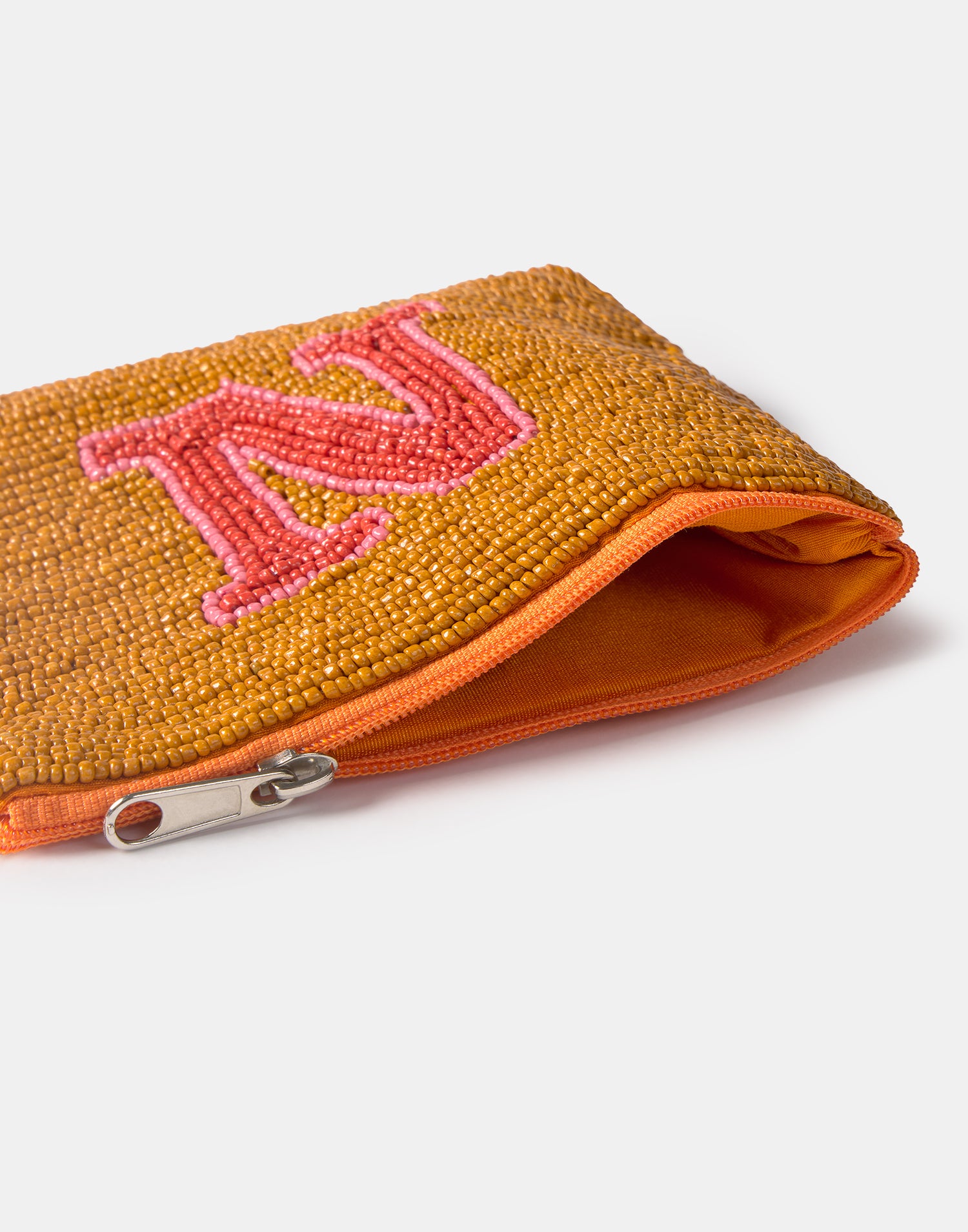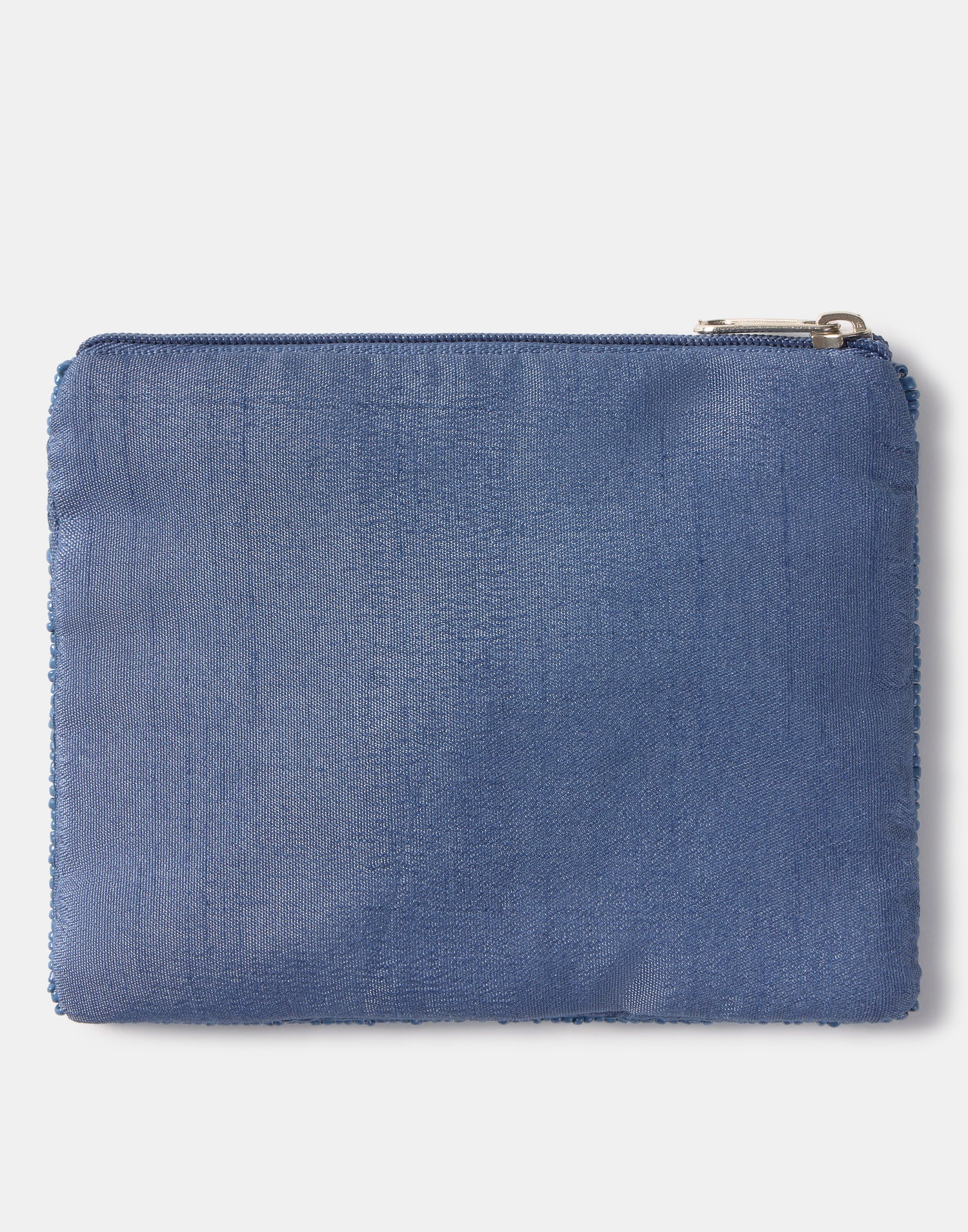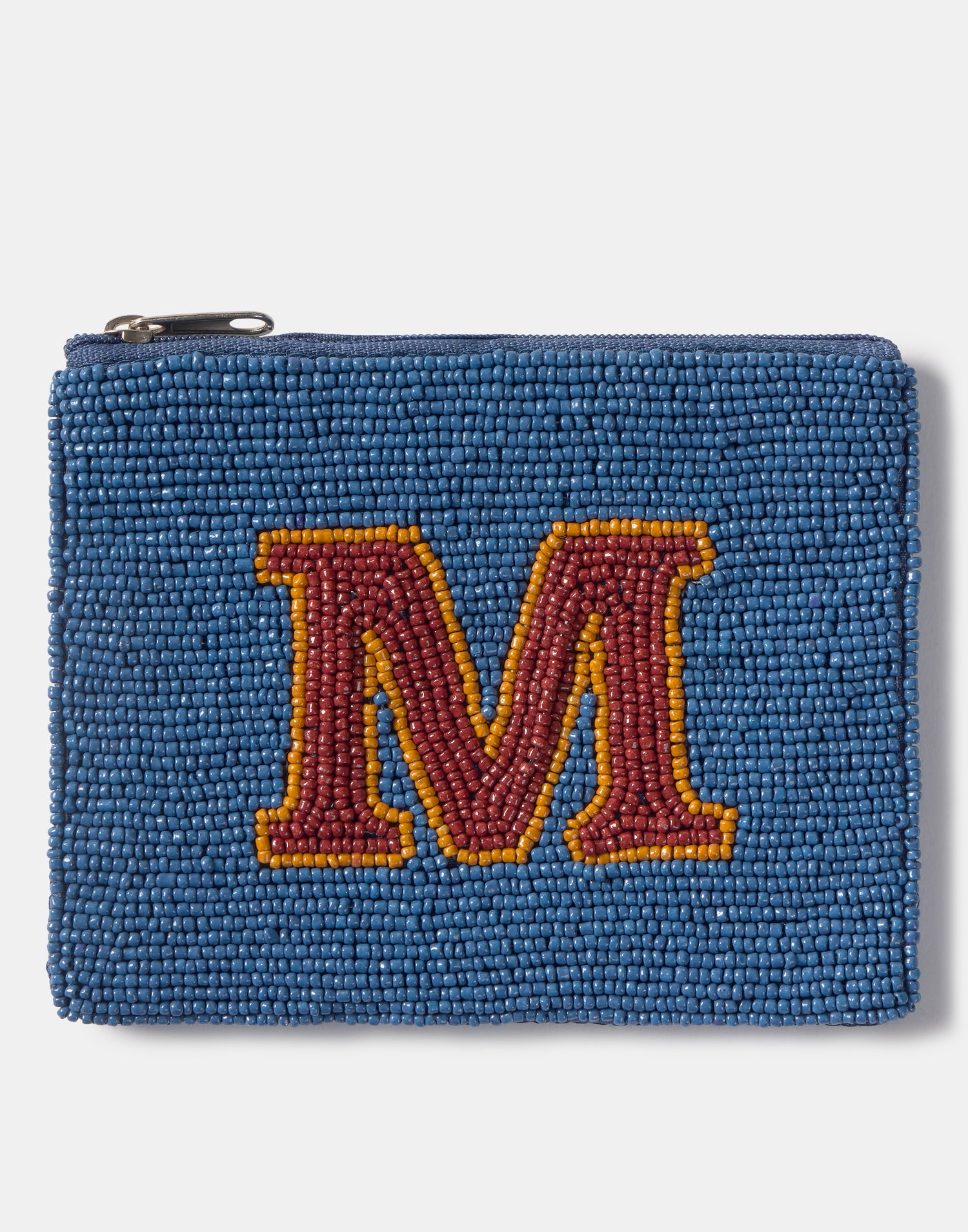 Piccolo astuccio multiuso con chiusura a zip superiore. Parte frontale decorata con iniziali realizzate con perline di vetro.