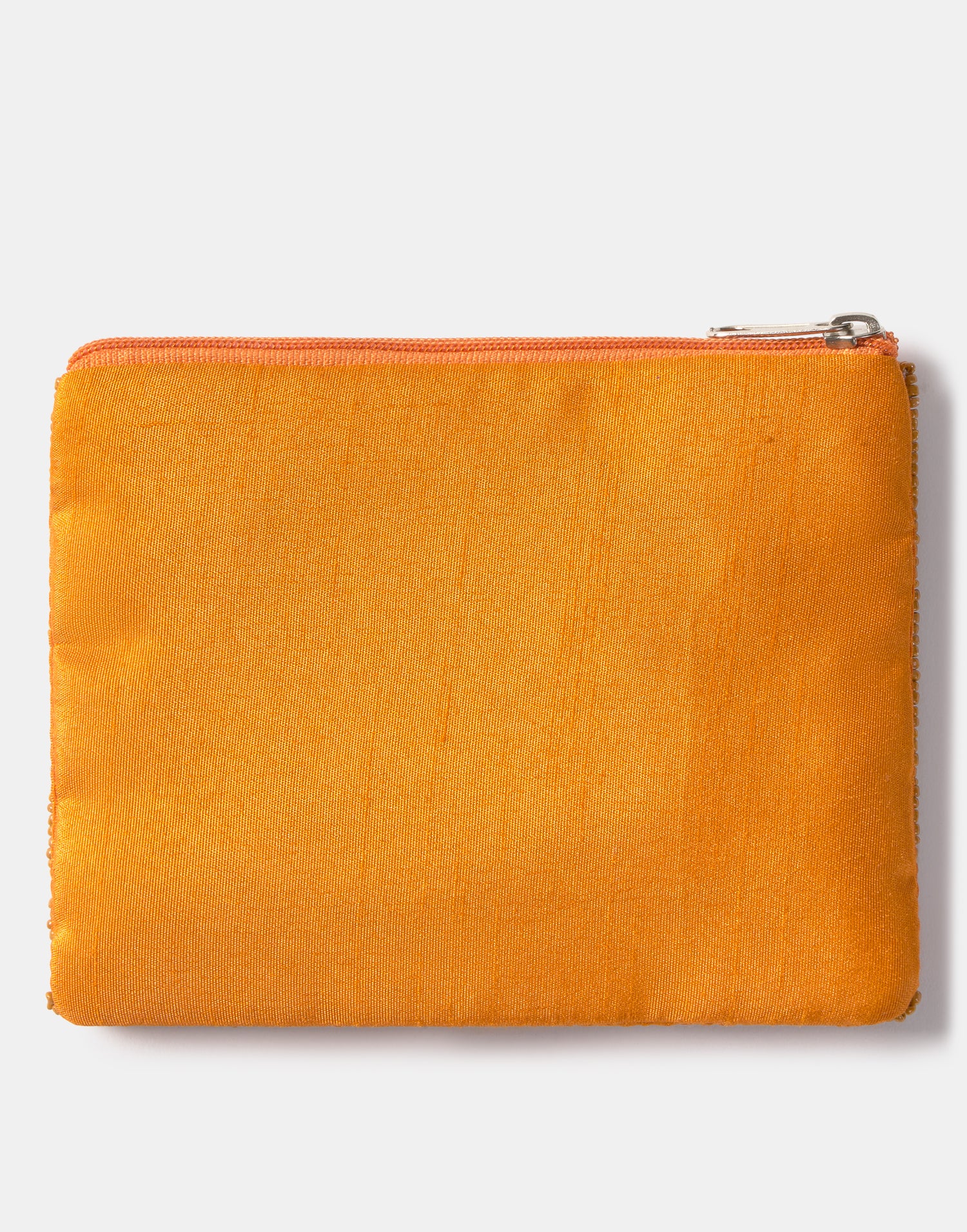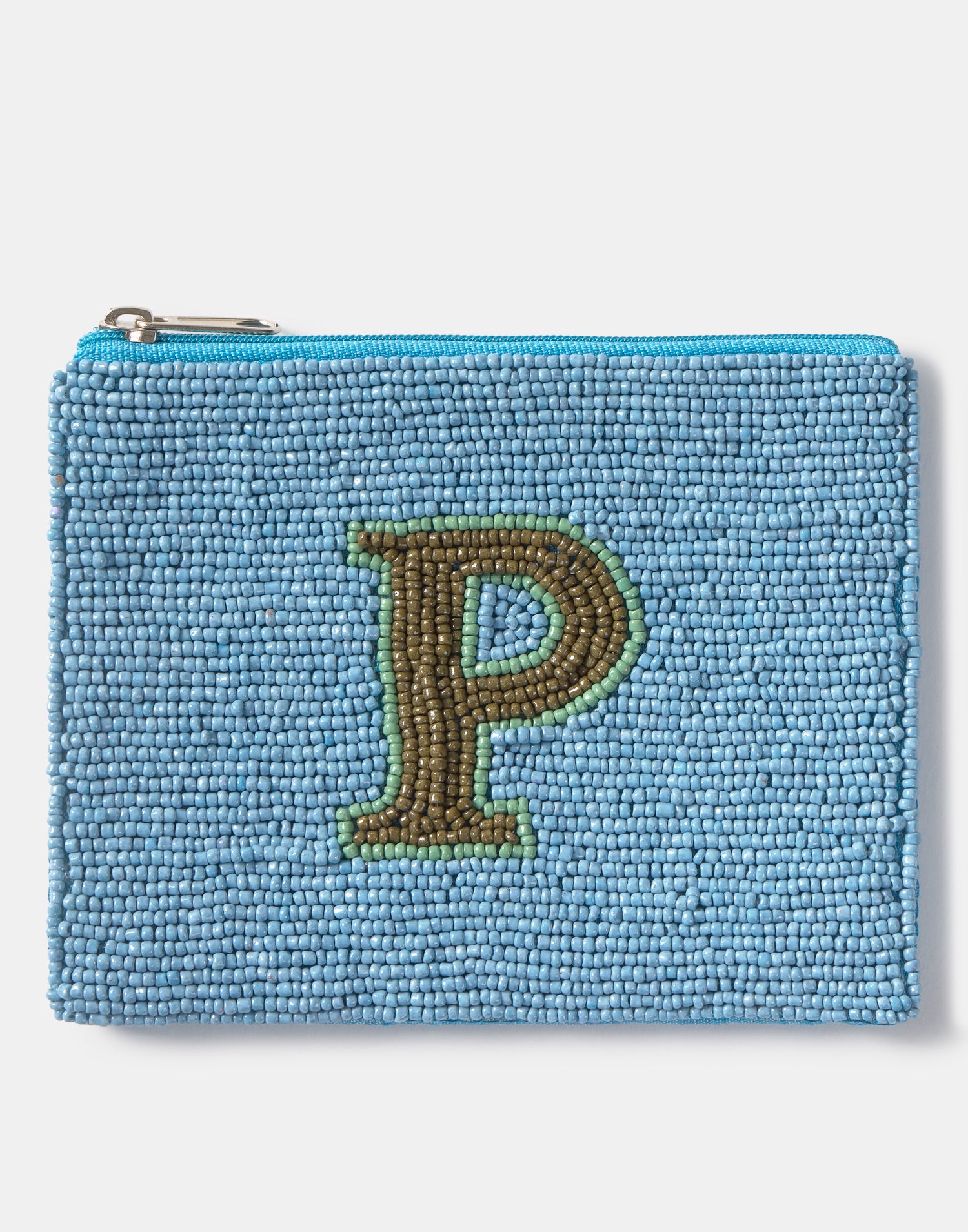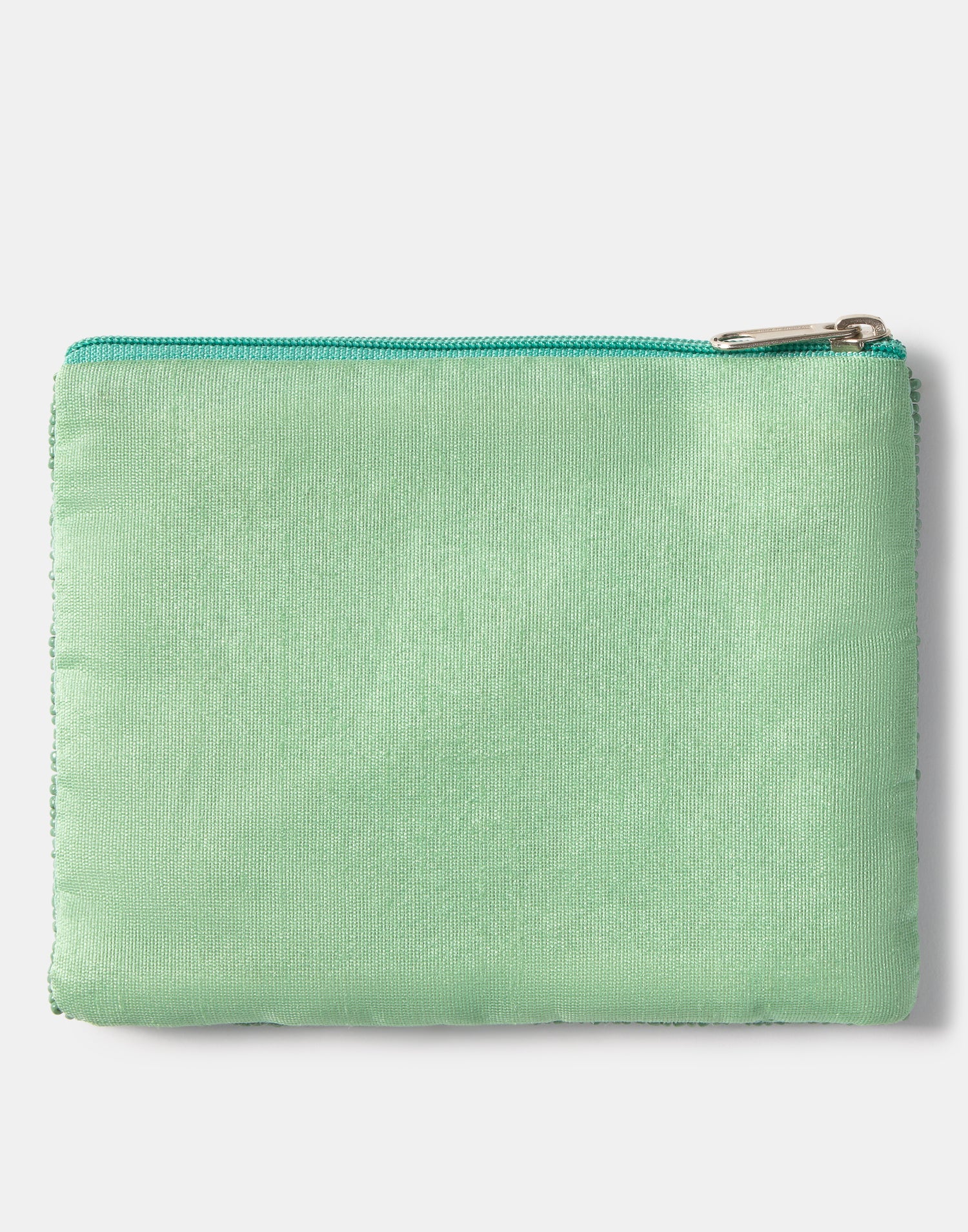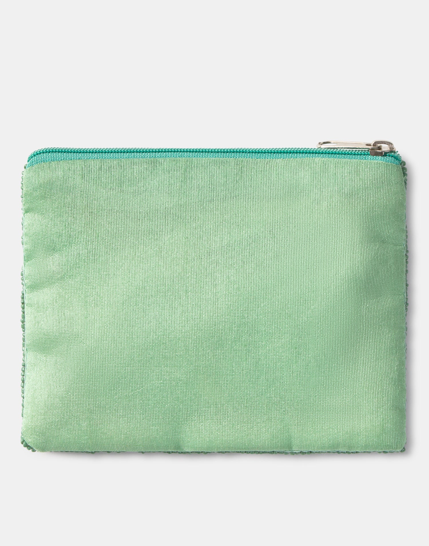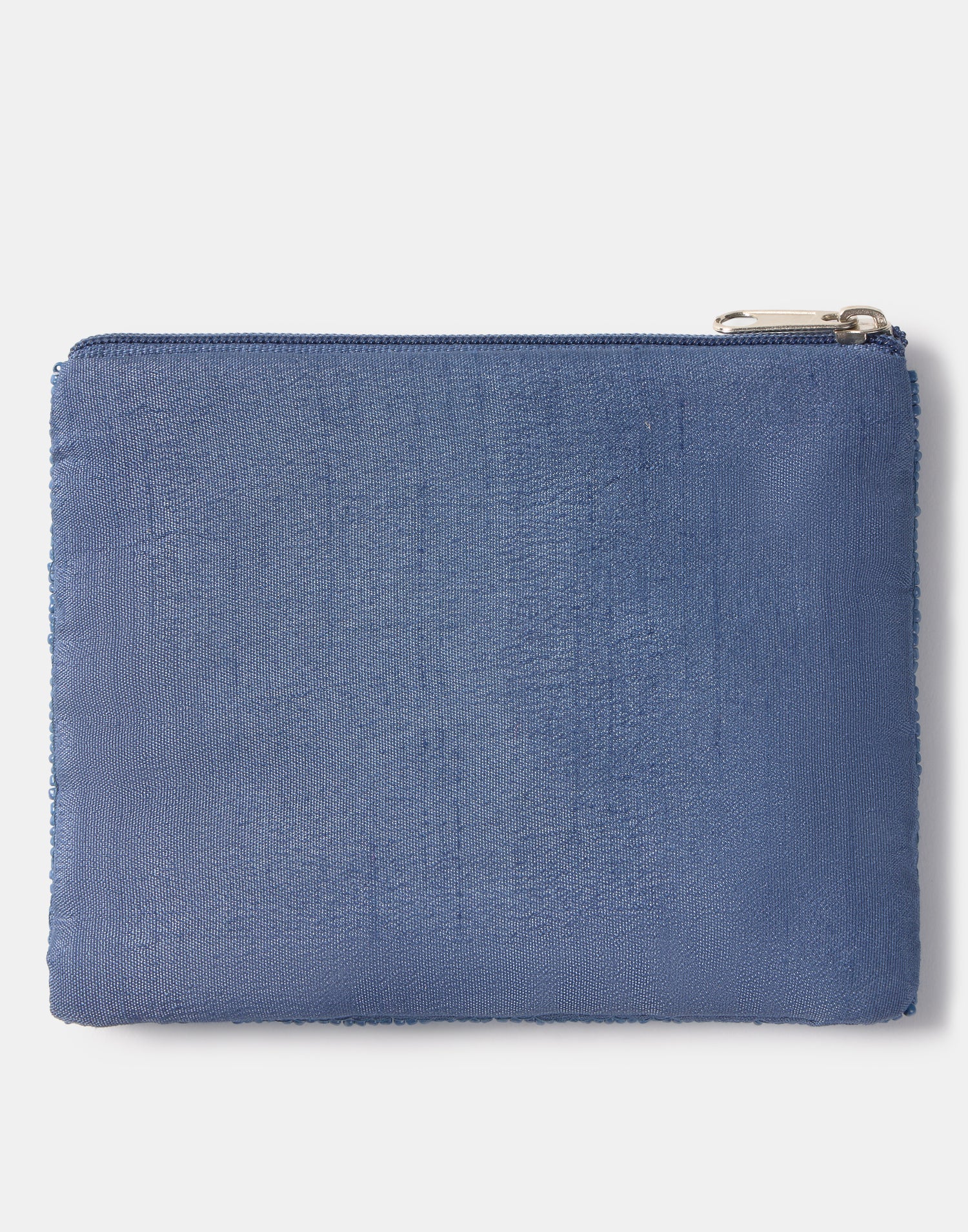 Piccolo astuccio multiuso con chiusura a zip superiore. Parte frontale decorata con iniziali realizzate con perline di vetro.