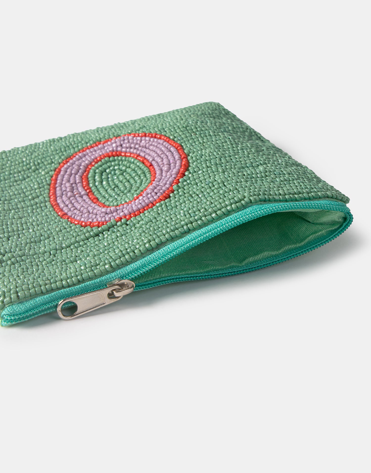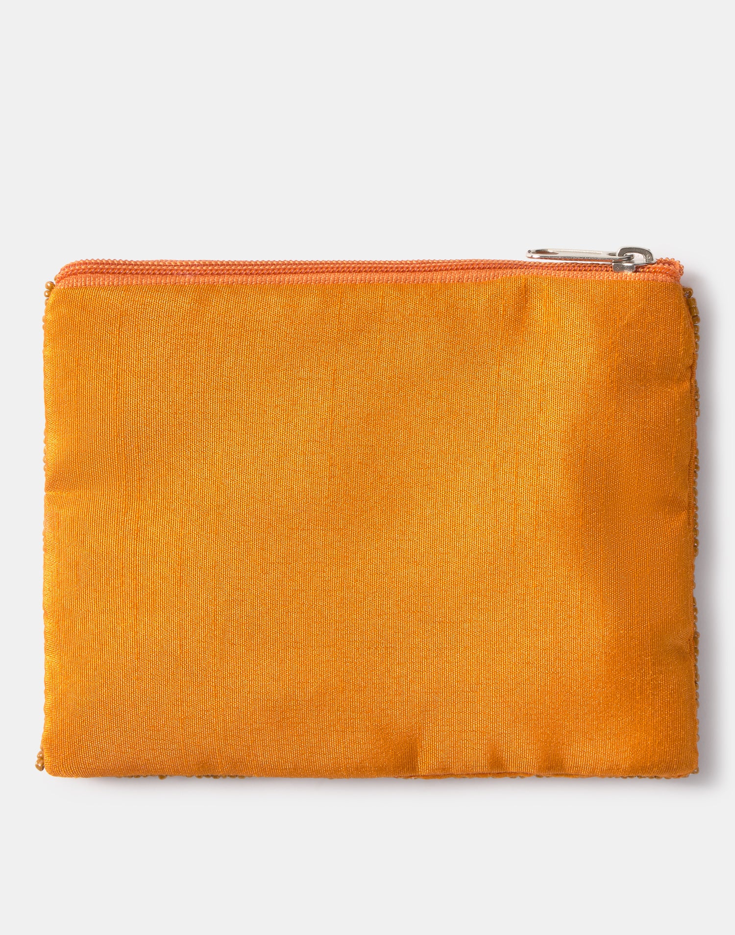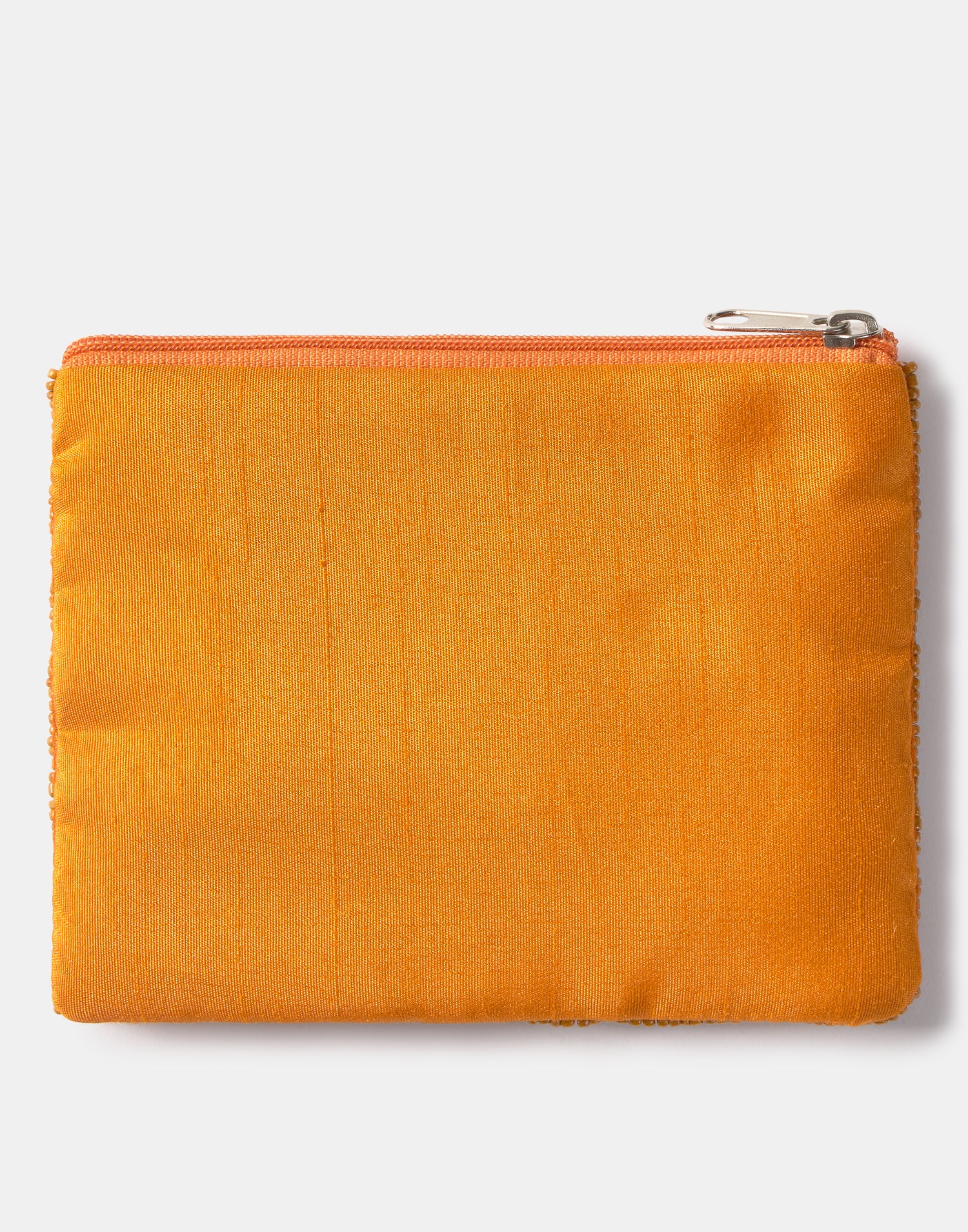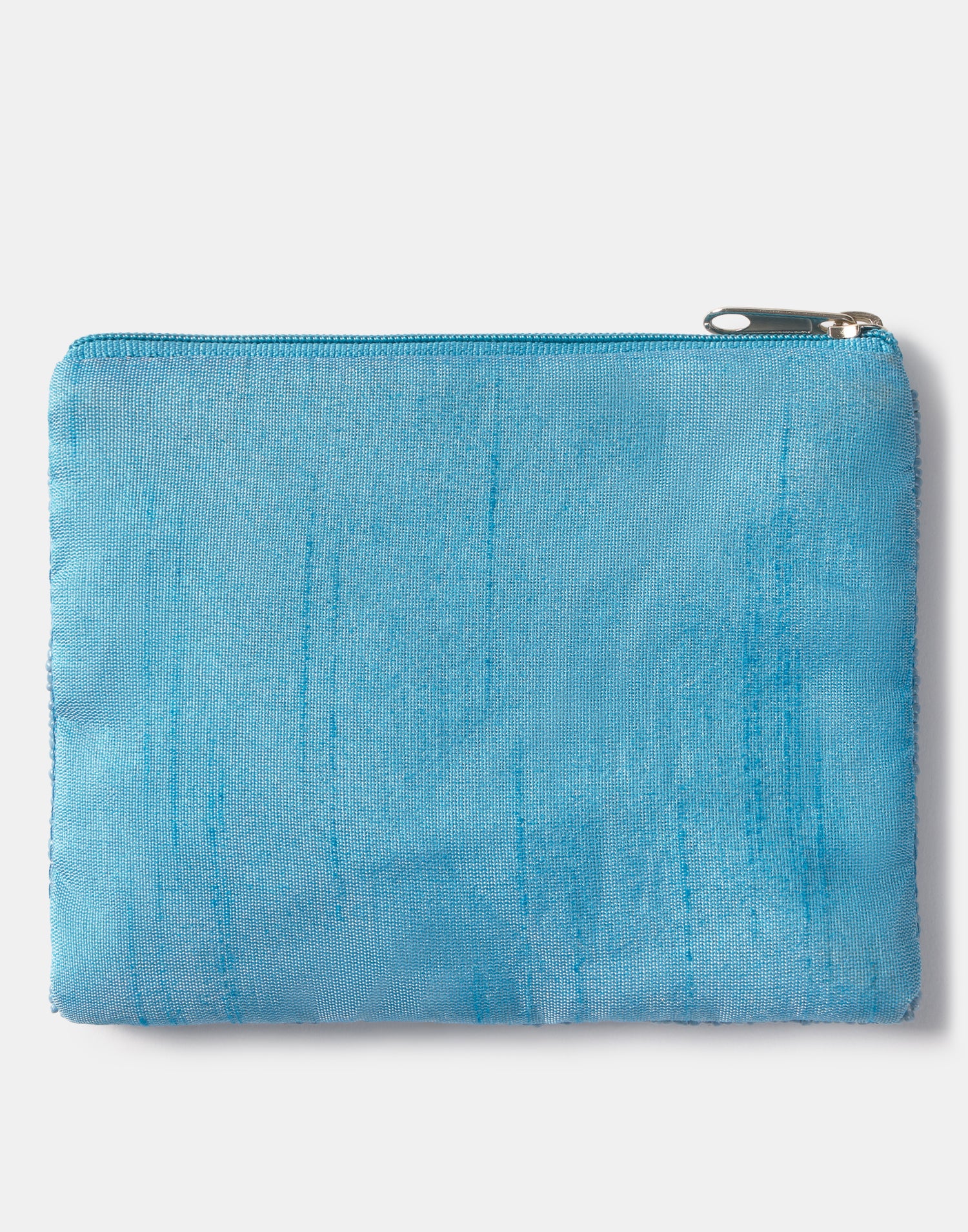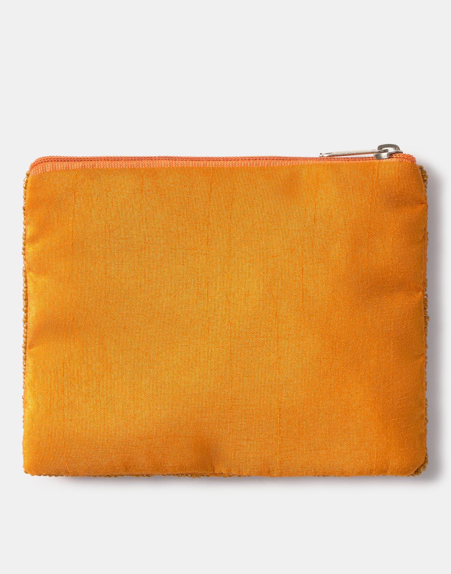 Piccolo astuccio multiuso con chiusura a zip superiore. Parte frontale decorata con iniziali realizzate con perline di vetro.