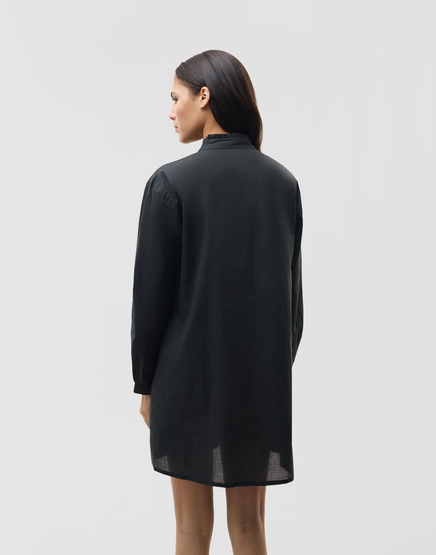 Abito corto con tasche laterali, maniche lunghe e pieghe sul davanti. Colletto alla coreana con dettaglio di volant. Chiusura frontale con bottoni.