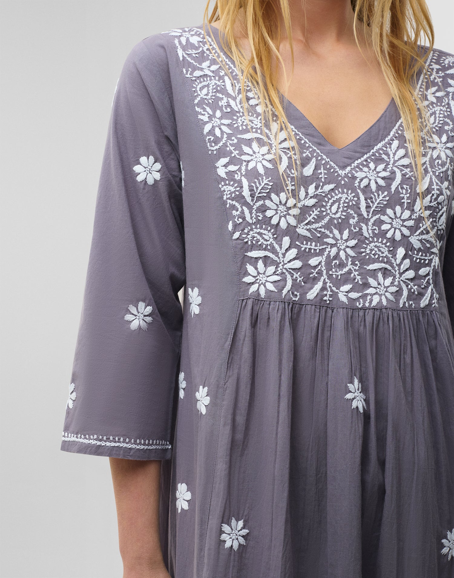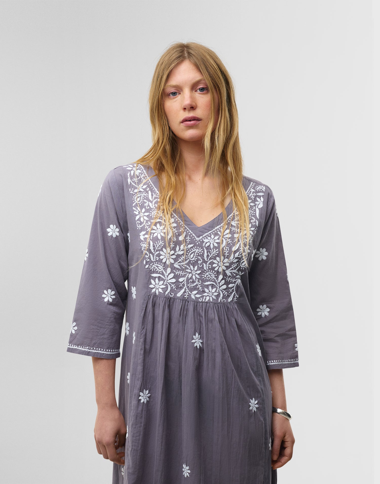 Abito midi in cotone con scollo a V e maniche sotto il gomito. Motivi floreali ricamati a contrasto.