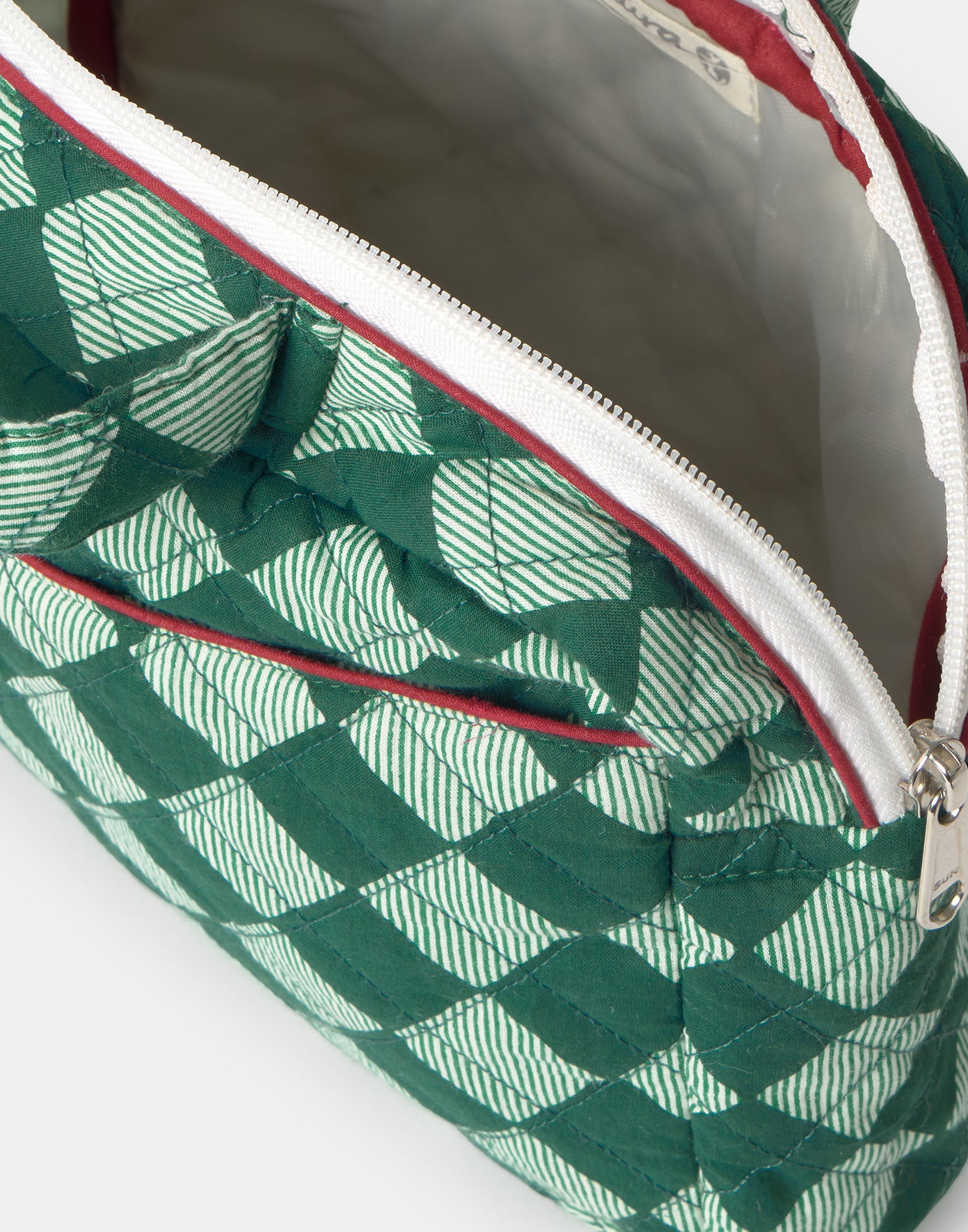 Beauty case stampato con fodera interna plastificata, chiusura a zip e doppio manico superiore. Rifinito con tasche esterne e dettaglio di bordino a contrasto.