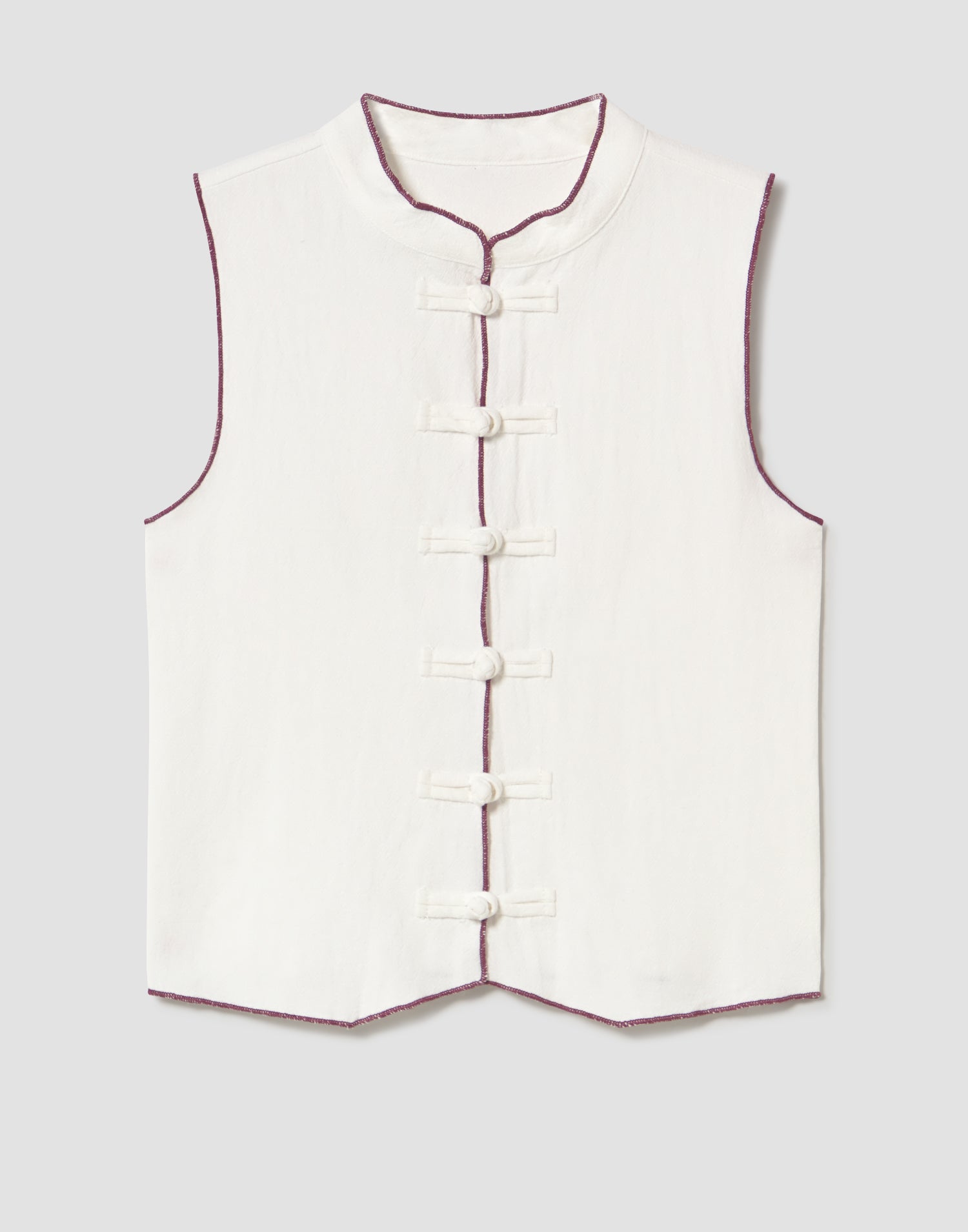 Top in misto lino, senza maniche e collo alla coreana. Chiusura frontale con alamari e dettaglio di bordo a contrasto.