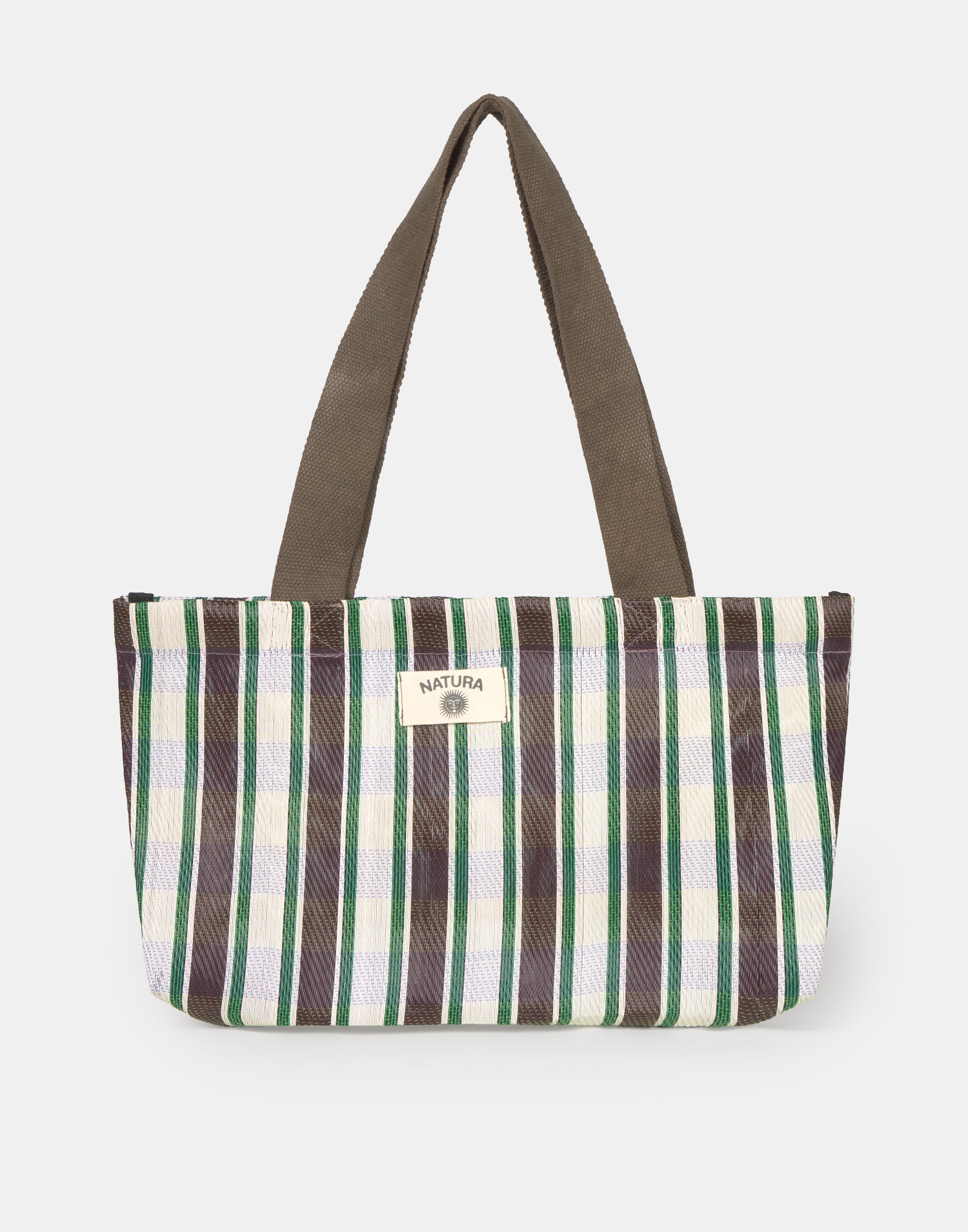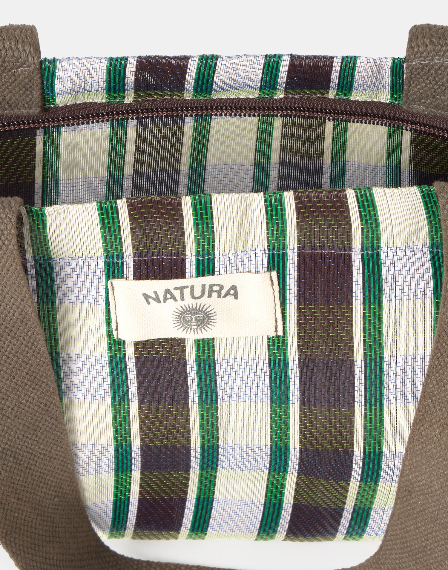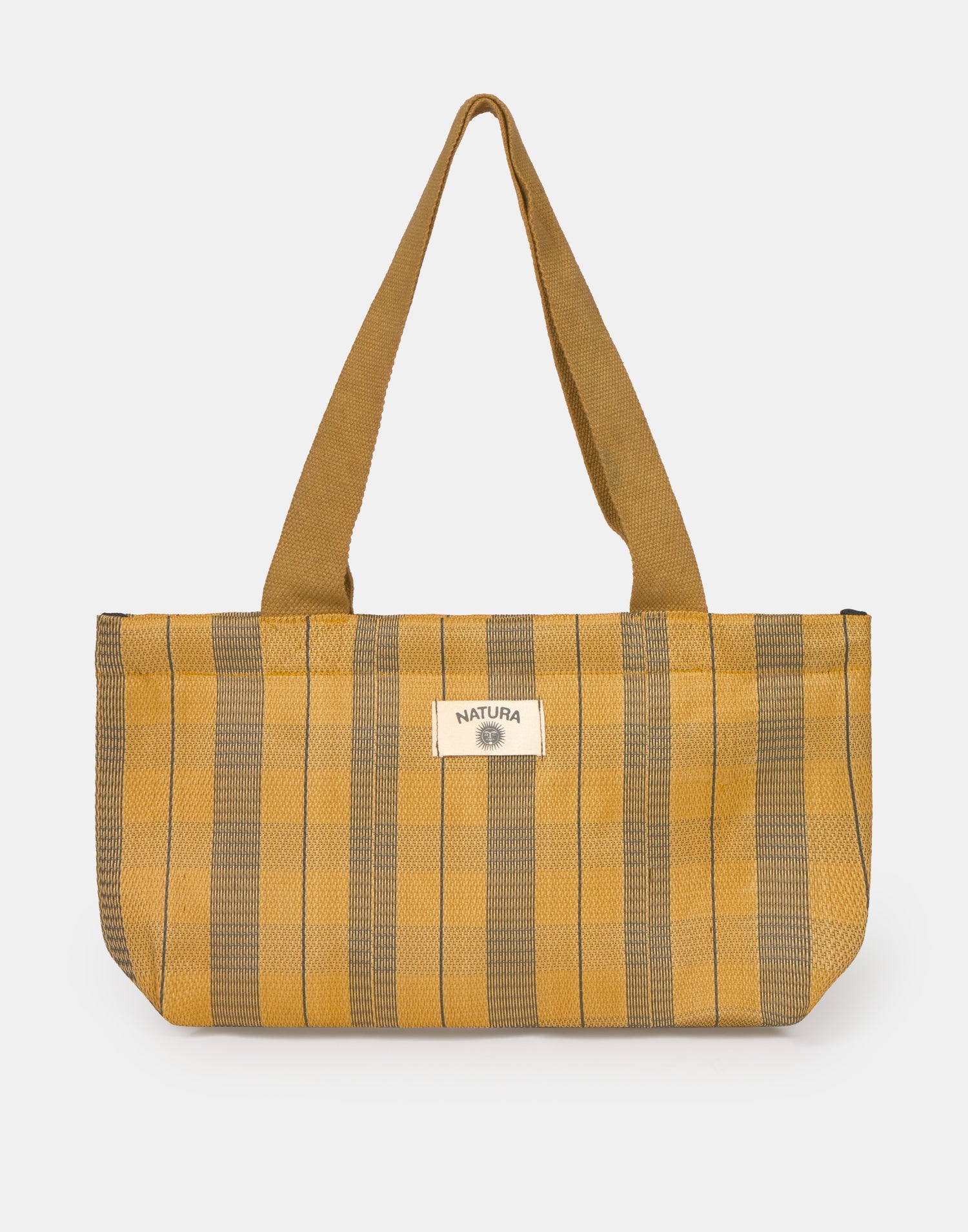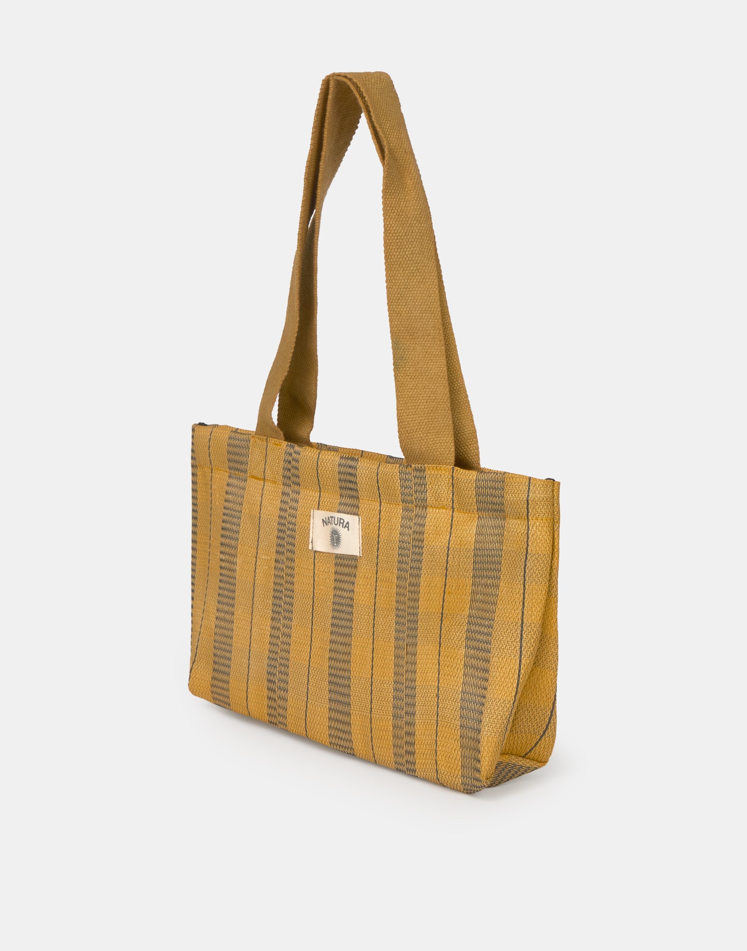 Borsa a righe tipo shopper, ispirata alle tradizionali borse indiane da stoccaggio. Con doppio manico per portarla a spalla e chiusura con cerniera.