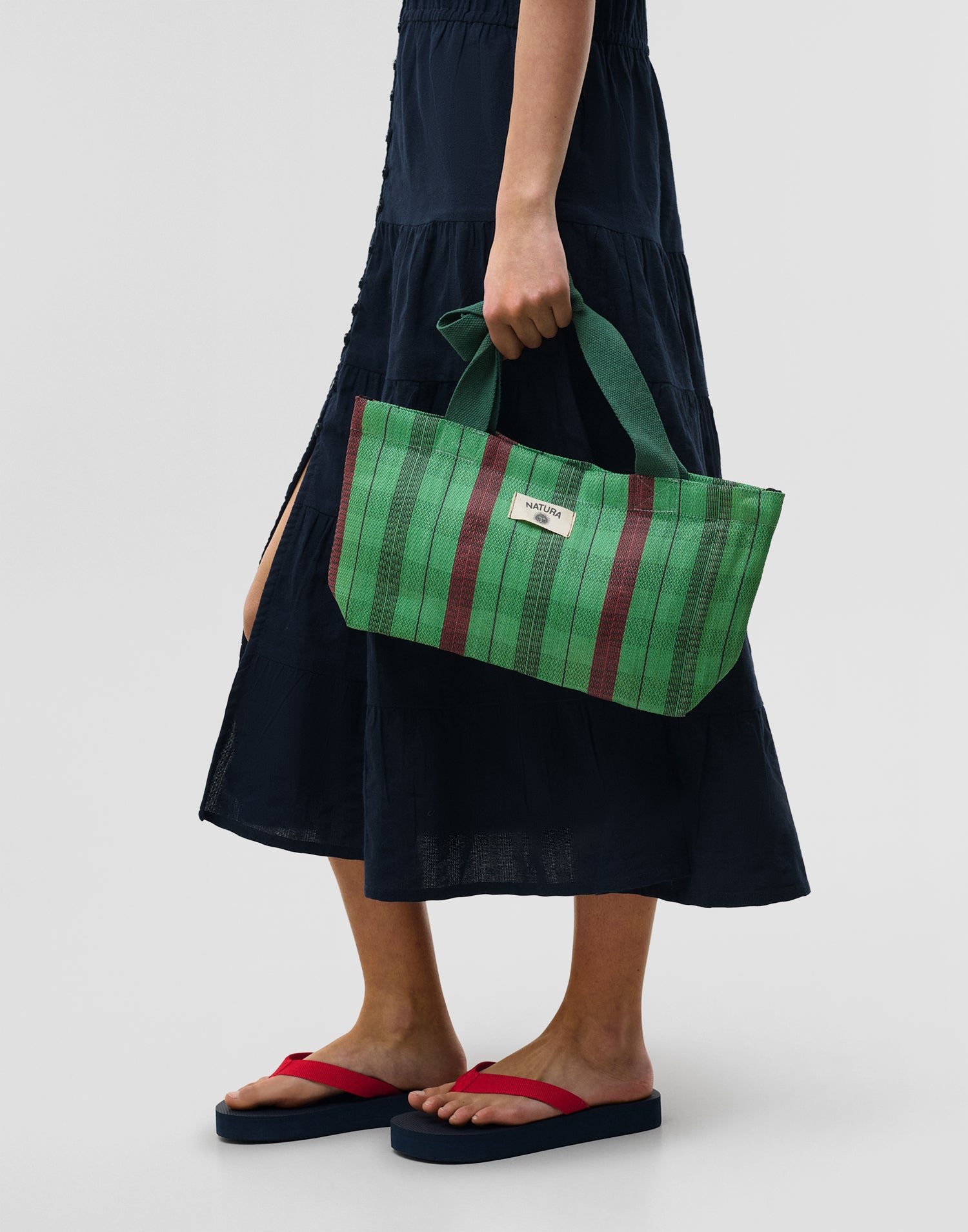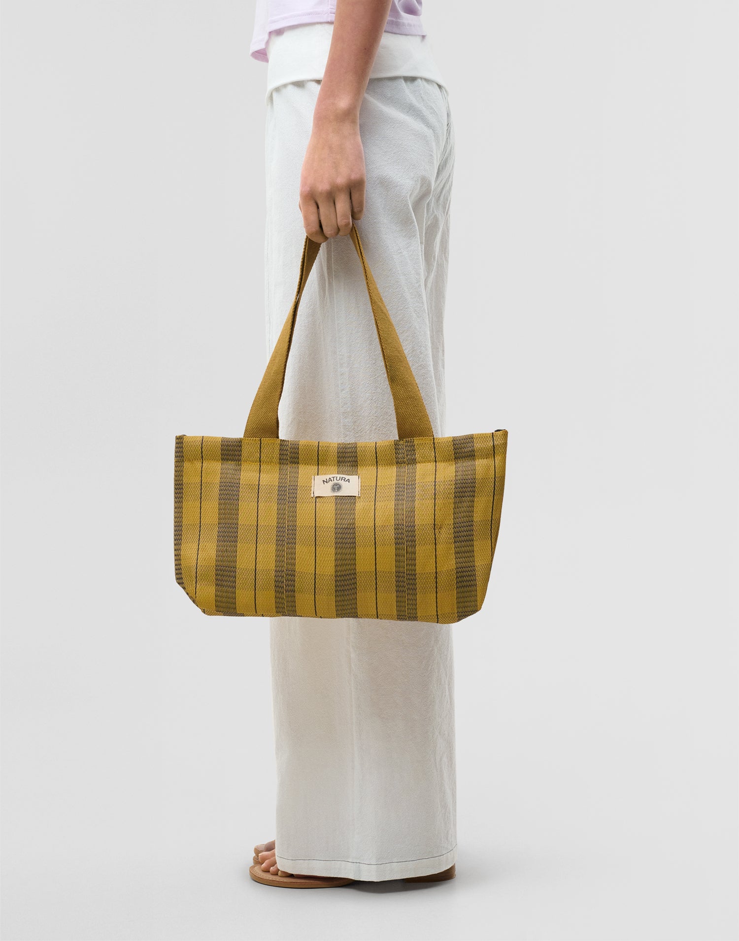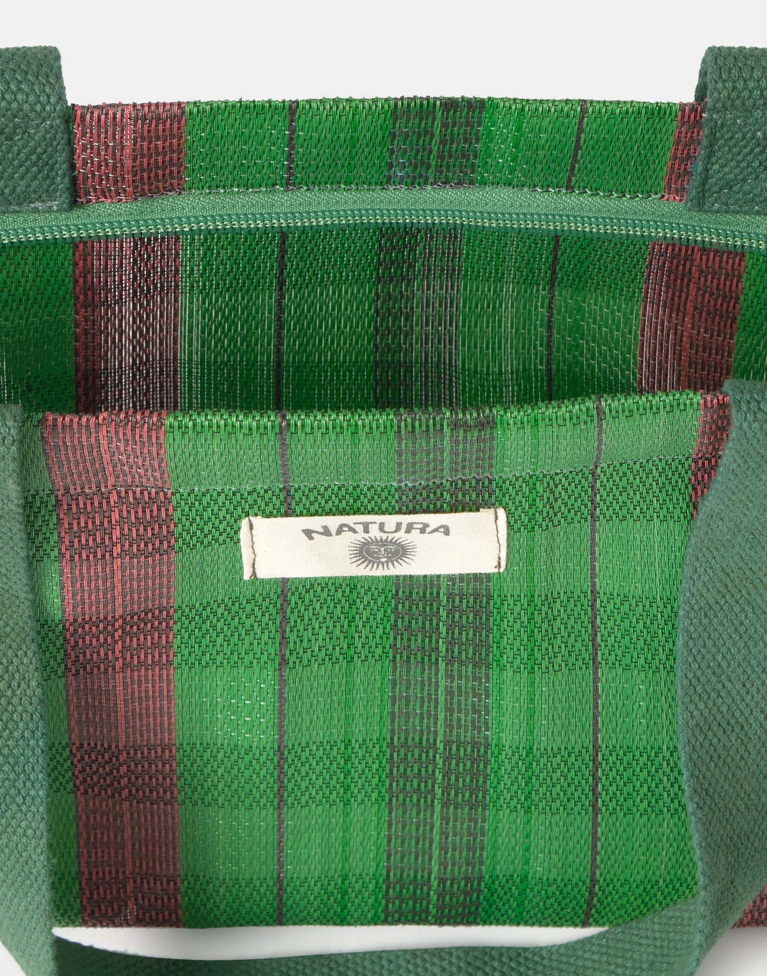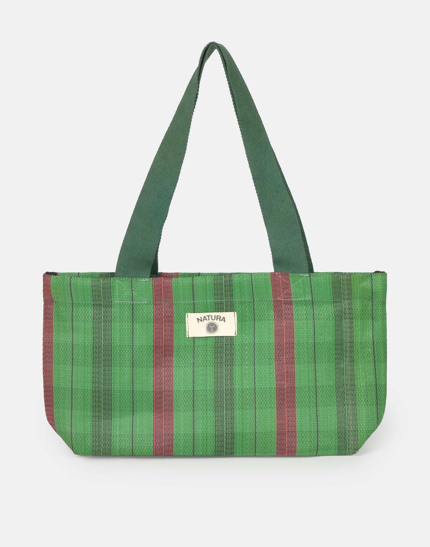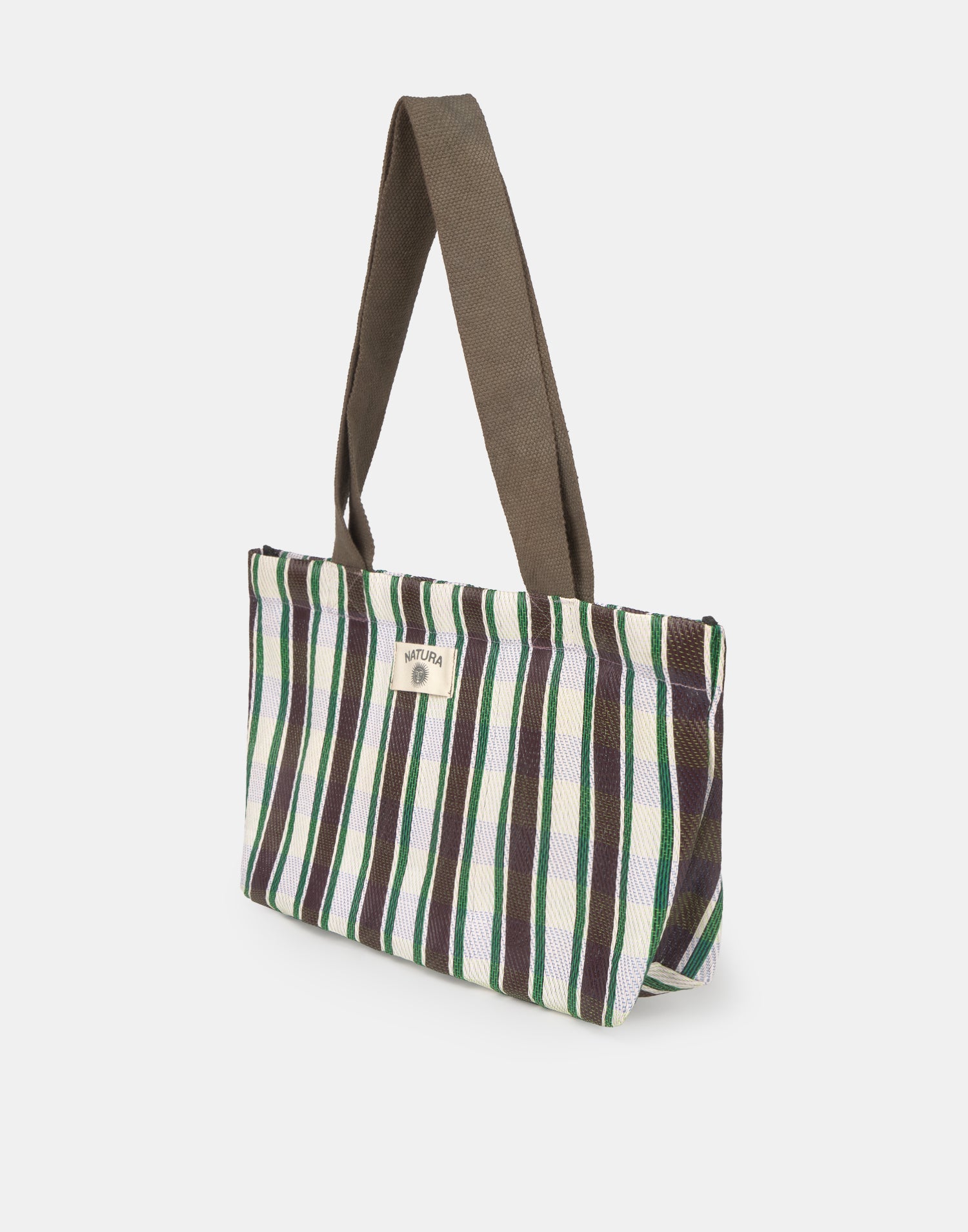 Borsa a righe tipo shopper, ispirata alle tradizionali borse indiane da stoccaggio. Con doppio manico per portarla a spalla e chiusura con cerniera.