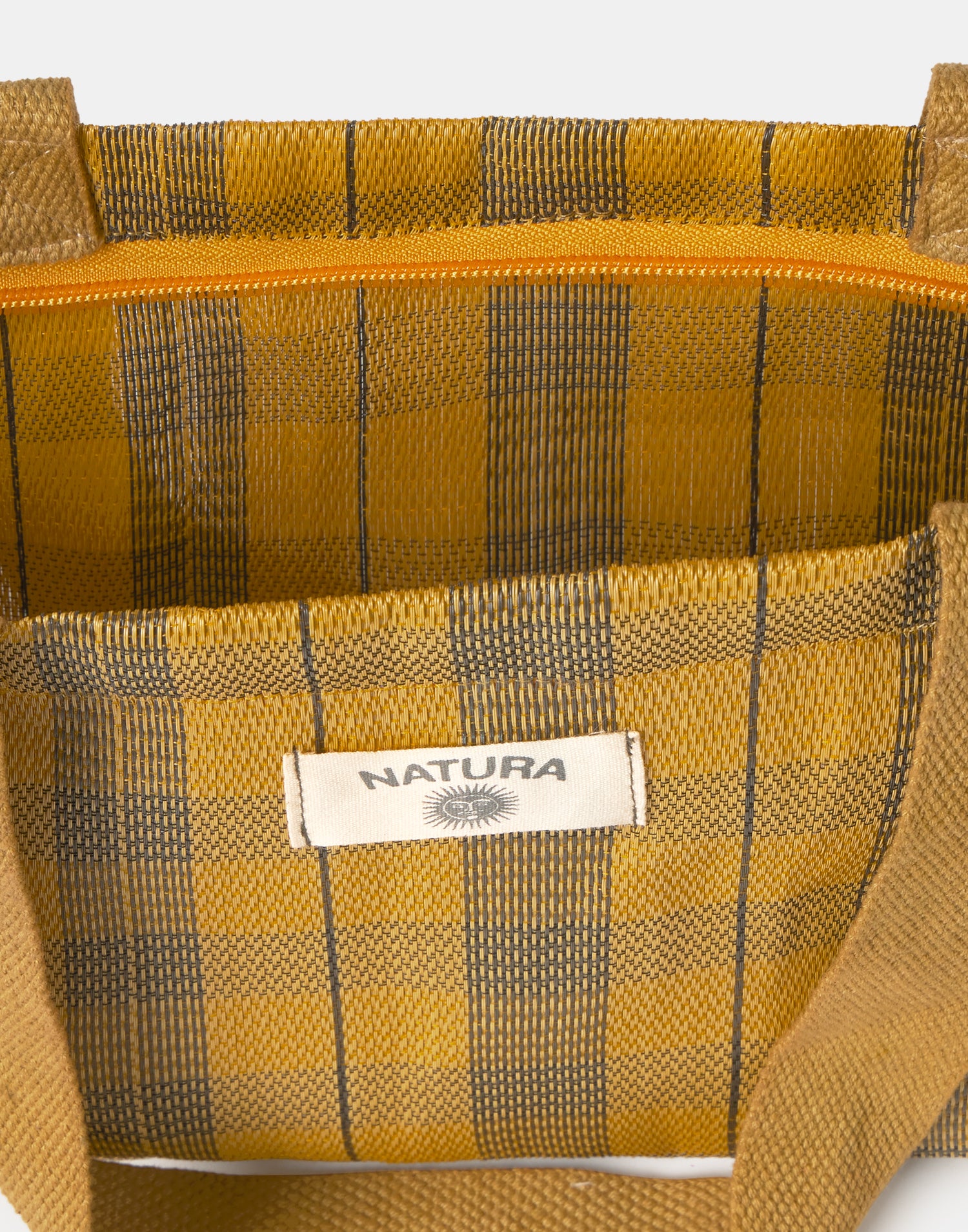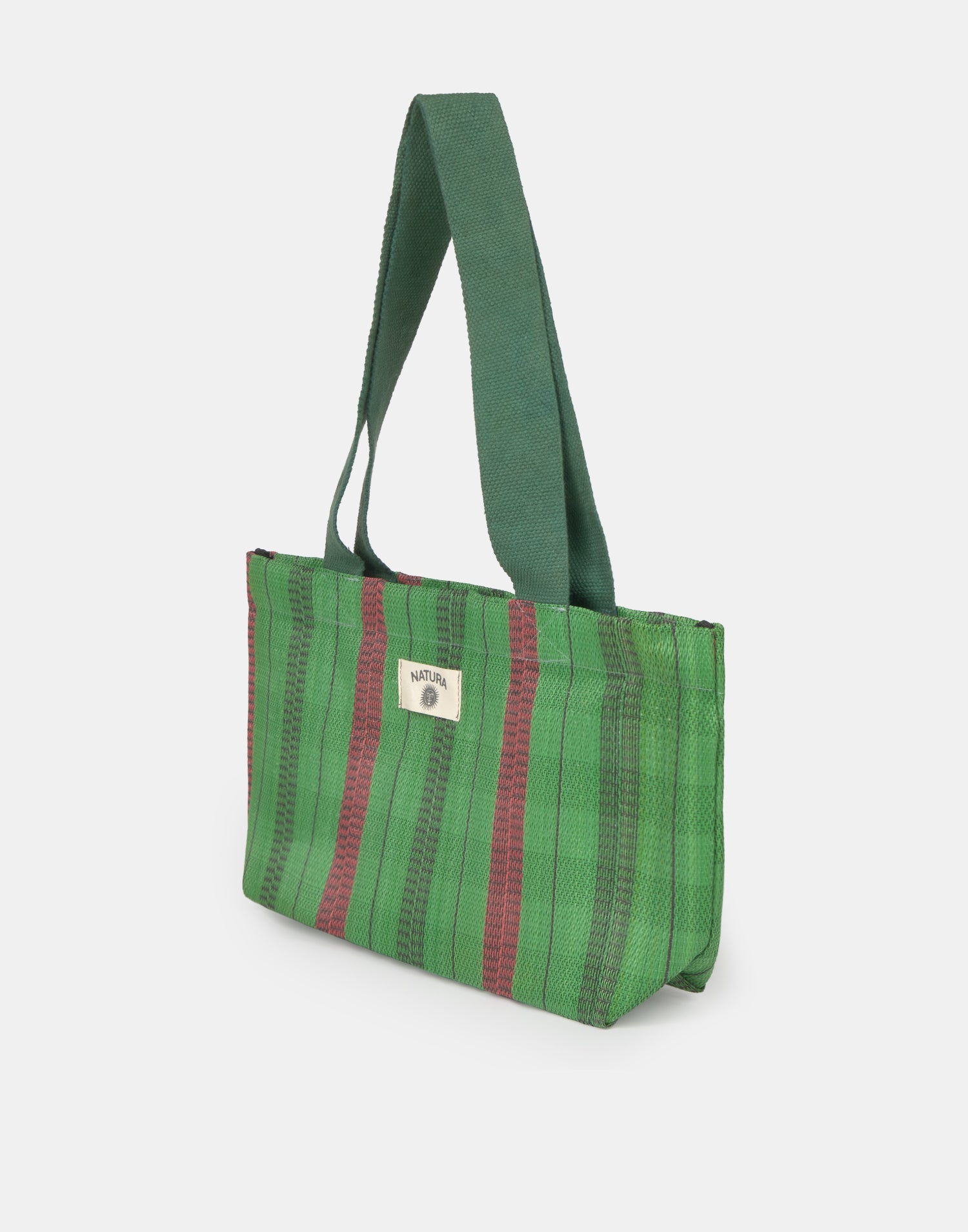 Questa borsa è realizzata con sacchi in polipropilene riciclato utilizzati in India per il trasporto del cemento. Possono quindi verificarsi variazioni nel tessuto e i colori possono trasferirsi su alcune superfici, ma fa parte di un design unico.