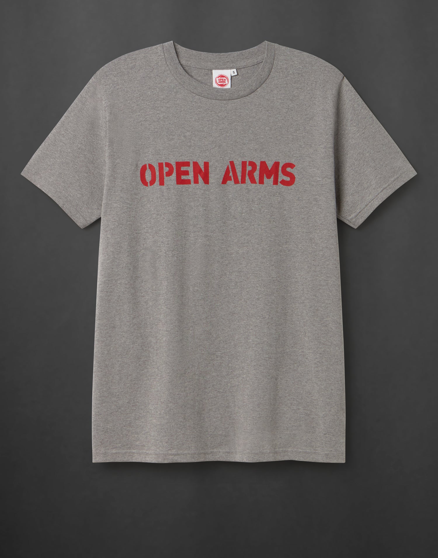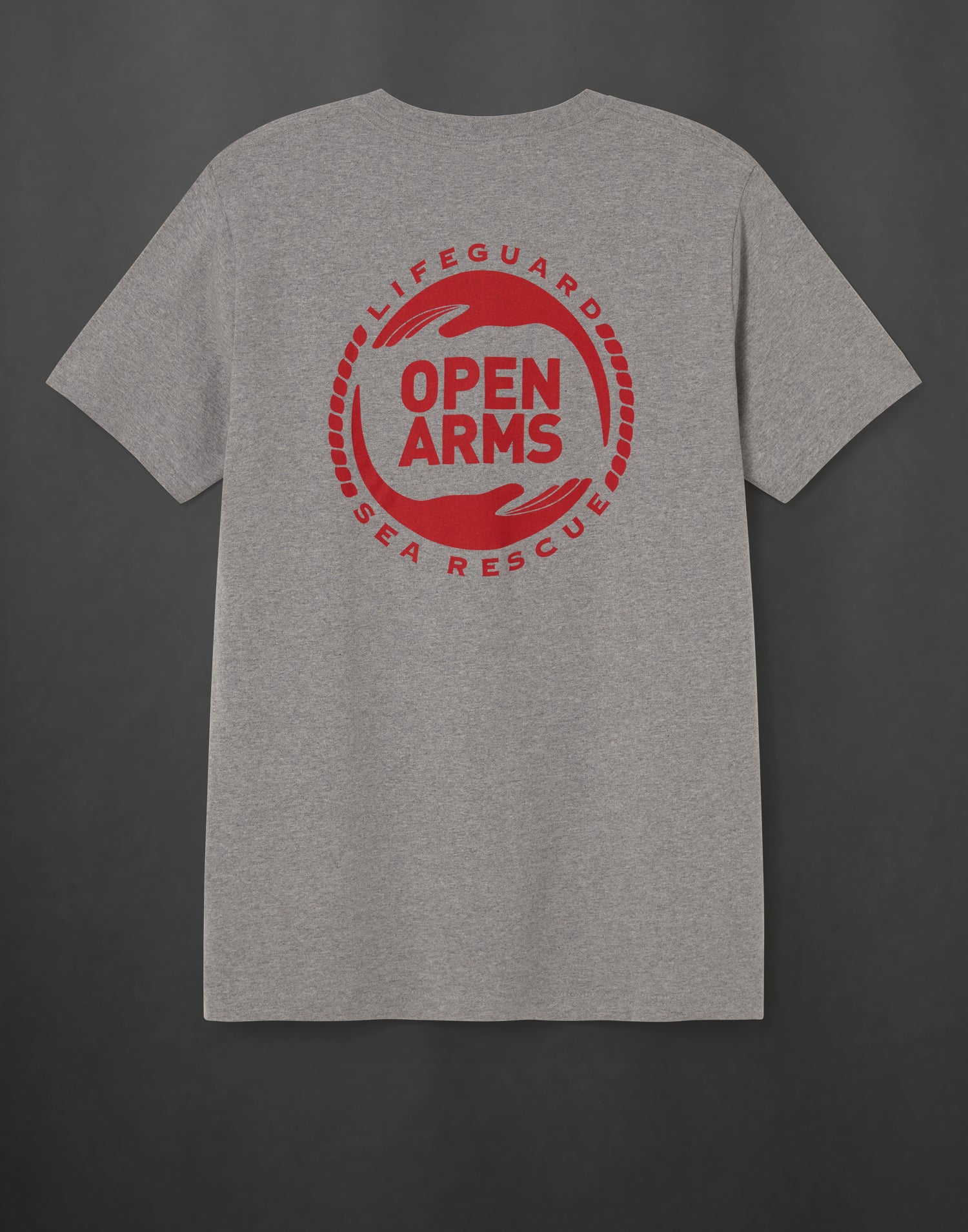 Maglietta unisex a maniche corte di colore grigio con la scritta Open Arms sulla parte anteriore e il logo in rosso sulla parte posteriore.
