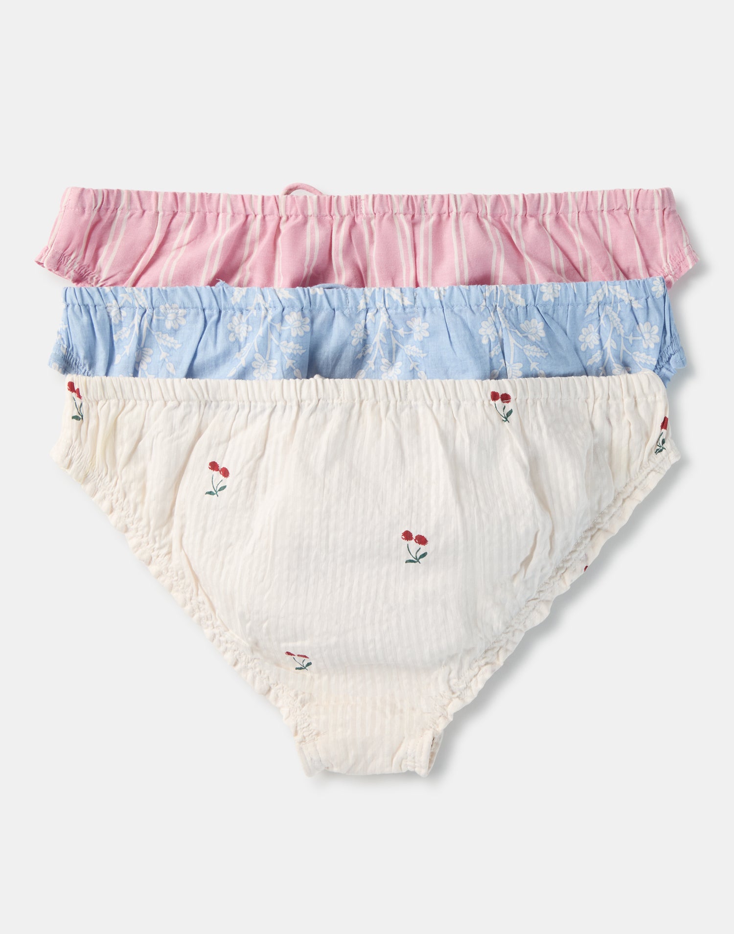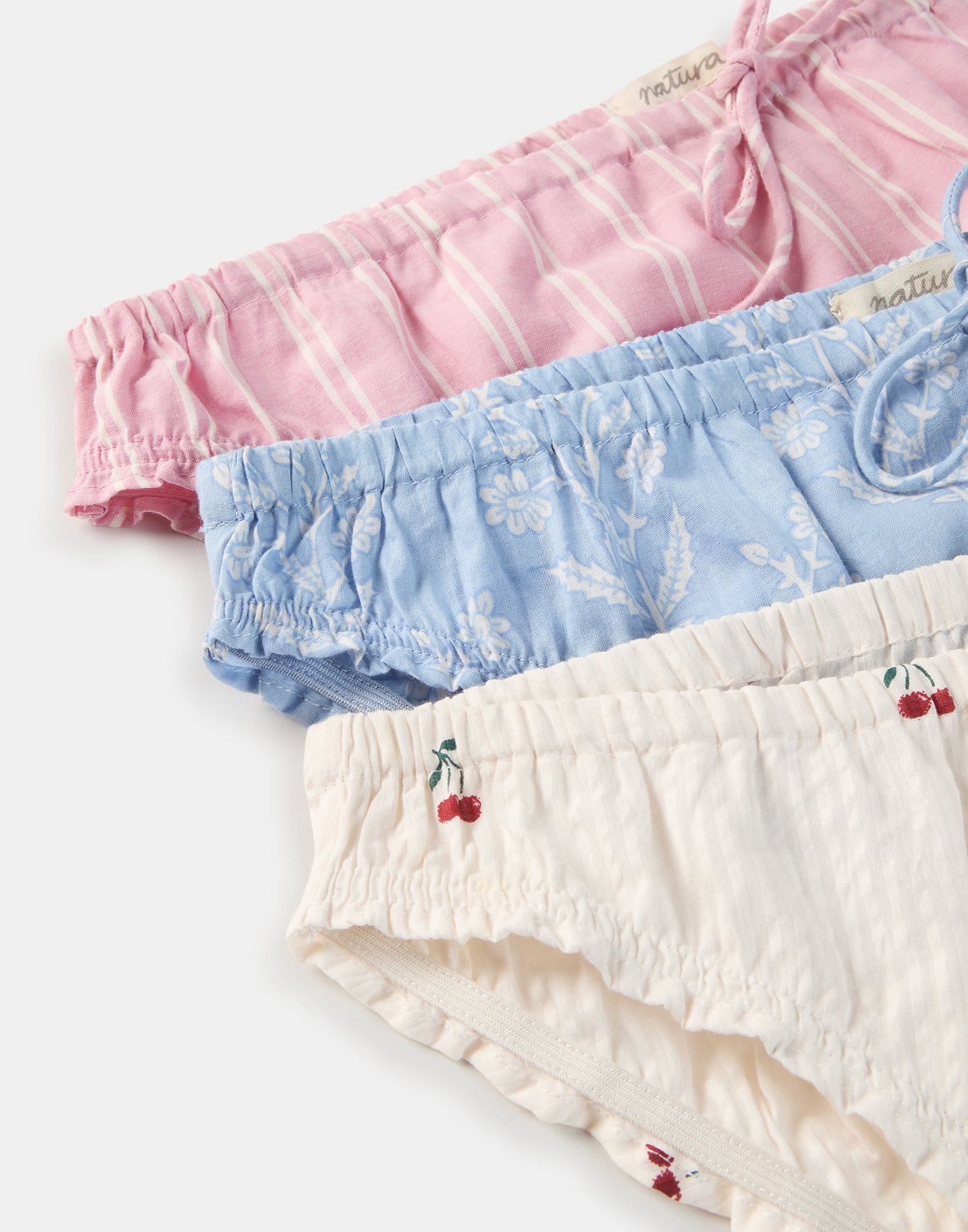 Pacco di 3 mutandine classiche in cotone, in diversi colori e fantasie. Vita elastica bassa.