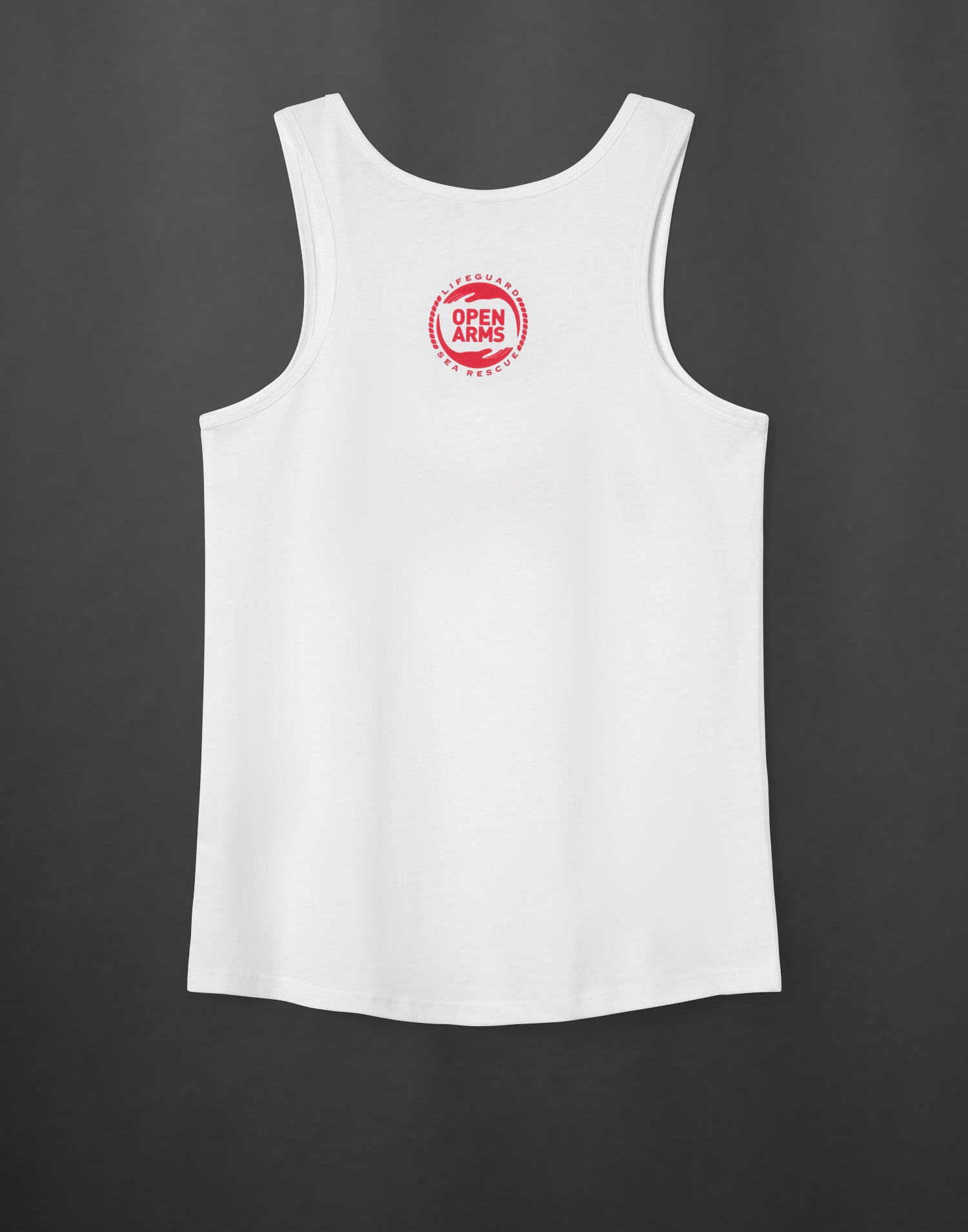 Maglietta da donna con bretelle di colore bianco con la scritta Open Arms sulla parte anteriore, e il logo dell’organizzazione in rosso sulla parte posteriore. Orlo scanalato sullo scollo e sul giromanica.