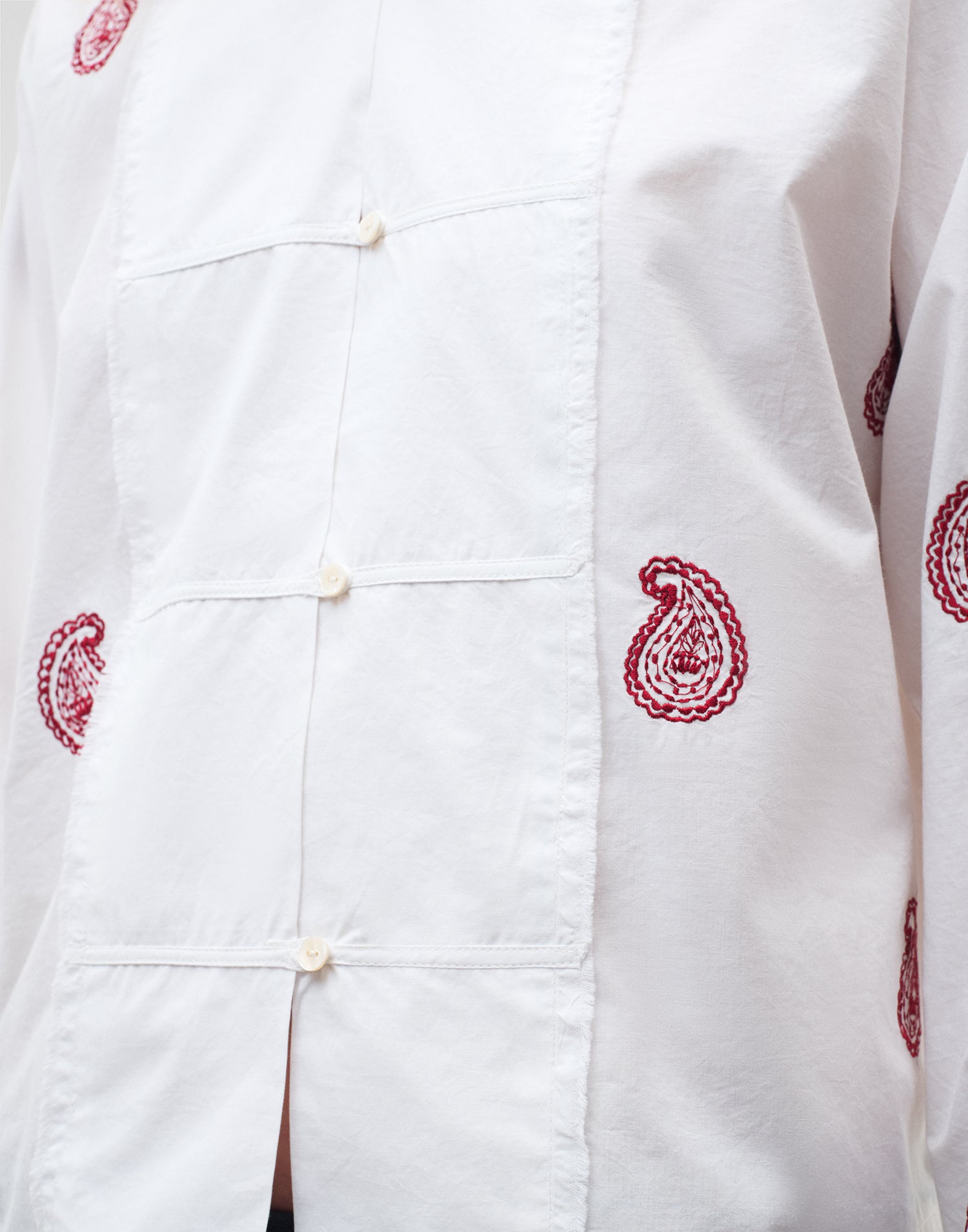 Blusa de manga larga y cuello redondo con cierre frontal de botones. Detalles bordados y terminaciones deshilachadas.